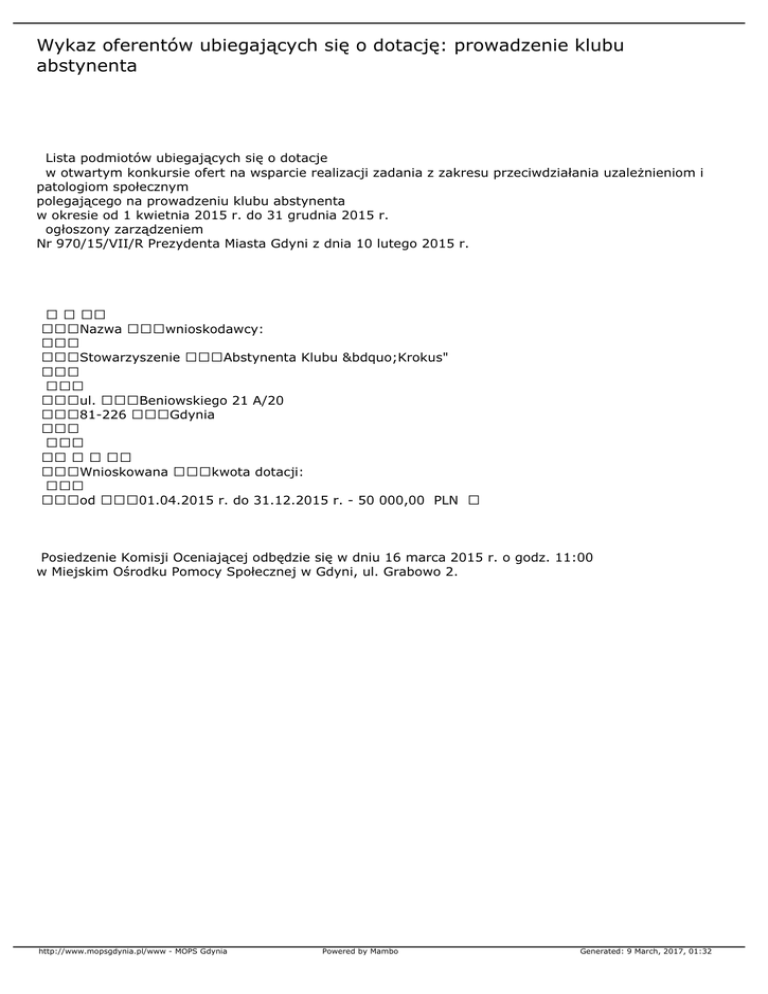 Wykaz oferentów ubiegających się o dotację: prowadzenie klubu abstynenta Lista podmiotów ubiegających się o dotacje w otwartym konkursie ofert na wsparcie realizacji zadania z zakresu przeciwdziałania uzależnieniom i patologiom społecznym polegającego na prowadzeniu klubu abstynenta w okresie od 1 kwietnia 2015 r. do 31 grudnia 2015 r. ogłoszony zarządzeniem Nr 970/15/VII/R Prezydenta Miasta Gdyni z dnia 10 lutego 2015 r. Nazwa wnioskodawcy: Stowarzyszenie Abstynenta Klubu „Krokus" ul. Beniowskiego 21 A/20 81-226 Gdynia Wnioskowana kwota dotacji: od 01.04.2015 r. do 31.12.2015 r. - 50 000,00 PLN Posiedzenie Komisji Oceniającej odbędzie się w dniu 16 marca 2015 r. o godz. 11:00 w Miejskim Ośrodku Pomocy Społecznej w Gdyni, ul. Grabowo 2. http://www.mopsgdynia.pl/www - MOPS Gdynia Powered by Mambo Generated: 9 March, 2017, 01:32