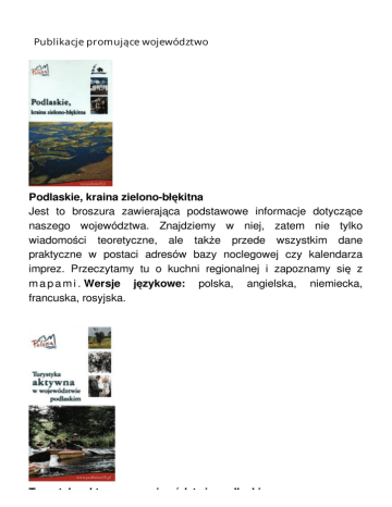 Publikacje promujące województwo Podlaskie, kraina zielono-błękitna Jest to broszura zawierająca podstawowe informacje dotyczące naszego województwa. Znajdziemy w niej, zatem nie tylko wiadomości teoretyczne, ale także przede wszystkim dane praktyczne w postaci adresów bazy noclegowej czy kalendarza imprez. Przeczytamy tu o kuchni regionalnej i zapoznamy się z m a p a m i . Wersje językowe: polska, angielska, niemiecka, francuska, rosyjska. Turystyka aktywna w województwie podlaskim Turystyka aktywna w województwie podlaskim Niewielkie zaludnienie terenów województwa podlaskiego w połączeniu z niezwykłą różnorodnością kulturową sprzyja rozwojowi turystyki aktywnej w naszym regionie. Najgęstsza sieć szlaków pieszych znajduje się w północnej części Suwalszczyzny, znakowane szlaki rowerowe skupiają się głównie w rejonie Puszczy Knyszyńskiej, a szczególną renomą wśród kajakarzy cieszy się szlak Czarnej Hańczy i Kanału Augustowskiego. Nie wolno też zapomnieć o Podlaskim Szlaku Bocianim, który ze względu na swoją unikalność od kilku lat przyciąga rokrocznie miłośników przyrody, tak z kraju, jak i z zagranicy. Wersje językowe: polska, angielska, niemiecka, francuska, rosyjska. Turystyka kulturowa w województwie podlaskim To broszura opisowa o kulturze naszego regionu. Znajdziemy w niej informacje o Szlaku Rękodzieła Ludowego, Szlaku Tatarskim, Szlaku religii i cerkwi Województwa Podlaskiego oraz Krainie Otwartych Okiennic. Podlasie, bowiem to jeden z najciekawszych pod względem kulturowym, wyznaniowym i obyczajowym region Polski, gdzie obok siebie żyją i mieszkają Polacy, Białorusini, Litwini, Żydzi i muzułmańscy Tatarzy. Wersje językowe: polska, angielska, niemiecka, francuska, rosyjska. Płyta CD Prezentacja multimedialna walorów turystycznych, kulturowych i przyrodniczych województwa podlaskiego. Wersje językowe: polska, angielska, niemiecka. Województwo Podlaskie zaprasza Informator turystyczny 2003 Jeśli szukamy praktycznych informacji o zabytkach, kulturze, ochronie przyrody, szlakach turystycznych, rekreacji, obsłudze ruchu turystycznego i bazie noclegowej Województwa Podlaskiego to najlepsza baza danych o regionie. Informator składa się z części opisowej i użytkowej, co ułatwia szybkie pozyskanie niezbędnych informacji. Wydawcą jest Agencja „TD” Wydawnictwo Turystyczne przy współpracy Departamentu Turystyki i Sportu Urzędu Marszałkowskiego. Wersje językowe: polska, angielska. Turystyka aktywna w województwie podlaskim Publikacja informuje o tym, jak można aktywnie spędzić wolny czas na terenie Podlasia. Turystyka kulturowa, kajakowa, rowerowa, pod żaglami, konna czy piesza, to tylko przykłady propozycji aktywnego wypoczynku. Oczywiście jest ich więcej. Bogactwo krajobrazu zachęca do uprawiania sportów wodnych i umiłowanego przez panów wędkarstwa. Wersje językowe: polska, angielska, niemiecka, francuska, włoska. Cztery pory roku Cztery pory roku i cztery formy sezonowego odkrywania uroków Podlasia. Wiosenne podglądanie ptaków na biebrzańskich bagnach, letnie spływy kajakowe i kąpiele w jeziorach, jesienne zbieranie grzybów oraz zimowe kuligi po Białowieskim Parku Narodowym czy Parku Krajobrazowym Puszczy Knyszyńskiej kuszą turystów swoimi atrakcjami. Wersje językowe: angielska, niemiecka, francuska, włoska. The four seasons In the Podlaski province Jak sugeruje tytuł, „The four seasons in the Podlaski province” to ulotka, która zawiera podstawowe informacje na temat uroków Podlasia. Znajdziemy w niej dane o zabytkach, kulturze i przyrodzie regionu. Ze względu na adresatów zagranicznych, informacje w niej zawarte skoncentrowane są na walorach, jakie oferuje województwo w okresie wiosennym i letnim. Obcokrajowcy, którzy lubią poznawać inne kultury, na pewno będą usatysfakcjonowani wizytą w naszym regi oni e. Wersje językowe: angielska, niemiecka, rosyjska, francuska, włoska.