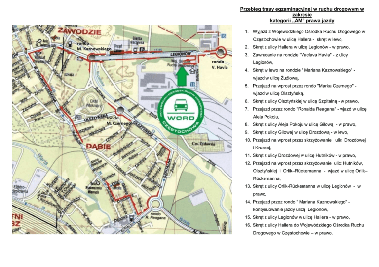 Przebieg trasy egzaminacyjnej w ruchu drogowym w zakresie kategorii „AM” prawa jazdy 1. Wyjazd z Wojewódzkiego Ośrodka Ruchu Drogowego w Częstochowie w ulicę Hallera - skręt w lewo, 2. Skręt z ulicy Hallera w ulicę Legionów - w prawo, 3. Zawracanie na rondzie "Vaclava Havla" - z ulicy Legionów, 4. Skręt w lewo na rondzie " Mariana Kaznowskiego" wjazd w ulicę Żużlową, 5. Przejazd na wprost przez rondo "Marka Czernego" wjazd w ulicę Olsztyńską, 6. Skręt z ulicy Olsztyńskiej w ulicę Szpitalną - w prawo, 7. Przejazd przez rondo "Ronalda Reagana" - wjazd w ulicę Aleja Pokoju, 8. Skręt z ulicy Aleja Pokoju w ulicę Gilową - w prawo, 9. Skręt z ulicy Gilowej w ulicę Drozdową - w lewo, 10. Przejazd na wprost przez skrzyżowanie ulic Drozdowej i Kruczej, 11. Skręt z ulicy Drozdowej w ulicę Hutników - w prawo, 12. Przejazd na wprost przez skrzyżowanie ulic: Hutników, Olsztyńskiej i Orlik–Rückemanna - wjazd w ulicę Orlik– Rückemanna, 13. Skręt z ulicy Orlik-Rückemanna w ulicę Legionów - w prawo, 14. Przejazd przez rondo " Mariana Kaznowskiego" kontynuowanie jazdy ulicą Legionów, 15. Skręt z ulicy Legionów w ulicę Hallera - w prawo, 16. Skręt z ulicy Hallera do Wojewódzkiego Ośrodka Ruchu Drogowego w Częstochowie – w prawo.