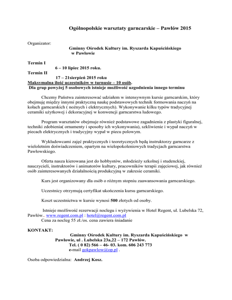 Ogólnopolskie warsztaty garncarskie – Pawłów 2015 Organizator: Gminny Ośrodek Kultury im. Ryszarda Kapuścińskiego w Pawłowie Termin I 6 – 10 lipiec 2015 roku. Termin II 17 – 21sierpień 2015 roku Maksymalna ilość uczestników w turnusie – 10 osób. Dla grup powyżej 5 osobowych istnieje możliwość uzgodnienia innego terminu Chcemy Państwa zainteresować udziałem w intensywnym kursie garncarskim, który obejmuję między innymi praktyczną naukę podstawowych technik formowania naczyń na kołach garncarskich ( nożnych i elektrycznych). Wykonywanie kilku typów tradycyjnej ceramiki użytkowej i dekoracyjnej w konwencji garncarstwa ludowego. Program warsztatów obejmuje również podstawowe zagadnienia z plastyki figuralnej, techniki zdobienia( ornamenty i sposoby ich wykonywania), szkliwienie i wypał naczyń w piecach elektrycznych i tradycyjny wypał w piecu polowym. Wykładowcami zajęć praktycznych i teoretycznych będą instruktorzy garncarze z wieloletnim doświadczeniem, opartym na wielopokoleniowych tradycjach garncarstwa Pawłowskiego. Oferta nasza kierowana jest do hobbystów, młodzieży szkolnej i studenckiej, nauczycieli, instruktorów i animatorów kultury, pracowników terapii zajęciowej, jak również osób zainteresowanych działalnością produkcyjną w zakresie ceramiki. Kurs jest organizowany dla osób o różnym stopniu zaawansowania garncarskiego. Uczestnicy otrzymują certyfikat ukończenia kursu garncarskiego. Koszt uczestnictwa w kursie wynosi 500 złotych od osoby. Istnieje możliwość rezerwacji noclegu i wyżywienia w Hotel Regent, ul. Lubelska 72, Pawłów.. www.regent.com.pl : [email protected] Cena za nocleg 55 zł./os. cena zawiera śniadanie KONTAKT: Gminny Ośrodek Kultury im. Ryszarda Kapuścińskiego w Pawłowie, ul . Lubelska 23a,22 – 172 Pawłów. Tel. ( 0 82) 566 – 46- 03. kom. 606 243 773 e-mail [email protected] . Osoba odpowiedzialna: Andrzej Kosz.