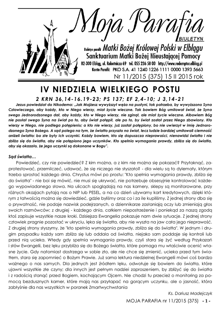 Nr 11/2015 (375) 15 II 2015 rok IV NIEDZIELA WIELKIEGO POSTU 2 KRN 36,14 - 16.19- 23 ; PS 137 ; EF 2,4- 10 ; J 3,14 - 21 Jezus powiedział do Nikodema: „Jak Mojżesz wywyższył węża na pustyni, tak potrzeba, by wywyższono Syna Człowieczego, aby każdy, kto w Niego wierzy, miał życie wieczne. Tak bowiem Bóg umiłował świat, że Syna swego Jednorodzonego dał, aby każdy, kto w Niego wierzy, nie zginął, ale miał życie wieczne. Albowiem Bóg nie posłał swego Syna na świat po to, aby świat potępił, ale po to, by świat został przez Niego zbawiony. Kto wierzy w Niego, nie podlega potępieniu; a kto nie wierzy, już został potępiony, bo nie uwierzył w imię Jednorodzonego Syna Bożego. A sąd polega na tym, że światło przyszło na świat, lecz ludzie bardziej umiłowali ciemność aniżeli światło: bo złe były ich uczynki. Każdy bowiem, kto się dopuszcza nieprawości, nienawidzi światła i nie zbliża się do światła, aby nie potępiono jego uczynków. Kto spełnia wymagania prawdy, zbliża się do światła, aby się okazało, że jego uczynki są dokonane w Bogu”. Sąd światła… Powiedzieć, czy nie powiedzieć? Z kim można, a z kim nie można się pokazać? Przytaknąć, zaprotestować, przemilczeć, udawać, że się niczego nie słyszało? - dla wielu są to dylematy, którym trzeba sprostać każdego dnia. Chrystus mówi po prostu: "Kto spełnia wymagania prawdy, zbliża się do światła" - nie boi się mówić, nie musi się ukrywać, nie potrzebuje obsesyjnie kontrolować każdego wypowiadanego słowa. Na ulicach spoglądają na nas kamery, sklepy są monitorowane, przy różnych okazjach pytają nas o NIP lub PESEL, a na co dzień używamy kart kredytowych, dzięki którym z łatwością można się dowiedzieć, gdzie byliśmy oraz co i za ile kupiliśmy. Z jednej strony dba się o prywatność, nie podaje nazwisk podejrzanych, a dziennikarze zasłaniają oczy lub zmieniają głos swoich rozmówców; z drugiej - każdego dnia, całkiem niepostrzeżenie i poniekąd za naszą zgodą ktoś zapisuje wszystkie nasze kroki. Dzisiejsza Ewangelia pokazuje nam dwie sytuacje. Z jednej strony człowiek pragnie pozostać w ukryciu, lęka się światła, aby nie wyszła na jaw cała jego nieprawość. Z drugiej strony słyszymy, że "kto spełnia wymagania prawdy, zbliża się do światła". W jednym i drugim przypadku każdy sam zbliża się lub oddala od światła, niejako sam poddaje się kontroli lub przed nią ucieka. Wtedy gdy spełnia wymagania prawdy, czyli stara się żyć według Przykazań i słów Ewangelii, bez lęku przybliża się do Bożego światła, które pomaga mu właściwie ocenić własne życie. Gdy natomiast dostrzega w sobie zło, ale nie chce się zmienić, ucieka przed tym światłem, stara się zapomnieć o Bożym Prawie. Już sama lektura niedzielnej Ewangelii mówi coś bardzo ważnego o nas samych. Dla jednych jest źródłem lęku, odwołuje się bowiem do światła, które ujawni wszystkie złe czyny; dla innych jest pełnym nadziei zaproszeniem, by zbliżyć się do światła i z radością stanąć przed Bogiem, kochającym Ojcem. Nie chodzi tu przecież o monitoring za pomocą bezdusznych kamer, które mają nas przyłapać na gorącym uczynku, ale o jasność, która zabłyśnie dla nas wszystkich w poranek Zmartwychwstania Ks. Dariusz Madejczyk MOJA PARAFIA nr 11/2015 (375) - 1 - PROGRAM REKOLEKCJI PARAFIALNYCH DLA DOROSŁYCH I MŁODZIEŻY 14 – 18 marzec 2015 r. 14 marzec (sobota) Godz. 18:00 – Msza św. z kazaniem rekolekcyjnym dla młodzieży Godz. 19:00 koncert ewangelizacyjno - pasyjny 15 marzec (niedziela) – Godz. 7:00, 8:30, 10:00, 11:30, 13:00, 16:30 – Msza św. z kazaniem ogólnym Godz. 17:30 – Gorzkie Żale z kazaniem pasyjnym Godz. 18:30 – Msza św. z kazaniem dla młodzieży 16 marzec (poniedziałek) – Godz. 7:00, 12:00, 17:00 – Msza św. z kazaniem ogólnym Godz. 18:30 – Msza św. z kazaniem dla młodzieży 17 marzec (wtorek) Godz. 7:00, 12:00, 17:00 – Msza św. z kazaniem ogólnym Godz. 18:00 – Nowenna Nieustanna do Matki Bożej Nieustającej Pomocy Godz. 18:30 – Msza św. z kazaniem rekolekcyjnym dla młodzieży 18 marzec (środa) Godz. 7:00, 12:00, 17:00 – Msza św. z kazaniem ogólnym Godz. 18:30 – Msza św. z kazaniem rekolekcyjnym dla młodzieży SPOWIEDŹ ŚW. Poniedziałek, wtorek i środa – pół godziny przed rozpoczęciem każdej Mszy świętej. REKOLEKCJE WIELKOPOSTNE DLA DZIECI SZKÓŁ PODSTAWOWYCH I PRZEDSZKOLI 16 – 18 marzec 2015 r. Godz. 8:00 – spotkanie dla dzieci klas VI i V Godz. 9:45 – spotkanie dla dzieci klas IV i III Godz. 11:00 – spotkanie dla dzieci klas II, I, „0” i przedszkolaków PIELGRZYMKA DO WŁOCH 05.08 – 16.08.2015 TRASA: Padwa, San Gimignano, Siena, Cascia, Asyż, Monte Casino, Materdomini, Monte Sant Angelo, San Giovanni Rotondo, Pompeje, Wezuwiusz, Neapol, Watykan, Rzym, Cortona, Wenecja. KOSZT: 2580 zł + 85 Euro (opłaty obowiązkowe) + około 30 Euro (wstępy). Zapisy i wpłaty: Biuro Radia Maryja, Elbląg, ul. Robotnicza 69. Tel. 55 236 58 01 (Wtorek i piątek od godz. 1600 do 1730, w niedzielę od 900 do 1300) Kancelaria Parafialna jest czynna od wtorku do czwartku w godz. 1000 – 1200 i 1600 – 1730 oraz w soboty od 9:00 do 10:30 Sprawy związane z pogrzebem można zgłaszać w każdym dniu. Modlitwa do św. Michała Archanioła Święty Michale Archaniele, wspomagaj nas w walce, a przeciw niegodziwości i zasadzkom złego ducha bądź naszą obroną. Oby go Bóg pogromić raczył, pokornie o to prosimy, a Ty, Wodzu niebieskich zastępów, szatana i inne duchy złe, które na zgubę dusz ludzkich po tym świecie krążą, mocą Bożą strąć do piekła. Amen. MOJA PARAFIA nr 11/2015 (375) Do użytku wewnętrznego - 2 - INTENCJE MSZALNE 7:00 12:00 17:00 18:30 Karmel 7:00 12:00 17:00 18:30 Karmel 7:00 8:00 17:00 18:30 Karmel 7:00 8:00 18:00 Karmel 7:00 8:00 18:00 Karmel 7:00 8:00 11:00 18:00 Karmel 7:00 8:30 10:00 11: