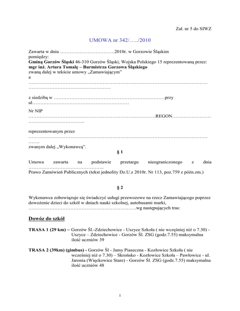 Zał. nr 5 do SIWZ UMOWA nr 342/…../2010 Zawarta w dniu …………………………….2010r. w Gorzowie Śląskim pomiędzy: Gminą Gorzów Śląski 46-310 Gorzów Śląski, Wojska Polskiego 15 reprezentowaną przez: mgr inŜ. Artura Tomalę – Burmistrza Gorzowa Śląskiego zwaną dalej w tekście umowy „Zamawiającym” a ………………………………………………………………………………………………… …………………………………………… z siedzibą w ……………………………………………………………przy ul…………………………………………………… Nr NIP …………………………………………………………………….REGON…………………… …………………………….. reprezentowanym przez ………………………………………………………………………………………………… ……. zwanym dalej „Wykonawcą”. §1 Umowa zawarta na podstawie przetargu nieograniczonego z dnia ……………………………………….. Prawo Zamówień Publicznych (tekst jednolity Dz.U.z 2010r. Nr 113, poz.759 z późn.zm.) §2 Wykonawca zobowiązuje się świadczyć usługi przewozowe na rzecz Zamawiającego poprzez dowoŜenie dzieci do szkół w dniach nauki szkolnej, autobusami marki, ………………………………………………………….wg następujących tras: Dowóz do szkół TRASA 1 (29 km) – Gorzów Śl.-Zdziechowice - Uszyce Szkoła ( nie wczęśniej niŜ o 7.30) Uszyce – Zdziechowice - Gorzów Śl. ZSG (godz.7.55) maksymalna ilość uczniów 39 TRASA 2 (39km) (gimbus) - Gorzów Śl - Jamy Piaseczna - Kozłowice Szkoła ( nie wcześniej niŜ o 7.30) – Skrońsko - Kozłowice Szkoła – Pawłowice - ul. Jaronia (Więckowice Stare) - Gorzów Śl. ZSG (godz.7.55) maksymalna ilość uczniów 48 1 TRASA 3 (21 km) – Gorzów Śl. – Dębina - Pawłowice Przedszkole - Kozłowice Szkoła (nie wcześniej niŜ o 7.30) – Pawłowice - Gorzów Śl. ZSG (godz.7.55) maksymalna ilość uczniów 43 TRASA 4 (21 km) – Gorzów Śl. - Kobyla Góra – Pakoszów – Budzów - Gorzów Śl. ZSG (godz.7.55) maksymalna ilość uczniów 36 TRASA 5 ( 11 km) – Gorzów Śl. - ul.Oleska ( Więckowice Nowe) – Jastrzygowice – Wygiełdów - Gorzów Śl. ZSG (godz.7.55) maksymalna ilość uczniów 59 TRASA 6 (18 km) – Gorzów Śl. – Goła - Nowa Wieś - Gorzów Śl. ZSG (godz.7.55) – maksymalna ilość uczniów 41 Odwóz ze szkół TRASA 1 (35 km) - Gorzów Śl. ZSG (odjazd ok.13.35) - Nowa Wieś – Tęczynów – Goła – Zdziechowice - Uszyce Szkoła (nie później niŜ 14.05) – Zdziechowice Gorzów Śl. TRASA 2 (46 km) - Gorzów Śl ZSG (odjazd ok.13.35) - ul. Jaronia (Więckowice Stare) – Kozłowice szkoła (odjazd nie później niŜ o 13.45) – Skrońsko – Kozłowice szkoła – Jamy Piaseczna – Gorzów Śl. TRASA 3 (11 km) – Gorzów Śl ZSG (odjazd o ok.13.35) – Wygiełdów – Jastrzygowice - ul. Jaronia (Więckowice Stare) - Gorzów Śl. TRASA 4 (23 km) - Gorzów Śl. ZSG (odjazd ok.13.55) – Dębina - Kobyla Góra – Pakoszów – Budzów - Gorzów Śl. TRASA 5 (32 km) - Gorzów Śl. ZSG (odjazd ok.14.30) – Goła – Zdziechowice - Uszyce Szkoła (nie później niŜ o 15.00) - Gorzów Śl. TRASA 6 (46 km) (gimbus) – Gorzów Śl. ZSG (odjazd ok.14.35) – ul. Jaronia (Więckowice Stare) – Pawłowice - Kozłowice Szkoła (odjazd nie później niŜ o 14.45) – Skrońsko - Kozłowice Szkoła - Pawłowice-Kozłowice Szkoła-Jamy Piaseczna-Gorzów Śl. TRASA 7 (22 km) – Gorzów Śl. ZSG (odjazd 14.35) – Wygiełdów – Jastrzygowice – Skrońsko - ul. Oleska (Więckowice Nowe) - Gorzów Śl. TRASA 8 (30 km) – Gorzów Śl. - Nowa Wieś – Tęczynów – Budzów – Pakoszów – Dębina - Gorzów Śl. TRASY DODATKOWE ( w zaleŜności od potrzeb) 3 razy w tygodniu odjazd po 15.20 TRASA 9 (23 km) - Gorzów Śl. ZSG – Goła – Zdziechowice – Uszyce – Gorzów Śl. TRASA 10 (30km) - Gorzów Śl. ZSG – Pawłowice – Kozłowice – Jamy – Kozłowice – Skrońsko – Jastrzygowice – Wygiełdów - Gorzów Śl. 2 TRASA 11 (23 km) – Gorzów Śl. ZSG – Budzów – Pakoszów - Kobyla Góra – Dębina Gorzów Śl §3 Z przewozu mogą korzystać uczniowie placówek oświatowych zgodnie z wykazem osób uprawnionych, oraz w przypadku wolnych miejsc w autobusie inne osoby za zgodą opiekuna lub Biura Obsługi Szkół i Przedszkoli w Gorzowie Śląskim. §4 Zamawiający zapewnia opiekuna do dzieci na czas przewozu. §5 Do szczególnych obowiązków Wykonawcy naleŜy: - zapewnienie bezpieczeństwa przewozów oraz bezpieczeństwa przy wsiadaniu i wysiadaniu dzieci i młodzieŜy wraz z opiekunem, - punktualność, - zapewnienie właściwych warunków sanitarnych w pojazdach. §6 Zamawiający naleŜność za usługę przewozową będzie regulował do 10 dnia kaŜdego następnego miesiąca po wykonaniu usługi na podstawie faktury wystawionej przez Wykonawcę wg stawki za 1 km autobusem Zamawiającego (gimbusem) …………………zł słownie: ………………………………………………………………………………………………… ……………………………… wg stawki za 1 km autobusem Wykonawcy…………………………………………………zł słownie: ………………………………………………………………………………………………… ………………………………. Płatnikiem jest Biuro Obsługi Szkół i Przedszkoli w Gorzowie Śląskim 46-310 Gorzów Śląski, Wojska Polskiego 15, NIP 576-12-41-607, REGON 001200988 §7 Zmiany postanowień umowy 1. Wszelkie zmiany umowy będą potwierdzone aneksem w formie pisemnej pod rygorem niewaŜności. 2. Zmiany postanowień umowy będą mogły nastąpić w następujących okolicznościach: a) Zmiany wysokości ceny jednostkowej za 1 km brutto w przypadku wzrostu ceny paliwa powyŜej 10 % 