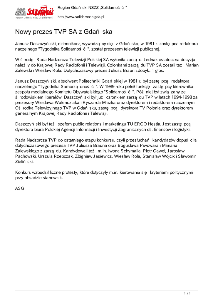Region Gda ski NSZZ „Solidarno http://www.solidarnosc.gda.pl Nowy prezes TVP SA z Gda ska Janusz Daszczy ski, dziennikarz, wywodz cy si z Gda ska, w 1981 r. zast naczelnego "Tygodnika Solidarno ", został prezesem telewizji publicznej. pca redaktora W rod Rada Nadzorcza Telewizji Polskiej SA wyłoniła zarz d. Jednak ostateczna decyzja nale y do Krajowej Rady Radiofonii i Telewizji. Członkami zarz du TVP SA zostali te Marian Zalewski i Wiesław Rola. Dotychczasowy prezes Juliusz Braun zdobył...1 głos. Janusz Daszczy ski, absolwent Politechniki Gda skiej w 1981 r. był zast pc redaktora naczelnego "Tygodnika Samorz dno ". W 1989 roku pełnił funkcj zast pcy kierownika zespołu medialnego Komitetu Obywatelskiego "Solidarno ". Pó niej był zwi zany ze rodowiskiem liberałów. Daszczy ski był ju członkiem zarz du TVP w latach 1994-1998 za prezesury Wiesława Walendziaka i Ryszarda Miazka oraz dyrektorem i redaktorem naczelnym O rodka Telewizyjnego TVP w Gda sku, zast pc dyrektora TV Polonia oraz dyrektorem generalnym Krajowej Rady Radiofonii i Telewizji. Daszczy ski był te szefem public relations i marketingu TU ERGO Hestia. Jest zast pc dyrektora biura Polskiej Agencji Informacji i Inwestycji Zagranicznych ds. finansów i logistyki. Rada Nadzorcza TVP do ostatniego etapu konkursu, czyli przesłucha kandydatów dopu ciła dotychczasowego prezesa TVP Juliusza Brauna oraz Bogusława Piwowara i Mariana Zalewskiego z zarz du. Kandydowali te m.in. Iwona Schymalla, Piotr Gaweł, Jarosław Pachowski, Urszula Rzepczak, Zbigniew Jasiewicz, Wiesław Rola, Stanisław Wójcik i Sławomir Zieli ski. Konkurs wzbudził liczne protesty, które dotyczyły m.in. kierowania si przy obsadzie stanowisk. kryteriami politycznymi ASG 1/1 Powered by TCPDF (www.tcpdf.org)