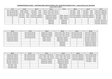 HARMONOGRAM ZAJĘĆ – TECHNIK ORGANIZACJI REKLAMY- KURS KWALIFIKACYJNY – semestr III [rok szk. 2013/2014] ważny od 01.11.2013 r. 6.11 Prac.sprzed.usł.rekl. Prac.sprzed.usł.rekl. Prac.sprzed.usł.rekl. Prac.sprzed.usł.rekl. X X X X X 13.11 Public relations Public relations Prac.plast. – techn. Prac.plast. – techn. Prac.plast. – techn. X X X X 14.11 Prac.plast. – techn.. Prac.plast. – techn.. Prac.plast. – techn. Pracownia multimed. Pracownia multimed. X X X X 16.11 Prawo, etyka i kult. Zawod. Prawo, etyka i kult. Zawod. Prawo, etyka i kult. Zawod. Organizacja reklamy Organizacja reklamy Organizacja reklamy Marketing Marketing Marketing 24.11 Pracownia multimed. Pracownia multimed. Pracownia multimed. Organizacja reklamy Organizacja reklamy Organizacja reklamy 27.11 Prac.sprzed.usł.rekl. Prac.sprzed.usł.rekl. Prac.sprzed.usł.rekl. Prac.sprzed.usł.rekl. x x x x x 30.11 Organizacja reklamy Organizacja reklamy Organizacja reklamy Public relations Public relations Public relations 08.12 Organizacja reklamy Organizacja reklamy Organizacja reklamy Rysunek i liternictwo Rysunek i liternictwo Rysunek i liternictwo Prac.plast.-techn. Prac.plast.-techn Prac.plast.-techn 11.12 Prac.sprzed.usł.rekl. Prac.sprzed.usł.rekl. Prac.sprzed.usł.rekl. Prac.sprzed.usł.rekl. x x x x x 14.12 Prawo,etyka i kult.Zawod. Prawo, etyka i kult. Zawod. Prawo, etyka i kult. Zawod. Organizacja reklamy Organizacja reklamy Organizacja reklamy 17.11 Public relations Public relations Public relations Marketing Marketing Marketing 20.11. Prac.plast. – techn. Prac.plast. – techn. Prac.plast. – techn. Pracownia multimed. Pracownia multimed. X X X X 01.12 Prawo,etyka i kult. Zawod. Prawo,etyka i kult. Zawod. Prawo,etyka i kult. Zawod. Organizacja reklamy Organizacja reklamy Organizacja reklamy Marketing Marketing Marketing 15.12 Prawo,etyka i kult. Zawod. Prawo, etyka i kult. Zawod. Prawo, etyka i kult. Zawod. Organizacja reklamy Organizacja reklamy Organizacja reklamy Public relations Public relations Public relations 21.11 Prac.plast. – techn. Prac.plast. – techn. Prac.plast. – techn. Pracownia multimed. Pracownia multimed. X X X X 04.12 Prac.sprzed.usł.rekl. Prac.sprzed.usł.rekl. Prac.sprzed.usł.rekl. Prac.sprzed.usł.rekl. x x x x x 18.12 Pracownia multimed. Pracownia multimed. Pracownia multimed. Pracownia multimed. x x x x x 23.11 Pracownia multimed. Pracownia multimed. Pracownia multimed. Prac.plast. – techn. Prac.plast. – techn. Prac.plast. – techn. Rysunek i liternictwo Rysunek i liternictwo Rysunek i liternictwo 07.12 Pracownia multimed. Pracownia multimed. Pracownia multimed. Rysunek i liternictwo Rysunek i liternictwo Rysunek i liternictwo Organizacja reklamy Organizacja reklamy Organizacja reklamy 19.12 Prac.sprzed.usł.rekl. Prac.sprzed.usł.rekl. Prac.plast. – techn. Prac.plast. – techn. Prac.plast. – techn. 08.01 Prac.sprzed.usł.rekl. Prac.sprzed.usł.rekl. Prac.plast. – techn. Prac.plast. – techn. Prac.plast. – techn. X X X x 09.01 Public relations Public relations Organizacja reklamy Organizacja reklamy Organizacja reklamy x x x x 11.01 Organizacja reklamy Organizacja reklamy Organizacja reklamy Public relations Public relations Public relations 12.01 Public relations Public relations Public relations Marketing Marketing Marketing Organizacja reklamy Organizacja reklamy Organizacja reklamy 15.01 Prac.sprzed.usł.rekl. Prac.sprzed.usł.rekl. Prac.sprzed.usł.rekl. Prac.sprzed.usł.rekl. x x x x x 18.01 Pracownia multimed. Pracownia multimed. Pracownia multimed. Organizacja reklamy Organizacja reklamy Organizacja reklamy Prac.plast. – techn. Prac.plast. – techn. Prac.plast. – techn. 19.01 Pracownia multimedialna Pracownia multimedialna Pracownia multimedialna Prac.plast. – techn. Prac.plast. – techn. Prac.plast. – techn. Rysunek i liternictwo Rysunek i liternictwo Rysunek i liternictwo 25.01 Organizacja reklamy Organizacja reklamy Organizacja reklamy Public relations Public relations Public relations 26.01 Organizacja reklamy Organizacja reklamy Organizacja reklamy Public relations Public relations Public relations 29.01 Prac.sprzed.usł.rekl. Prac.sprzed.usł.rekl. Prac.sprzed.usł.rekl. Prac.sprzed.usł.rekl. x x x x x 01.02 Pracownia multimed. Pracownia multimed. Pracownia multimed. Marketing Marketing Marketing Organizacja reklamy Organizacja reklamy Organizacja reklamy 02.02 Prac.plast. – techn. Prac.plast. – techn. Prac.plast. – techn. Public relations Public relations Public relations Organizacja reklamy Organizacja reklamy Organizacja reklamy