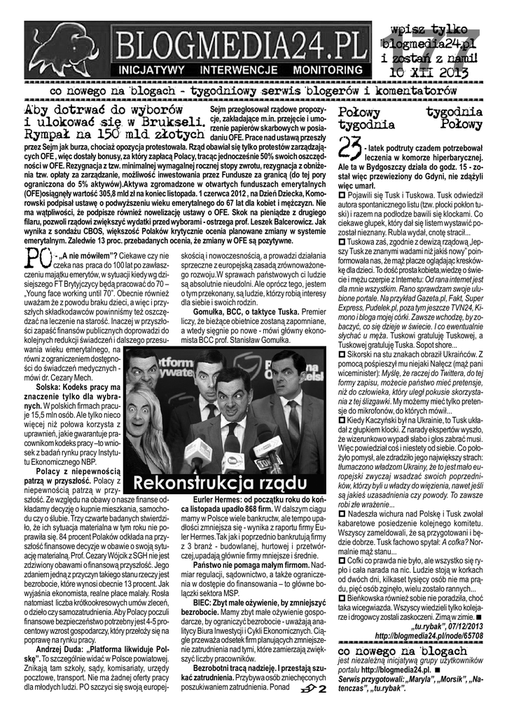 wpisz tylko blogmedia24.pl i zostañ z nami! 10 XII 2013 ========================================================================================== 177 co nowego na blogach - tygodniowy serwis blogerów i komentatorów ========================================================================================== Sejm przegłosował rządowe propozy- Po³owy Aby dotrwaæ do wyborów tygodnia zakładające m.in. przejęcie i umoi ulokowaæ siê w Brukseli. cje, Po³owy rzenie papierów skarbowych w posia- tygodnia Rympa³ na 150 mld z³otych daniu OFE. Prace nad ustawą przeszły przez Sejm jak burza, chociaż opozycja protestowała. Rząd obawiał się tylko protestów zarządzających OFE , więc dostały bonusy, za który zapłacą Polacy, tracąc jednocześnie 50% swoich oszczędności w OFE. Rezygnacja z tzw. minimalnej wymagalnej rocznej stopy zwrotu, rezygnacja z obniżenia tzw. opłaty za zarządzanie, możliwość inwestowania przez Fundusze za granicą (do tej pory ograniczona do 5% aktywów).Aktywa zgromadzone w otwartych funduszach emerytalnych (OFE)osiągnęły wartość 305,8 mld zł na koniec listopada. 1 czerwca 2012 , na Dzień Dziecka, Komorowski podpisał ustawę o podwyższeniu wieku emerytalnego do 67 lat dla kobiet i mężczyzn. Nie ma wątpliwości, że podpisze również nowelizację ustawy o OFE. Skok na pieniądze z drugiego filaru, pozwoli rządowi zwiększyć wydatki przed wyborami - ostrzega prof. Leszek Balcerowicz. Jak wynika z sondażu CBOS, większość Polaków krytycznie ocenia planowane zmiany w systemie emerytalnym. Zaledwie 13 proc. przebadanych ocenia, że zmiany w OFE są pozytywne. PO - „A nie mówiłem”? Ciekawe czy nie czeka nas praca do 100 lat po zawłaszczeniu majątku emerytów, w sytuacji kiedy wg dzisiejszego FT Brytyjczycy będą pracować do 70 – „Young face working until 70”. Obecnie również uważam że z powodu braku dzieci, a więc i przyszłych składkodawców powinniśmy też oszczędzać na leczenie na starość. Inaczej w przyszłości zapaść finansów publicznych doprowadzi do kolejnych redukcji świadczeń i dalszego przesuwania wieku emerytalnego, na równi z ograniczeniem dostępności do świadczeń medycznych mówi dr. Cezary Mech. Solska: Kodeks pracy ma znaczenie tylko dla wybranych. W polskich firmach pracuje 15,5 mln osób. Ale tylko nieco więcej niż połowa korzysta z uprawnień, jakie gwarantuje pracownikom kodeks pracy –to wniosek z badań rynku pracy Instytutu Ekonomicznego NBP. Polacy z niepewnością patrzą w przyszłość. Polacy z niepewnością patrzą w przyszłość. Ze względu na obawy o nasze finanse odkładamy decyzję o kupnie mieszkania, samochodu czy o ślubie. Trzy czwarte badanych stwierdziło, że ich sytuacja materialna w tym roku nie poprawiła się. 84 procent Polaków odkłada na przyszłość finansowe decyzje w obawie o swoją sytuację materialną. Prof. Cezary Wójcik z SGH nie jest zdziwiony obawami o finansową przyszłość. Jego zdaniem jedną z przyczyn takiego stanu rzeczy jest bezrobocie, które wynosi obecnie 13 procent. Jak wyjaśnia ekonomista, realne płace malały. Rosła natomiast liczba krótkookresowych umów zleceń, o dzieło czy samozatrudnienia. Aby Polacy poczuli finansowe bezpieczeństwo potrzebny jest 4-5 procentowy wzrost gospodarczy, który przełoży się na poprawę na rynku pracy. Andrzej Duda: „Platforma likwiduje Polskę”. To szczególnie widać w Polsce powiatowej. Znikają tam szkoły, sądy, komisariaty, urzędy pocztowe, transport. Nie ma żadnej oferty pracy dla młodych ludzi. PO szczyci się swoją europej- skością i nowoczesnością, a prowadzi działania sprzeczne z europejską zasadą zrównoważonego rozwoju.W sprawach państwowych ci ludzie są absolutnie nieudolni. Ale oprócz tego, jestem o tym przekonany, są ludzie, którzy robią interesy dla siebie i swoich rodzin. Gomułka, BCC, o taktyce Tuska. Premier liczy, że bieżące obietnice zostaną zapomniane, a wtedy sięgnie po nowe - mówi główny ekonomista BCC prof. Stanisław Gomułka. Eurler Hermes: od początku roku do końca listopada upadło 868 firm. W dalszym ciągu mamy w Polsce wiele bankructw, ale tempo upadłości zmniejsza się - wynika z raportu firmy Euler Hermes.Tak jak i poprzednio bankrutują firmy z 3 branż - budowlanej, hurtowej i przetwórczej,upadają głównie firmy mniejsze i średnie. Państwo nie pomaga małym firmom. Nadmiar regulacji, sądownictwo, a także ograniczenia w dostępie do finansowania – to główne bolączki sektora MSP. BIEC: Zbyt małe ożywienie, by zmniejszyć bezrobocie. Mamy zbyt małe ożywienie gospodarcze, by ograniczyć bezrobocie - uważają analitycy Biura Inwestycji i Cykli Ekonomicznych. Ciągle przeważa odsetek firm planujących zmniejszenie zatrudnienia nad tymi, które zamierzają zwiększyć liczby pracowników. Bezrobotni tracą nadzieję. I przestają szukać zatrudnienia. Przybywa osób zniechęconych poszukiwaniem zatrudnienia. Ponad 2 23 - latek podtruty czadem potrzebował leczenia w komorze hiperbarycznej. Ale ta w Bydgoszczy działa do godz. 15 - został więc przewieziony do Gdyni, nie zdążyli więc umarł. Pojawili się Tusk i Tuskowa. Tusk odwiedził autora spontanicznego listu (tzw. płocki pokłon tuski) i razem na podłodze bawili się klockami. Co ciekawe głupek, który dał się listem wystawić pozostał nieznany. Rubla wydał, cnotę stracił... Tuskowa zaś, zgodnie z dewizą rządową „lepszy Tusk ze znanymi wadami niż jakiś nowy” poinformowała nas, że mąż płacze oglądając kreskówkę dla dzieci. To dość prosta kobieta,wiedzę o świecie i mężu czerpie z Internetu: Od rana internet jest dla mnie wszystkim. Rano sprawdzam swoje ulubione portale. Na przykład Gazeta.pl, Fakt, Super Express, Pudelek.pl, poza tym jeszcze TVN24, Kimono i bloga mojej córki. Zawsze wchodzę, by zobaczyć, co się dzieje w świecie. I co ewentualnie słychać u męża. Tuskowi gratuluję Tuskowej, a 