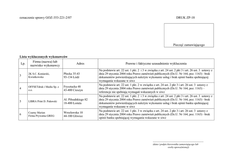 oznaczenie sprawy GOZ-353-221-2/07 DRUK ZP-18 Pieczęć zamawiającego Lista wykluczonych wykonawców Firma (nazwa) lub Lp. nazwisko wykonawcy Adres 3 2K S.C. Koniarski, Kwiatkowska Płocka 35-43 93-134 Łódź 4 OFFSETdruk i Media Sp. z o.o. Frysztacka 48 43-400 Cieszyn 5 LIBRA Print D. Puławski Al. Piłsudskiego 82 18-400 ŁomŜa 6 Czarny Marian Firma Prywatna GREG Wrocławska 10 44-100 Gliwice Prawne i faktyczne uzasadnienie wykluczenia Na podstawie art. 22 ust. 1 pkt. 2 i 3 w związku z art. 24 ust. 2 pkt 3 i art. 26 ust. 3 ustawy z dnia 29 stycznia 2004 roku Prawo zamówień publicznych (Dz.U. Nr 164, poz. 1163) –brak dokumentów potwierdzających naleŜyte wykonanie usług i brak opinii banku spełniającej wymagania wskazane w siwz Na podstawie art. 22 ust. 1 pkt. 2 w związku z art. 24 ust. 2 pkt 3 i art. 26 ust. 3 ustawy z dnia 29 stycznia 2004 roku Prawo zamówień publicznych (Dz.U. Nr 164, poz. 1163) – referencje nie spełniają wymagań wskazanych w siwz Na podstawie art. 22 ust. 1 pkt. 2 i 3 w związku z art. 24 ust. 2 pkt 3 i art. 26 ust. 3 ustawy z dnia 29 stycznia 2004 roku Prawo zamówień publicznych (Dz.U. Nr 164, poz. 1163) –brak dokumentów potwierdzających naleŜyte wykonanie usług i brak opinii banku spełniającej wymagania wskazane w siwz Na podstawie art. 22 ust. 1 pkt. 3 w związku z art. 24 ust. 2 pkt 3 i art. 26 ust. 3 ustawy z dnia 29 stycznia 2004 roku Prawo zamówień publicznych (Dz.U. Nr 164, poz. 1163) –brak opinii banku spełniającej wymagania wskazane w siwz ............................................................. (data i podpis kierownika zamawiającego lub osoby upowaŜnionej)