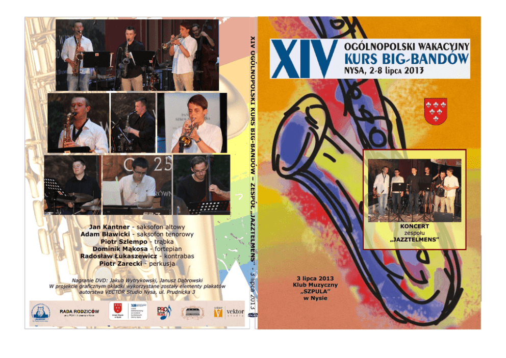 Nagranie DVD: Jakub Wytrykowski, Janusz Dąbrowski W projekcie graficznym okładki wykorzystane zostały elementy plakatów autorstwa VECTOR Studio Nysa, ul. Prudnicka 3 XIV OGÓLNOPOLSKI KURS BIG-BANDÓW – ZESPÓŁ „JAZZTELMENS” - 3 lipca 2013 Jan Kantner - saksofon altowy Adam Bławicki - saksofon tenorowy Piotr Szlempo - trąbka Dominik Mąkosa - fortepian Radosław Łukaszewicz - kontrabas Piotr Zarecki - perkusja KONCERT zespołu „JAZZTELMENS” 3 lipca 2013 Klub Muzyczny „SZPULA” w Nysie