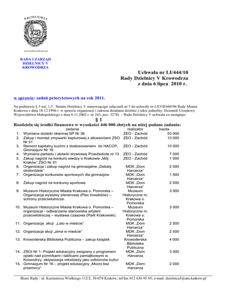 RADA I ZARZĄD DZIELNICY V KROWODRZA Uchwała nr LI/444/10 Rady Dzielnicy V Krowodrza z dnia 6 lipca 2010 r. w sprawie: zadań priorytetowych na rok 2011. Na podstawie § 5 ust. 1,5 Statutu Dzielnicy V stanowiącego załącznik nr 5 do uchwały nr LXVII/660/96 Rady Miasta Krakowa z dnia 18.12.1996 r. w sprawie organizacji i zakresu działania dzielnic ( tekst jednolity: Dziennik Urzędowy Województwa Małopolskiego z dnia 6.11.2002 r. nr 243, poz. 3278) – Rada Dzielnicy V uchwala co następuje: §1 Rozdziela się środki finansowe w wysokości 446 000 złotych na niżej podane zadania: zadanie 1. Wymiana stolarki okiennej SP Nr 36 2. Zakup i montaż zmywarki kapturowej z akcesoriami ZSO Nr 51 3. Remont kapitalny kuchni z dostosowaniem do HACCP, Gimnazjum Nr 16 4. Wymiana parkietu i stolarki drzwiowej Przedszkole nr 13 5. Zakup nagród na konkurs wiedzy o Krakowie „Mój Kraków” ZSO Nr 51 6. Organizacja i zakup nagród na gimnazjalne „Debaty oksfordzkie” 7. Organizacja konkursów sportowych dla gimnazjów 8. Zakup nagród na konkursy sportowe 9. Muzeum Historyczne Miasta Krakowa o. Pomorska – Organizacja wystawy plenerowej (Plac Inwalidów) – schrony przeciwlotnicze. 10. Muzeum Historyczne Miasta Krakowa o. Pomorska – organizacja - odtwarzanie stanowiska artylerii przeciwlotniczej – wystawa czasowa (Park Krakowski). 11. Organizacja akcji „Lato w mieście” 12. Organizacja akcji „zima w mieście” 13. Krowoderska Biblioteka Publiczna – zakup książek 14. ZSOI Nr 1- Projekt edukacyjny związany z programem opieki nad pomnikami i tablicami pamiątkowymi w Krowodrzy, aktywizacja młodzieży jako odbiorców kultur 15. Gimnazjum Nr 16 – projekt edukacyjny „Mocni bez przemocy” realizator ZEO - Zachód ZEO - Zachód kwota 53 000 13 000 ZEO - Zachód 10 000 ZEO - Zachód ZEO - Zachód 7 000 1 000 MDK „Dom Harcerza” MDK „Dom Harcerza” MDK „Dom Harcerza” Muzeum Historyczne m. Krakowa o. Pomorska Muzeum Historyczne m. Krakowa o. Pomorska MDK „Dom Harcerza” MDK „Dom Harcerza” Krowoderska Biblioteka Publiczna MDK „Dom Harcerza 2 000 MDK „Dom Harcerza 2 000 1 500 2 500 3 000 3 000 2 500 2 500 4 000 3 000 Biuro Rady : ul. Kazimierza Wielkiego 112/2, 30-074 Kraków; tel/fax 012 636 95 95; e-mail: [email protected] RADA I ZARZĄD DZIELNICY V KROWODRZA 16. VII LO – szkolna liga Debat 17. Muzeum Historii Fotografii – dofinansowanie zakupu kserografu z drukarką 18. „Komunikacja z mieszkańcami” – prowadzenie strony internetowej 19. „Komunikacja z mieszkańcami” – banery 20. „Komunikacja z mieszkańcami” – redakcja gazetki 21. „Komunikacja z mieszkańcami” – druk gazetki 22. Straż Miejska – realizacja zadań interwencyjnych, szkoleń dla dzieci i młodzieży w ramach pikniku Krowoderskiego 23. 24. 25. 26. 27. 28. VII LO Muzeum Historii Fotografii BR 2 000 8 000 BR BR BR Straż Miejska 1 000 11 000 33 500 27 000 4 500 Biuro Rady : ul. Kazimierza Wielkiego 112/2, 30-074 Kraków; tel/fax 012 636 95 95; e-mail: [email protected] RADA I ZARZĄD DZIELNICY V KROWODRZA Biuro Rady : ul. Kazimierza Wielkiego 112/2, 30-074 Kraków; tel/fax 012 636 95 95; e-mail: [email protected]