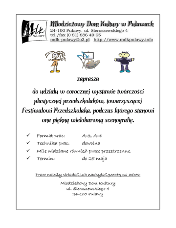 zaprasza do udziału w corocznej wystawie twórczości plastycznej przedszkolaków, towarzyszącej Festiwalowi Przedszkolaka, podczas którego stanowi ona piękną wielobarwną scenografię. Format prac: A-3, AA-4 Technika prac: dowolna Mile widziane równieŜ równie prace przestrzenne. Termin: do 25 maja Prace naleŜy nale y składać składa lub nadsyłać nadsyła pocztą poczt na adres: MłodzieŜowy Młodzie owy Dom Kultury ul. Sieroszewskiego 4 2424-100 Puławy