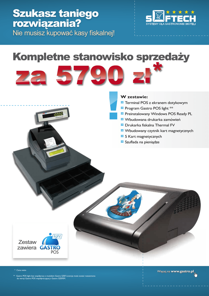 Szukasz taniego rozwiązania? SYSTEMY DLA GASTRONOMII I HOTELI Nie musisz kupować kasy fiskalnej! Kompletne stanowisko sprzedaży za 5790 zł* W zestawie: ¤ Terminal POS z ekranem dotykowym ¤ Program Gastro POS light ** ¤ Preinstalowany Windows POS Ready PL ¤ Wbudowana drukarka zamówień ¤ Drukarka fiskalna Thermal FV ¤ Wbudowany czytnik kart magnetycznych ¤ 5 Kart magnetycznych ¤ Szuflada na pieniądze Zestaw zawiera * Cena netto ** Gastro POS light bez współpracy z modułem Gastro SZEF. Licencja może zostać rozszerzona do wersji Gastro POS współpracującej z Gastro SZEFEM. Więcej na www.gastro.pl Program Gastro POS light Gastronomiczny system sprzedaży na ekranie dotykowym Gastro POS light jest systemem sprzedaży obsługiwanym poprzez ekran dotykowy, dedykowanym dla lokali gastronomicznych. Powstał w celu wyeliminowania ograniczeń funkcjonalnych, jakie stwarzało posługiwanie się na stanowisku sprzedaży kasą fiskalną. Gastro POS light jest prostszą wersją najpopularniejszego w Polsce programu dla gastronomii Gastro POS. Obsługa programu Gastro POS light przypomina pracę na zwykłej kasie, z tą różnicą, że klawisze są wyświetlane na ekranie a wybór potraw jest prosty i intuicyjny, przy tym nieporównywalnie szybszy. Identyfikacja kelnera następuje wg kodu lub z użyciem karty magnetycznej. System przewyższa ergonomią oraz swoimi możliwościami każdą kasę gastronomiczną. Łatwa i efektywna praca w restauracji Liczne i dokładne raporty Obsługa poprzez ekran dotykowy; Identyfikacja sprzedawcy kodem lub kartą magnetyczną, rejestracja; Współpraca ze zintegrowaną drukarką zamówień Tryb szybkiej sprzedaży dla lokali typu fast-food. Raport kelnerski, raport utargów, raport o udzielonych rabatach, raport wykonanych storn, raport sprzedaży wg PLU (kodów produktów), raport sprzedaży wg grup towarowych, raport sprzedaży na karty rabatowe, rejestry VAT, raporty kasowe i inne; Elastyczne kształtowanie cen i rozliczeń Bogata funkcjonalność, specjalistyczne funkcje Możliwość korekt rachunków przed i po wydrukowaniu zamówienia z możliwością ustalania uprawnień do wykonania korekt; Obsługa dowolnych form płatności - gotówka, karty kredytowe, czeki; Obsługa wewnętrznej sprzedaży bezgotówkowej. Wyświetlanie ceny i nazwy potrawy oraz komunikatu dla Klienta na wyświetlaczu konsumenckim; Wystawianie faktur; Współpraca z większością urządzeń fiskalnych dostępnych na polskim rynku; Wydruk na jednej drukarce fiskalnej z kilku komputerów POS poprzez spooler DFSERWIS; Specyfikacja techniczna Terminal dotykowy PS3100 Gastro Wyjątkowy - zintegrowany Terminal POS z ekranem 10,4” z systemem Gastro POS light Cechy i zalety PS3100 Gastro POS Szybki procesor Intel ATOM N270 Obudowa bez wentylatorów Wygodny dotykowy ekran 10.4" LCD Wbudowany czytnik kart magnetycznych Dysk twardy 160 GB, Pamięć RAM 1 GB Nowoczesny wygląd Wbudowana termiczna drukarka zamówień z odcinaczem Więcej informacji o możliwościach i zaletach systemów Gastro znajdziesz na www.gastro.pl Softech Sp. z o.o. 01-940 Warszawa, ul. Palisadowa 20/22 tel. +48 22 610 77 42 fax +48 22 379 17 28 e-mail: [email protected], www.gastro.pl Małe rozmiary 300 szer. x 299 wys. x 135 gł. mm PARTNER SOFTECH