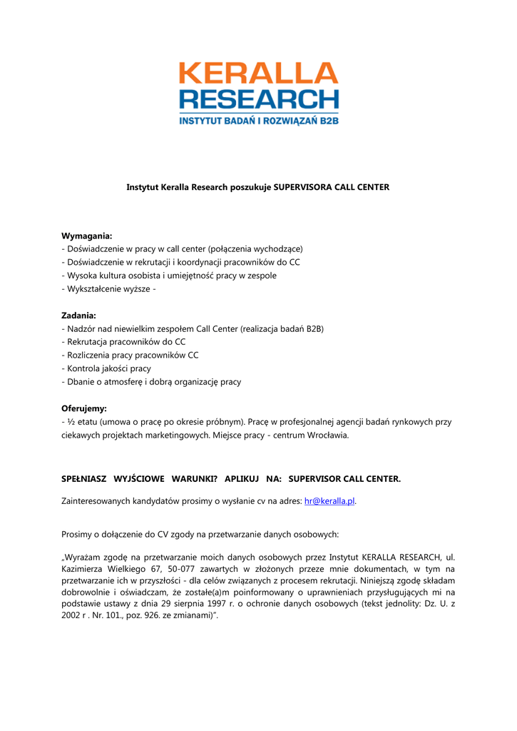 Instytut Keralla Research poszukuje SUPERVISORA CALL CENTER Wymagania: - Doświadczenie w pracy w call center (połączenia wychodzące) - Doświadczenie w rekrutacji i koordynacji pracowników do CC - Wysoka kultura osobista i umiejętność pracy w zespole - Wykształcenie wyższe Zadania: - Nadzór nad niewielkim zespołem Call Center (realizacja badań B2B) - Rekrutacja pracowników do CC - Rozliczenia pracy pracowników CC - Kontrola jakości pracy - Dbanie o atmosferę i dobrą organizację pracy Oferujemy: - ½ etatu (umowa o pracę po okresie próbnym). Pracę w profesjonalnej agencji badań rynkowych przy ciekawych projektach marketingowych. Miejsce pracy - centrum Wrocławia. SPEŁNIASZ WYJŚCIOWE WARUNKI? APLIKUJ NA: SUPERVISOR CALL CENTER. Zainteresowanych kandydatów prosimy o wysłanie cv na adres: [email protected]. Prosimy o dołączenie do CV zgody na przetwarzanie danych osobowych: „Wyrażam zgodę na przetwarzanie moich danych osobowych przez Instytut KERALLA RESEARCH, ul. Kazimierza Wielkiego 67, 50-077 zawartych w złożonych przeze mnie dokumentach, w tym na przetwarzanie ich w przyszłości - dla celów związanych z procesem rekrutacji. Niniejszą zgodę składam dobrowolnie i oświadczam, że zostałe(a)m poinformowany o uprawnieniach przysługujących mi na podstawie ustawy z dnia 29 sierpnia 1997 r. o ochronie danych osobowych (tekst jednolity: Dz. U. z 2002 r . Nr. 101., poz. 926. ze zmianami)”.
