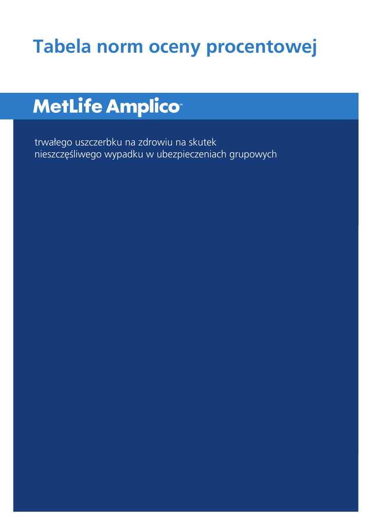 Tabela norm oceny procentowej trwałego uszczerbku na zdrowiu na skutek nieszczęśliwego wypadku w ubezpieczeniach grupowych A. Uszkodzenia głowy Procent trwałego uszczerbku 1. Uszkodzenia powłok czaszki (bez uszkodzeń kostnych): a) uszkodzenie powłok czaszki – w zależności od rozmiaru (minimum 3 cm długości), ruchomości i tkliwości blizn 1-10 Utrata skóry owłosionej – oskalpowanie – w zależności od powierzchni ubytku: b) utrata poniżej 50% powierzchni skóry owłosionej 1-15 c) utrata od 50% do 100% powierzchni skóry owłosionej 15-30 Uwaga: W przypadku skutecznej replantacji skalpu lub uzupełnienia ubytku skóry owłosionej przeszczepem skóry oraz odtworzenia własnego owłosienia należy oceniać wg poz. 1a. 2. Uszkodzenie kości sklepienia i podstawy czaszki (szczeliny złamań, wgłobienia, fragmentacja) – w zależności od rozległości uszkodzeń 1-10 3. Ubytek w kościach czaszki – w zależności od rozmiaru ubytku: a) poniżej 10 cm2 ubytku 1-10 b) od 10 do 50 cm2 ubytku 11-15 c) powyżej 50 cm2 ubytku 16-25 Uwaga: Jeżeli przy uszkodzeniach i ubytkach kości czaszki (poz. 2 i 3) występują jednocześnie uszkodzenia powłok czaszki (poz. 1), należy osobno oceniać stopień inwalidztwa za uszkodzenia lub ubytki kości wg poz. 2 lub 3 i osobno za uszkodzenia powłok czaszki wg poz. 1. Jeżeli powstały ubytek kości został uzupełniony operacją plastyczną z dobrym efektem, odsetek trwałego uszczerbku na zdrowiu, oceniony wg powyższej zasady, należy zmniejszyć o połowę. 4. Powikłania towarzyszące uszkodzeniom wymienionym w poz. 1, 2, 3 w postaci: nawracającego wycieku płynu mózgowo-rdzeniowego, przewlekłego zapalenia kości, ropowicy podczepcowej leczonej operacyjnie, zakrzepicy powłok, przepukliny mózgowej – ocenia się dodatkowo – w zależności od rodzaju i stopnia powikłań 1-15 5. Porażenia i niedowłady połowicze: a) porażenia połowicze, porażenie kończyn dolnych, utrwalone, uniemożliwiające samodzielne stanie lub chodzenie 100 b) głęboki niedowład połowiczy lub obu kończyn dolnych, znacznie utrudniający sprawność kończyn 60-80 c) niedowład połowiczy lub niedowład obu kończyn dolnych średniego stopnia 30-59 d) niedowład połowiczy lub niedowład obu kończyn dolnych nieznacznego stopnia, dyskretny deficyt siły przy obecności zaburzeń napięcia mięśniowego, niedostatecznej precyzji ruchów itp. 5-29 e) porażenie kończyny górnej z niedowładem kończyny dolnej: –prawej 50-80 –lewej 40-70 f) porażenie kończyny dolnej z niedowładem kończyny górnej: –prawej 70-90 –lewej 60-80 g) niedowład kończyny górnej bez niedowładu kończyny dolnej, w zależności od stopnia niedowładu: –prawej 5-60 –lewej 5-50 h) niedowład kończyny dolnej bez niedowładu kończyny górnej, w zależności od stopnia niedowładu 5–50 Uwaga: W przypadku współistnienia zaburzeń mowy pochodzenia ośrodkowego oceniać dodatkowo według poz. 11, uwzględniając, że całkowity uszczerbek na zdrowiu z tytułu uszkodzenia mózgu nie może przekroczyć 100%. W ocenie stopnia niedowładów i porażeń stosowana będzie skala Lovette’a i Ashworta. 6. Zespoły pozapiramidowe: a) utrwalony zespół pozapiramidowy znacznie utrudniający sprawność ustroju i wymagający opieki osób trzecich 100 b) utrwalony zespół pozapiramidowy znacznie utrudniający sprawność ustroju z zaburzeniami mowy, napadami ocznymi itp. 40-99 c) zaznaczony zespół pozapiramidowy 5-39 7. Zaburzenia równowagi i zaburzenia sprawności ruchowej (ataksja, dysmetria) pochodzenia centralnego, zespoły móżdżkowe: a) zaburzenia równowagi uniemożliwiające chodzenie i samodzielne funkcjonowanie 100 b) zaburzenia równowagi utrudniające w dużym stopniu chodzenie i sprawność ruchową 40-99 c) zaburzenia równowagi utrudniające chodzenie i sprawność ruchową w małym i średnim stopniu, dyskretne upośledzenie zborności i precyzji ruchów 5-39 8. Padaczka: a) padaczka z zaburzeniami psychicznymi, charakteropatią, otępieniem i ekwiwalentami padaczkowymi uniemożliwiająca jakąkolwiek pracę 100 b) padaczka z napadami minimum 3 na tydzień, ze zmianami otępiennymi, utrudniająca w dużym stopniu wykonywanie pracy 51-99 c) padaczka bez zmian psychicznych z częstymi napadami mimo leczenia (powyżej 2 miesięcznie) 21-50 d) padaczka bez zmian psychicznych z rzadkimi napadami (2 i mniej na miesiąc w trakcie leczenia) 11-20 e) padaczka z napadami o różnej morfologii – bez utrat przytomności 1-10 Uwaga: Podstawą rozpoznania padaczki są: obserwacja napadu przez lekarza i typowe zmiany w zapisie EEG, dokumentacja ambulatoryjna, względnie szpitalna (podejrzenie padaczki nie jest wystarczające do uznania uszczerbku z tego tytułu). 9. Zaburzenia neurologiczne i psychiczne uwarunkowane organicznie (encefalopatie): a) ciężkie zaburzenia psychiczne wymagające stałej opieki osób trzecich (zmiany otępienne, utrwalone psychozy) 70-100 b) encefalopatia ze zmianami charakterologicznymi i/lub dużym deficytem neurologicznym 40-69 c) encefalopatia ze zmianami charakterologicznymi i/lub deficytem neurologicznym o umiarkowanym nasileniu 10-39 Uwaga: Za encefalopatią poza zespołem psychoorganicznym przemawiają odchylenia przedmiotowe w stanie neurologicznym, zmiany w zapisie EEG i obrazie CT mózgu. 10.Zaburzenia adaptacyjne, nerwice, tzw. zespoły cerebrasteniczne i inne utrwalone skargi subiektywne powstałe w następstwie urazów czaszkowo-mózgowych: a) utrwalone nerwice związane z urazem czaszkowo-mózgowym, lub ciężkim uszkodzeniem ciała – w zależności od stopnia zaburzeń, wymagające stałego leczenia psychiatrycznego 6-20 b) zespół cerebrasteniczny z utrwalonymi skargami subiektywnymi związanymi z urazem głowy – w zależności od stopnia zaburzeń (bóle głowy, zawroty głowy, zaburzenia pamięci i koncentracji, zaburzenia snu, drażliwość, nadpobudliwość utrzymujące się powyżej 6 miesięcy od urazu