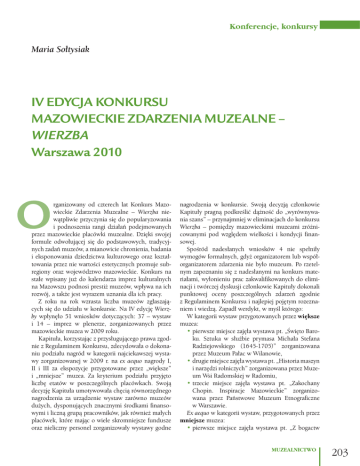 Konferencje, konkursy Maria Sołtysiak IV EDYCJA KONKURSU MAZOWIECKIE ZDARZENIA MUZEALNE – WIERZBA Warszawa 2010 rganizowany od czterech lat Konkurs Mazowieckie Zdarzenia Muzealne – Wierzba niewątpliwie przyczynia się do popularyzowania i podnoszenia rangi działań podejmowanych przez mazowieckie placówki muzealne. Dzięki swojej formule odwołującej się do podstawowych, tradycyjnych zadań muzeów, a mianowicie chronienia, badania i eksponowania dziedzictwa kulturowego oraz kształtowania przez nie wartości estetycznych promuje subregiony oraz województwo mazowieckie. Konkurs na stałe wpisany już do kalendarza imprez kulturalnych na Mazowszu podnosi prestiż muzeów, wpływa na ich rozwój, a także jest wyrazem uznania dla ich pracy. Z roku na rok wzrasta liczba muzeów zgłaszających się do udziału w konkursie. Na IV edycję Wierzby wpłynęło 51 wniosków dotyczących: 37 – wystaw i 14 – imprez w plenerze, zorganizowanych przez mazowieckie muzea w 2009 roku. Kapituła, korzystając z przysługującego prawa zgodnie z Regulaminem Konkursu, zdecydowała o dokonaniu podziału nagród w kategorii najciekawszej wystawy zorganizowanej w 2009 r. na ex aequo nagrody I, II i III za ekspozycje przygotowane przez „większe” i „mniejsze” muzea. Za kryterium podziału przyjęto liczbę etatów w poszczególnych placówkach. Swoją decyzję Kapituła umotywowała chęcią równorzędnego nagrodzenia za urządzenie wystaw zarówno muzeów dużych, dysponujących znacznymi środkami finansowymi i liczną grupą pracowników, jak również małych placówek, które mając o wiele skromniejsze fundusze oraz nieliczny personel zorganizowały wystawy godne nagrodzenia w konkursie. Swoją decyzją członkowie Kapituły pragną podkreślić dążność do „wyrównywania szans” – przynajmniej w eliminacjach do konkursu Wierzba – pomiędzy mazowieckimi muzeami zróżnicowanymi pod względem wielkości i kondycji finansowej. Spośród nadesłanych wniosków 4 nie spełniły wymogów formalnych, gdyż organizatorem lub współorganizatorem zdarzenia nie było muzeum. Po rzetelnym zapoznaniu się z nadesłanymi na konkurs materiałami, wyłonieniu prac zakwalifikowanych do eliminacji i twórczej dyskusji członkowie Kapituły dokonali punktowej oceny poszczególnych zdarzeń zgodnie z Regulaminem Konkursu i najlepiej pojętym rozeznaniem i wiedzą. Zapadł werdykt, w myśl którego: W kategorii wystaw przygotowanych przez większe muzea: • pierwsze miejsce zajęła wystawa pt. „Święto Baroku. Sztuka w służbie prymasa Michała Stefana Radziejowskiego (1645-1705)” zorganizowana przez Muzeum Pałac w Wilanowie, • drugie miejsce zajęła wystawa pt. „Historia maszyn i narzędzi rolniczych” zorganizowana przez Muzeum Wsi Radomskiej w Radomiu, • trzecie miejsce zajęła wystawa pt. „Zakochany Chopin. Inspiracje Mazowieckie” zorganizowana przez Państwowe Muzeum Etnograficzne w Warszawie. Ex aequo w kategorii wystaw, przygotowanych przez mniejsze muzea: • pierwsze miejsce zajęła wystawa pt. „Z bogactw MUZEALNICTWO 203 Konferencje, konkursy 1. Unusual overlook axis with mirrors, referring to the baroque art, running through the exhibition „Baroque Festival. Art in the service of the primate Michał Stefan Radziejowski (1645-1705)” in the Wilanów Palace Museum – 1st place in the category of exhibitions in “large” museums natury – sochocińskie guziki” zorganizowana przez Izbę Pamiątkową Guzikarstwa w Gminie Sochocin we współpracy z Muzeum Mazowieckim w Płocku, • drugie miejsce zajęła „Wystawa Elementów Wyposażenia Fortyfikacji Polskiej Okresu Międzywojennego” zorganizowana przez Muzeum Ziemi Makowskiej i Garnizonu Różan w Różanie, • trzecie miejsce zajęła wystawa pt. „My Naród… 90 lat stosunków dyplomatycznych między Polską a USA” zorganizowana przez Muzeum im. Kazimierza Pułaskiego w Warce. Ponadto, Kapituła zdecydowała o przyznaniu w tej kategorii siedmiu wyróżnień honorowych dla następujących wystaw: 1. „Pupilla Libertatis. Wolne elekcje królów polskich 1573-1764” zorganizowanej przez Muzeum Historyczne m.st. Warszawy, Oddział Muzeum Woli. 2. „Z pamiętników starego subiekta” zorganizowanej przez Muzeum im. Jacka Malczewskiego w Radomiu. 3. „Wojsko Polskie w II RP” zorganizowanej przez Muzeum Wojska Polskiego w Warszawie. 4. „Ja, Witold Gombrowicz” – ekspozycji stałej zorganizowanej przez Muzeum Witolda Gombrowicza we Wsoli, Oddział Muzeum Literatury im. Adama Mickiewicza w Warszawie. 5. „Jerzy Waldorff 1910-1999. Umarły – Znajomy – 2. Fragment wystawy „Historia maszyn i narzędzi rolniczych” w Muzeum Wsi Radomskiej w Radomiu – II miejsce w kategorii wystaw w „dużych” muzeach 3. Fragment wystawy „My Naród… 90 lat stosunków dyplomatycznych między Polską a USA” w Muzeum im. Kazimierza Pułaskiego w Warce – III miejsce w kategorii wystaw w „małych” muzeach 2. Fragment of the exhibition „History of agricultural machines and tools” in Muzeum Wsi Radomskiej in Radom (Radom Countryside Museum) – 2nd place in the category of exhibitions in “large” museums 3. Fragment of the exhibition „My Naród… 90 lat stosunków dyplomatycznych między Polską a USA” (“We, the Nation... 90 years of diplomatic relations between Poland and the USA”) in the Kazimierz Pułaski Museum in Warka – 3rd place in the category of exhibitions in “small” museums 1. Niezwykła oś widokowa z lustrami, nawiązująca do sztuki baroku, biegnąca przez wystawę „Święto Baroku. Sztuka w służbie prymasa Michała Stefana Radziejowskiego (1645-1705)” w Muzeum Pałacu w Wilanowie – I miejsce w kategorii wystaw w „dużych” muzeach 204 MUZEALNICTWO Konferencje, konkursy 4. Fragment ekspozycji stałej „Ja, Witold Gombrowicz” w Muzeum Witolda Gombrowicza we Wsoli, nowo otwartym oddziale Muzeum Literatury im. Adama Mickiewicza w Warszawie – 