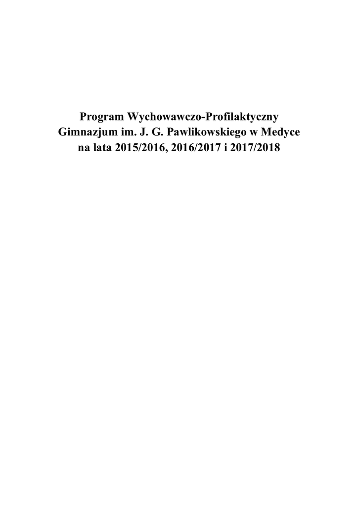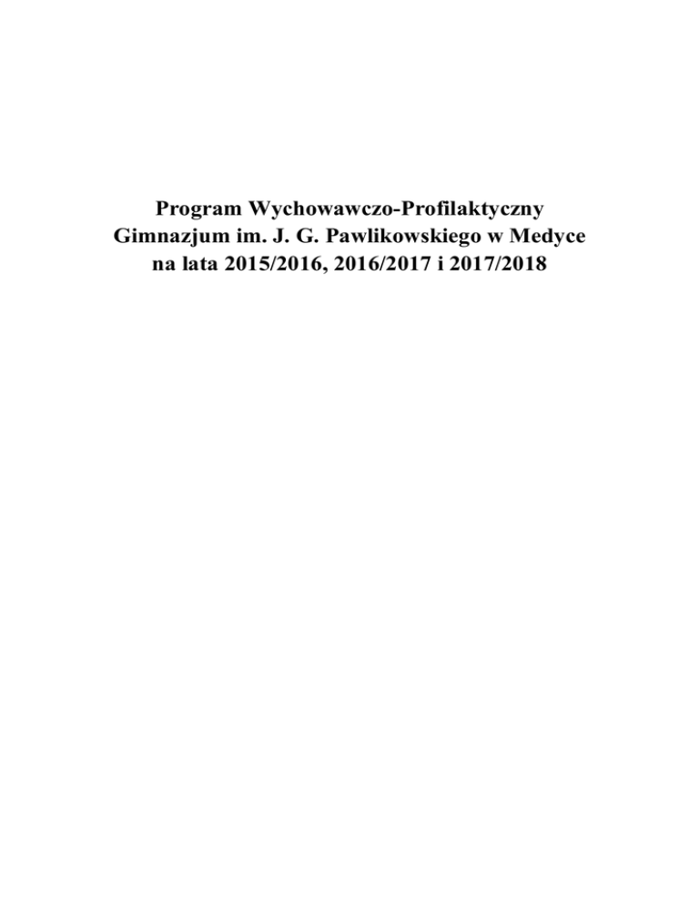 Program Wychowawczo-Profilaktyczny Gimnazjum im. J. G. Pawlikowskiego w Medyce na lata 2015/2016, 2016/2017 i 2017/2018 Wstęp Program Wychowawczo-Profilaktyczny zakłada podmiotowe traktowanie ucznia, poszanowanie godności osobistej, umożliwianie rozwoju młodzieży. Niniejszy program powstał, by przeciwdziałać negatywnym zjawiskom występującym w szkole. Jego nadrzędnym celem jest przygotowanie młodego człowieka do dokonywania wyborów takich, aby nie szkodziły ani jemu samemu, ani innym. Jest to pomoc w pracy nad samorozwojem i kształtowaniem systemu wartości młodzieży. Szkolny Program Wychowawczo-Profilaktyczny jest to program działań dydaktycznych i wychowawczych obejmujących całą społeczność szkolną (uczniów, rodziców, nauczycieli) w zakresie diagnozowania i profilaktyki problemów dzieci i młodzieży, skonstruowany dla naszej szkoły i dostosowany do jej potrzeb, oparty na diagnozie, stanowiący spójną całość z programem nauczania i koncepcją pracy szkoły, realizowany przez całą kadrę dydaktyczną szkoły. W ramach realizacji programu chcemy przygotować młodzież do zdrowego, beznałogowego, twórczego życia w zgodzie ze sobą i innymi ludźmi. Szkolny Program Wychowawczo-Profilaktyczny opracowany został na podstawie dokonanej diagnozy sytuacji dydaktyczno-wychowawczej w szkole przy użyciu następujących narzędzi: ankiet, rozmów indywidualnych, obserwacji, analizy osiągnięć szkolnych, analizy dokumentacji szkolnej dotyczacej interwencji profilaktyczno-wychowawczej. Na podstawie obserwacji środowiska szkolnego i przeprowadzonej diagnozy dokonano werbalizacji problemów w sześciu obszarach. 1. Naruszania dyscypliny szkolnej- niska frekwencja na lekcjach, wagary (przyjazd drugim kursem, spóźnienia, ucieczki z pojedyńczych lekcji), łamanie zasad regulaminów szkolnych- np. używanie telefonów komórkowych, makijaż, strój 2. Przejawów niedostosowania społecznego w środowisku uczniowskim- wulgaryzmy, umieszczanie na portalach społecznościowych treści nieakceptowanych spłecznie oraz używanie alkoholu i innych środków odurzajacych ( narkotyki, dopalacze), palenie papierosów. 3. Agresji i przemocy rówieśniczej- bójki, wymuszania, wyzwiska, stalking. 4. Bezpieczeństwa i zdrowia uczniów w szkole i poza nią oraz podczas dojazdu autobusem szkolnym. 5. Niezdrowe nawyki żywieniowe. 6. Niski poziom czytelnictwa wśród młodzieży. Pracą wychowawczo - profilaktyczną należy objąć: • całą społeczność uczniowską • rodziców i całe rodziny • kadrę pedagogiczną 2 Sytuacja materialna wielu rodzin jest bardzo trudna, a duża cześć uczniów jest objęta opieką pomocy społecznej. Rodzice większości uczniów pracują zawodowo. Rodzice oczekują od Szkoły bogatej oferty zajęć dydaktycznych, zajęć dydaktyczno-wyrównawczych, rozwijających zainteresowania oraz zapewnienia uczniom bezpiecznych warunków edukacyjnych i wychowawczych oraz promowania zdrowego stylu życia. Z przeprowadzonych badań wynika, że w Szkole występują niewłaściwe postawy, takie jak: • • • • • • brak szacunku dla dorosłych i kolegów, agresja słowna i fizyczna, niszczenie mienia szkolnego i otoczenia, palenie papierosów używanie wulgaryzmów, zbyt częste opuszczanie zajęć lekcyjnych ( niska frekwencja). Przeprowadzone ankiety wykazały, że: atmosfera panująca na niektórych zajęciach nie sprzyja procesowi uczenia się, zbyt duża grupa uczniów nie wykorzystuje oferty edukacyjnej szkoły w postaci zajeć pozalekcyjnych, istnieją w szkole miejsca, w których najczęściej dochodzi do niewłaściwych zachowań, relacje pomiedzy członkami społeczności szkolnej nie są oparte na wzajemnym szacunku i zaufaniu, uczniowie nie zawsze przestrzegaja norm i regulaminów obowiazujących na terenie szkoły, małe zaangażowanie niektórych rodziców w rozwiazywanie problemów swoich dzieci. Nauczyciele w swojej pracy wychowawczej uzupełniają w tym zakresie obowiązki rodziców, wspomagają ich oraz współdziałają z nimi. Jednym z najważniejszych zadań wychowawczo- profilaktycznych jest wspomaganie wszechstronnego rozwoju wychowanków. Program ten stanowi wytyczne do pracy wychowawczej i profilaktycznej dla dyrektora Szkoły, wychowawców klas, nauczycieli przedmiotów, pedagoga szkolnego, samorządu uczniowskiego, pracowników niepedagogicznych oraz organizacji i instytucji wspomagających pracę Szkoły. Realizacja założeń programowych wpłynie na spójność i wielokierunkowość oddziaływań skierowanych do uczniów. 1. Podstawa prawna programu wychowawczego: • • Konwencja o ochronie praw człowieka i podstawowych wolności (Dz.U. z 1993 r. Nr 61 poz. 284 ze zm.), Konwencja o prawach dziecka przyjęta przez Zgromadzenie Ogólne Narodów Zjednoczonych (Dz.U. z 1991 r. Nr 120 poz. 526.), 3 • Konstytucja Rzeczypospolitej Polskiej z dnia 2 kwietnia 1997 r. uchwalona przez Zgromadzenie Narodowe w dniu 2 kwietnia 1997 r., przyjęta przez Naród w referendum konstytucyjnym w dniu 25 maja 1997 r., podpisana przez Prezydenta Rzeczypospolitej Polskiej w dniu 16 lipca 1997 r. (t.j. Dz.U. z 1997 r. Nr 78 poz. 483 ze zm.), • Ustawa z dnia 7 września 1991 r. o systemie oświaty (t.j. Dz.U. z 2004 r. Nr 256 poz. 2572 ze zm.), • Ustawa z dnia 26 stycznia 1982 r. Karta nauczyciela (t.j. Dz.U. z 2014 r. poz. 191), • Rozporządzenie Ministra Edukacji Narodowej z dnia 7 lutego 2012 r. w sprawie ramowych statutów publicznego przedszkola oraz publicznych szkół (Dz.U. z 2012 r. poz. 204 ze zm.), • Rozporządzenie Ministra Edukacji Narodowej z dnia 27 sierpnia 2012 r. w sprawie podstawy programowej wychowania przedszkolnego oraz kształcenia ogólnego w poszczególnych typach szkół (Dz.U. z 2012 r. poz. 977 ze zm.), • Rozporządzenie Ministra Edukacji Narodowej z dnia 10 maja 2013 r. w sprawie nadzoru pedagogicznego (Dz.U. z 2013 r. poz. 560), • Rozporządzenie Ministra Edukacji Narodowej z dnia 17 lis