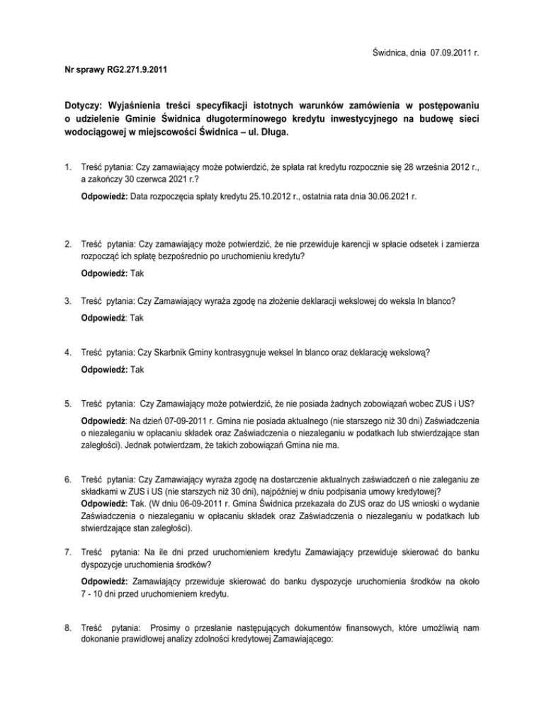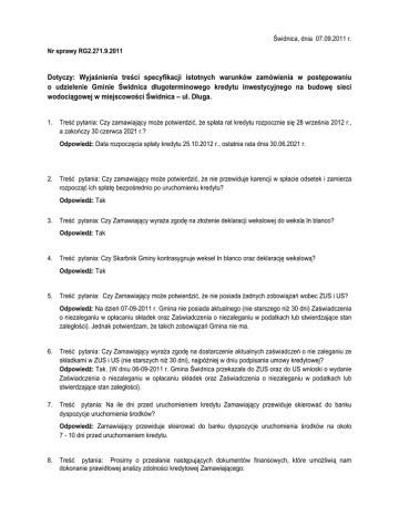 Świdnica, dnia 07.09.2011 r. Nr sprawy RG2.271.9.2011 Dotyczy: Wyjaśnienia treści specyfikacji istotnych warunków zamówienia w postępowaniu o udzielenie Gminie Świdnica długoterminowego kredytu inwestycyjnego na budowę sieci wodociągowej w miejscowości Świdnica – ul. Długa. 1. Treść pytania: Czy zamawiający moŜe potwierdzić, Ŝe spłata rat kredytu rozpocznie się 28 września 2012 r., a zakończy 30 czerwca 2021 r.? Odpowiedź: Data rozpoczęcia spłaty kredytu 25.10.2012 r., ostatnia rata dnia 30.06.2021 r. 2. Treść pytania: Czy zamawiający moŜe potwierdzić, Ŝe nie przewiduje karencji w spłacie odsetek i zamierza rozpocząć ich spłatę bezpośrednio po uruchomieniu kredytu? Odpowiedź: Tak 3. Treść pytania: Czy Zamawiający wyraŜa zgodę na złoŜenie deklaracji wekslowej do weksla In blanco? Odpowiedź: Tak 4. Treść pytania: Czy Skarbnik Gminy kontrasygnuje weksel In blanco oraz deklarację wekslową? Odpowiedź: Tak 5. Treść pytania: Czy Zamawiający moŜe potwierdzić, Ŝe nie posiada Ŝadnych zobowiązań wobec ZUS i US? Odpowiedź: Na dzień 07-09-2011 r. Gmina nie posiada aktualnego (nie starszego niŜ 30 dni) Zaświadczenia o niezaleganiu w opłacaniu składek oraz Zaświadczenia o niezaleganiu w podatkach lub stwierdzające stan zaległości). Jednak potwierdzam, Ŝe takich zobowiązań Gmina nie ma. 6. Treść pytania: Czy Zamawiający wyraŜa zgodę na dostarczenie aktualnych zaświadczeń o nie zaleganiu ze składkami w ZUS i US (nie starszych niŜ 30 dni), najpóźniej w dniu podpisania umowy kredytowej? Odpowiedź: Tak. (W dniu 06-09-2011 r. Gmina Świdnica przekazała do ZUS oraz do US wnioski o wydanie Zaświadczenia o niezaleganiu w opłacaniu składek oraz Zaświadczenia o niezaleganiu w podatkach lub stwierdzające stan zaległości). 7. Treść pytania: Na ile dni przed uruchomieniem kredytu Zamawiający przewiduje skierować do banku dyspozycje uruchomienia środków? Odpowiedź: Zamawiający przewiduje skierować do banku dyspozycje uruchomienia środków na około 7 - 10 dni przed uruchomieniem kredytu. 8. Treść pytania: Prosimy o przesłanie następujących dokumentów finansowych, które umoŜliwią nam dokonanie prawidłowej analizy zdolności kredytowej Zamawiającego: • Rb-NDS za 2010 rok, • Rb-Z za 2010 rok, • Rb-27-S za 2010 rok, • Rb-28-S za 2010 rok, • Rb-Z za II kwartał 2011 roku, • Rb-27S za II kwartał 2011 roku, • Rb-28 S za II kwartał 2011 r., Odpowiedź: Odpowiedź: Informacje jak wyŜej znajdują się na stronie BIP zamawiającego (dokumenty uzupełniające do przetargu). • aktualne Zaświadczenie o niezaleganiu ze składkami ZUS i US nie starsze niŜ 30 dni), Odpowiedź: W dniu 06-09-2011 r. Gmina Świdnica przekazała do ZUS oraz do US wnioski o wydanie Zaświadczenia o niezaleganiu w opłacaniu składek oraz Zaświadczenia o niezaleganiu w podatkach lub stwierdzające stan zaległości. • opinia RIO o projekcie budŜetu na rok 2011, • opinie RIO o projekcie uchwały w sprawie Wieloletniej Prognozy Finansowej, • opinia RIO o wykonaniu budŜetu za rok 2010, • opinia RIO o moŜliwości spłaty kredytu. Odpowiedź: Informacje jak wyŜej znajdują się na stronie BIP zamawiającego (dokumenty uzupełniające do przetargu). 9. Treść pytania: Prosimy równieŜ o dostarczenie następujących dokumentów: • Akt o wyborze Wójta, • Uchwała Rady o powołaniu Skarbnika, • Zaświadczenie o nadaniu Gminie statystycznego numeru indentyfikacyjnego REGON, • Zaświadczenie o nadaniu numeru identyfikacji podatkowej NIP, Odpowiedź: Informacje jak wyŜej znajdują się na stronie BIP zamawiającego (dokumenty uzupełniające do przetargu). 10. Treść pytania: Aktualna prognoza długu i spłat na rok 2011 i lata następne zawartej w zestawieniu przepływów pienięŜnych, o którym dokumencie mowa w Uchwale RIO nr 440/2011 z 11.08.2011 r. Odpowiedź: Informacje jak wyŜej znajdują się na stronie BIP zamawiającego (dokumenty uzupełniające do przetargu). 11. Ponadto proszę o umieszczenie dalszego ciągu uchwały RIO nr 440/2011 umieszczonej na stronie Gminy. Odpowiedź: Informacje jak wyŜej znajdują się na stronie BIP zamawiającego (dokumenty uzupełniające do przetargu).
