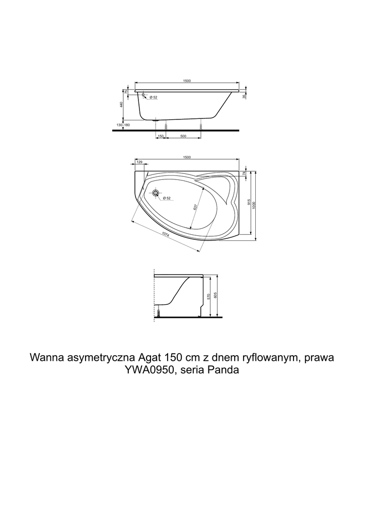35 75 1500 440 ¨ 52 130–180 150 500 1500 74 129 6 37 915 1000 Ø 52 605 4 570 107 Wanna asymetryczna Agat 150 cm z dnem ryflowanym, prawa YWA0950, seria Panda