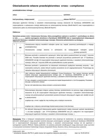 Oświadczenie własne przedsiębiorstwa cross - compliance przedsiębiorstwa rolnego _________________________________________________________________ _______________________________________ państwo __________________________ ulica: kod pocztowy, miejscowość ____________________________ obszar NUTS II* ___________________ dotyczące zgodności biomasy z zasadami zrównoważonego rozwoju stosownie do Dyrektywy 2009/28/WE (lub rozporządzenia o wytwarzaniu energii elektrycznej ze zrównoważonej biomasy (BioSt-NachV) oraz rozporządzenia o wytwarzaniu paliw ze zrównoważonej biomasy (Biokraft-NachV) Odbiorca: ____________________________________________________________________________ Uprawiana przeze mnie i dostarczana biomasa, którą szczegółowo opisano w punkcie 1, pochodząca ze zbioru w roku _______, spełnia wymagania określone w Dyrektywie 2009/28/WE (lub w rozporządzeniach dotyczących zgodności biomasy z zasadami zrównoważonego rozwoju). Stosowne potwierdzenia są dostępne. (właściwe zakreślić) 1. lub Oświadczenie dotyczy wszelkich rodzajów upraw (np. rzepak, pszenica) pochodzących z mojego przedsiębiorstwa. Oświadczenie zostaje złożone w odniesieniu do następujących rodzajów upraw: _________________________________________________________ (proszę wymienić!) 2. Biomasa pochodzi z powierzchni uprawnych, które były takimi powierzchniami już przed 1 stycznia 2008 roku. Ponadto biomasa nie pochodzi z cennych przyrodniczo powierzchni (art. 17 Dyrektywy 2009/28/WE lub §§ 4-6 rozporządzeń dotyczących zgodności biomasy z zasadami zrównoważonego rozwoju), które po 1 stycznia 2008 roku przekształcono w pola uprawne. 3. Biomasa pochodzi z powierzchni na obszarach chronionych (wyłącznie rezerwaty przyrody – bez rezerwatów wodnych), wobec których wydano zezwolenie na ich zagospodarowanie. Przestrzega się nakazów dotyczących obszarów chronionych. 4. Jako odbiorca dopłat bezpośrednich podlegam Cross-Compliance. Tym samym biomasa spełnia kryteria dotyczące zagospodarowania rolnego (art. 17 Dyrektywy 2009/28/WE lub §§ 7 i 51 rozporządzeń dotyczących zgodności biomasy z zasadami zrównoważonego rozwoju.) W roku ubiegłym uczestniczyłem w procedurze dopłat bezpośrednich z Unii Europejskiej. Posiadam decyzję o przyznaniu dotacji. Na ten rok kalendarzowy złożę wniosek o przyznanie dotacji. Dokumentacja dotycząca miejsca uprawy biomasy (potwierdzenie za pomocą ciągu poligonowego 5. stosownie do § 26 rozporządzeń dotyczących zgodności biomasy z zasadami zrównoważonego lub rozwoju lub porównywalnych potwierdzeń powierzchniowych dotyczących ciągów pól, działek lub pól w płodozmianie) znajduje się u mnie i wgląd do niej możliwy jest w każdym momencie. znajduje się u nabywcy pierwotnego dostarczanej przeze mnie biomasy. 6. Do obliczeń dotyczących bilansowania gazów cieplarnianych należy stosować wartość standardową – o ile taka występuje – (art. 17/19 Dyrektywy 2009/28/WE lub § 8 i załącznik 2 do rozporządzeń dotyczących zgodności biomasy z zasadami zrównoważonego rozwoju. ) Wskazówka: Wraz z niniejszym oświadczeniem producent rolny przyjmuje do wiadomości, że audytorzy akredytowanych jednostek certyfikujących mogą prowadzić kontrole dotyczące przestrzegania wymagań określonych Dyrektywie 2009/28/WE lub w rozporządzeniach dotyczących zgodności biomasy z zasadami zrównoważonego rozwoju lub też zgodności z wymaganiami systemu REDcert. Należy podkreślić, że audytorzy jednostek certyfikujących mogą wykonywać swoje czynności w towarzystwie kontrolerów Federalnego Instytutu Gospodarki Rolnej i Żywienia, którzy obserwują pracę audytorów. _______________________ ____________________________ miejscowość, data podpis * określenie obszaru NUTS-II, jeżeli znane lub wypełnia nabywca pierwotny: stan na 18.05.2012r.