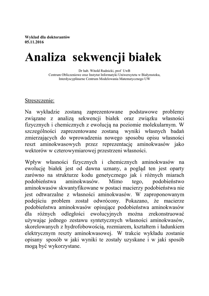 Wykład dla doktorantów 05.11.2016 Analiza sekwencji białek Dr hab. Witold Rudnicki, prof UwB Centrum Obliczeniowe oraz Instytut Informatyki Uniwersytetu w Białymstoku, Interdyscyplinarne Centrum Modelowania Matematycznego UW Streszczenie: Na wykładzie zostaną zaprezentowane podstawowe problemy związane z analizą sekwencji białek oraz związku własności fizycznych i chemicznych z ewolucją na poziomie molekularnym. W szczególności zaprezentowane zostaną wyniki własnych badań zmierzających do wprowadzenia nowego sposobu opisu własności reszt aminokwasowych przez reprezentację aminokwasów jako wektorów w czterowymiarowej przestrzeni własności. Wpływ własności fizycznych i chemicznych aminokwasów na ewolucję białek jest od dawna uznany, a pogląd ten jest oparty zarówno na strukturze kodu genetycznego jak i różnych miarach podobieństwa aminokwasów. Mimo tego, podobieństwo aminokwasów skwantyfikowane w postaci macierzy podobieństwa nie jest odtwarzalne z własności aminokwasów. W zaproponowanym podejściu problem został odwrócony. Pokazano, że macierze podobieństwa aminokwasów opisujące podobieństwa aminokwasów dla różnych odległości ewolucyjnych można zrekonstruować używając jednego zestawu syntetycznych własności aminokwasów, skorelowanych z hydrofobowością, rozmiarem, kształtem i ładunkiem elektrycznym reszty aminokwasowej. W trakcie wykładu zostanie opisany sposób w jaki wyniki te zostały uzyskane i w jaki sposób mogą być wykorzystane.