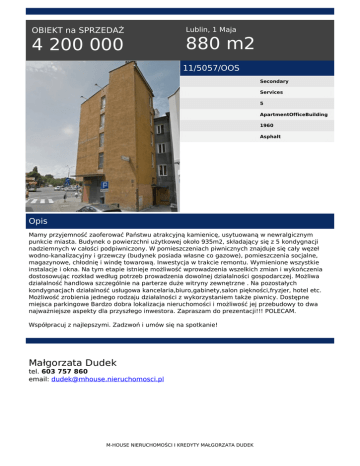 OBIEKT na SPRZEDAŻ 4 200 000 Lublin, 1 Maja 880 m2 11/5057/OOS Secondary Services 5 ApartmentOfficeBuilding 1960 Asphalt Opis Mamy przyjemność zaoferować Państwu atrakcyjną kamienicę, usytuowaną w newralgicznym punkcie miasta. Budynek o powierzchni użytkowej około 935m2, składający się z 5 kondygnacji nadziemnych w całości podpiwniczony. W pomieszczeniach piwnicznych znajduje się cały węzeł wodno-kanalizacyjny i grzewczy (budynek posiada własne co gazowe), pomieszczenia socjalne, magazynowe, chłodnię i windę towarową. Inwestycja w trakcie remontu. Wymienione wszystkie instalacje i okna. Na tym etapie istnieje możliwość wprowadzenia wszelkich zmian i wykończenia dostosowując rozkład według potrzeb prowadzenia dowolnej działalności gospodarczej. Możliwa działalność handlowa szczególnie na parterze duże witryny zewnętrzne . Na pozostałych kondygnacjach działalność usługowa kancelaria,biuro,gabinety,salon piękności,fryzjer, hotel etc. Możliwość zrobienia jednego rodzaju działalności z wykorzystaniem także piwnicy. Dostępne miejsca parkingowe Bardzo dobra lokalizacja nieruchomości i możliwość jej przebudowy to dwa najważniejsze aspekty dla przyszłego inwestora. Zapraszam do prezentacji!!! POLECAM. Współpracuj z najlepszymi. Zadzwoń i umów się na spotkanie! Małgorzata Dudek tel. 603 757 860 email: [email protected] M-HOUSE NIERUCHOMOŚCI I KREDYTY MAŁGORZATA DUDEK Powered by TCPDF (www.tcpdf.org)