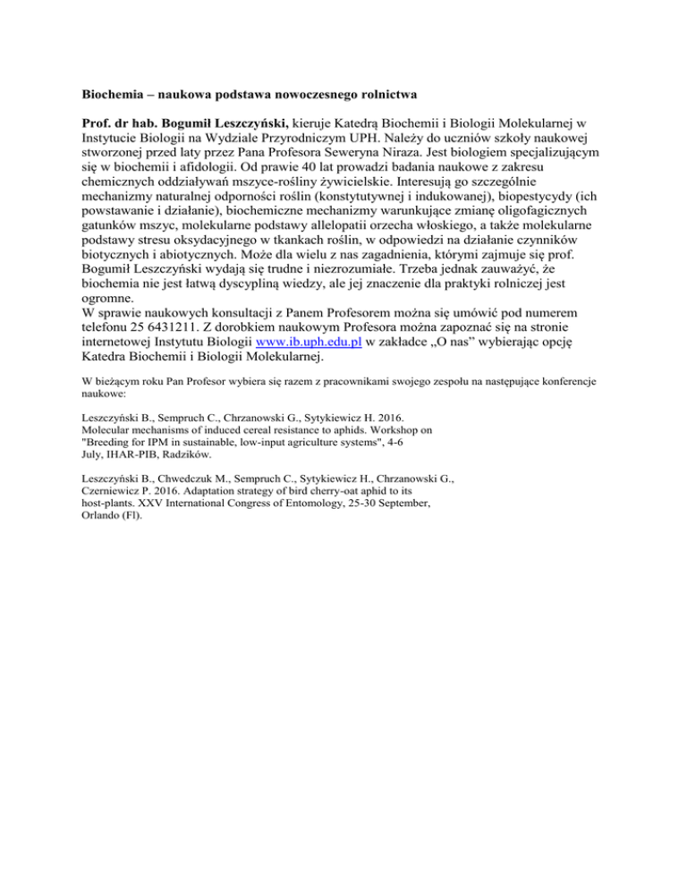 Biochemia – naukowa podstawa nowoczesnego rolnictwa Prof. dr hab. Bogumił Leszczyński, kieruje Katedrą Biochemii i Biologii Molekularnej w Instytucie Biologii na Wydziale Przyrodniczym UPH. Należy do uczniów szkoły naukowej stworzonej przed laty przez Pana Profesora Seweryna Niraza. Jest biologiem specjalizującym się w biochemii i afidologii. Od prawie 40 lat prowadzi badania naukowe z zakresu chemicznych oddziaływań mszyce-rośliny żywicielskie. Interesują go szczególnie mechanizmy naturalnej odporności roślin (konstytutywnej i indukowanej), biopestycydy (ich powstawanie i działanie), biochemiczne mechanizmy warunkujące zmianę oligofagicznych gatunków mszyc, molekularne podstawy allelopatii orzecha włoskiego, a także molekularne podstawy stresu oksydacyjnego w tkankach roślin, w odpowiedzi na działanie czynników biotycznych i abiotycznych. Może dla wielu z nas zagadnienia, którymi zajmuje się prof. Bogumił Leszczyński wydają się trudne i niezrozumiałe. Trzeba jednak zauważyć, że biochemia nie jest łatwą dyscypliną wiedzy, ale jej znaczenie dla praktyki rolniczej jest ogromne. W sprawie naukowych konsultacji z Panem Profesorem można się umówić pod numerem telefonu 25 6431211. Z dorobkiem naukowym Profesora można zapoznać się na stronie internetowej Instytutu Biologii www.ib.uph.edu.pl w zakładce „O nas” wybierając opcję Katedra Biochemii i Biologii Molekularnej. W bieżącym roku Pan Profesor wybiera się razem z pracownikami swojego zespołu na następujące konferencje naukowe: Leszczyński B., Sempruch C., Chrzanowski G., Sytykiewicz H. 2016. Molecular mechanisms of induced cereal resistance to aphids. Workshop on "Breeding for IPM in sustainable, low-input agriculture systems", 4-6 July, IHAR-PIB, Radzików. Leszczyński B., Chwedczuk M., Sempruch C., Sytykiewicz H., Chrzanowski G., Czerniewicz P. 2016. Adaptation strategy of bird cherry-oat aphid to its host-plants. XXV International Congress of Entomology, 25-30 September, Orlando (Fl).
