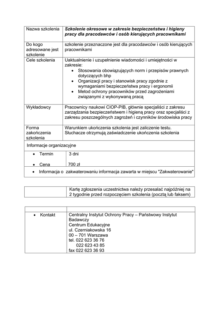 Nazwa szkolenia Szkolenie okresowe w zakresie bezpieczeństwa i higieny pracy dla pracodawców i osób kierujących pracownikami Do kogo adresowane jest szkolenie Cele szkolenia szkolenie przeznaczone jest dla pracodawców i osób kierujących pracownikami Wykładowcy Pracownicy naukowi CIOP-PIB, głównie specjaliści z zakresu zarządzania bezpieczeństwem i higieną pracy oraz specjaliści z zakresu poszczególnych zagrożeń i czynników środowiska pracy Forma zakończenia szkolenia Warunkiem ukończenia szkolenia jest zaliczenie testu. Słuchacze otrzymują zaświadczenie ukończenia szkolenia Uaktualnienie i uzupełnienie wiadomości i umiejętności w zakresie: • Stosowania obowiązujących norm i przepisów prawnych dotyczących bhp • Organizacji pracy i stanowisk pracy zgodnie z wymaganiami bezpieczeństwa pracy i ergonomii • Metod ochrony pracowników przed zagrożeniami związanymi z wykonywaną pracą Informacje organizacyjne • Termin 3 dni • Cena 700 zł • Informacja o zakwaterowaniu informacja zawarta w miejscu "Zakwaterowanie" Kartę zgłoszenia uczestnictwa należy przesalać najpóźniej na 2 tygodnie przed rozpoczęciem szkolenia (pocztą lub faksem) • Kontakt Centralny Instytut Ochrony Pracy – Państwowy Instytut Badawczy Centrum Edukacyjne ul. Czerniakowska 16 00 – 701 Warszawa tel. 022 623 36 76 022 623 43 85 fax 022 623 36 93