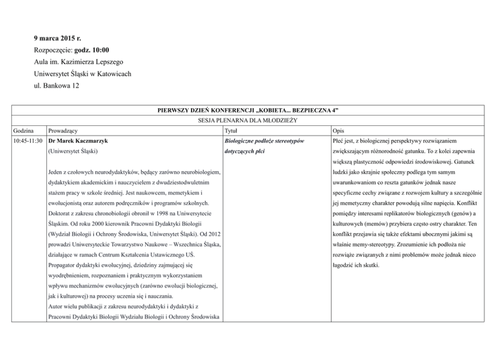 9 marca 2015 r. Rozpoczęcie: godz. 10:00 Aula im. Kazimierza Lepszego Uniwersytet Śląski w Katowicach ul. Bankowa 12 PIERWSZY DZIEŃ KONFERENCJI „KOBIETA... BEZPIECZNA 4” SESJA PLENARNA DLA MŁODZIEŻY Godzina Prowadzący Tytuł Opis 10:45-11:30 Dr Marek Kaczmarzyk Biologiczne podłoże stereotypów Płeć jest, z biologicznej perspektywy rozwiązaniem (Uniwersytet Śląski) dotyczących płci zwiększającym różnorodność gatunku. To z kolei zapewnia większą plastyczność odpowiedzi środowiskowej. Gatunek Jeden z czołowych neurodydaktyków, będący zarówno neurobiologiem, ludzki jako skrajnie społeczny podlega tym samym dydaktykiem akademickim i nauczycielem z dwudziestodwuletnim uwarunkowaniom co reszta gatunków jednak nasze stażem pracy w szkole średniej. Jest naukowcem, memetykiem i specyficzne cechy związane z rozwojem kultury a szczególnie ewolucjonistą oraz autorem podręczników i programów szkolnych. jej memetyczny charakter powodują silne napięcia. Konflikt Doktorat z zakresu chronobiologii obronił w 1998 na Uniwersytecie pomiędzy interesami replikatorów biologicznych (genów) a Śląskim. Od roku 2000 kierownik Pracowni Dydaktyki Biologii kulturowych (memów) przybiera często ostry charakter. Ten (Wydział Biologii i Ochrony Środowiska, Uniwersytet Śląski). Od 2012 konflikt przejawia się także efektami ubocznymi jakimi są prowadzi Uniwersyteckie Towarzystwo Naukowe – Wszechnica Śląska, właśnie memy-stereotypy. Zrozumienie ich podłoża nie działające w ramach Centrum Kształcenia Ustawicznego UŚ. rozwiąże związanych z nimi problemów może jednak nieco Propagator dydaktyki ewolucyjnej, dziedziny zajmującej się łagodzić ich skutki. wyodrębnieniem, rozpoznaniem i praktycznym wykorzystaniem wpływu mechanizmów ewolucyjnych (zarówno ewolucji biologicznej, jak i kulturowej) na procesy uczenia się i nauczania. Autor wielu publikacji z zakresu neurodydaktyki i dydaktyki z Pracowni Dydaktyki Biologii Wydziału Biologii i Ochrony Środowiska Uniwersytetu Śląskiego. Uczestnik wielu konferencji krajowych i międzynarodowych dotyczących m.in. neurodydaktyki, edukacji i dydaktyki Przewodniczący Komitetu Naukowego Międzynarodowego Sympozjum Naukowego Neurodydaktyki, redaktor naczelny czasopisma naukowo-dydaktycznego Neurodydaktyka. Praktyka Badania - Dialog, administrator fanepage'a Neurodydaktyka doktora Kaczmarzykapopularyzującego wiedzę neurodydaktyczną. 11:30-12:15 Mgr Michał Trojnar Psychoterapeuta, socjolog, realizator programu korekcyjno- Jak mogą zmienić się mężczyźni stosujący Bezpieczeństwu kobiet zagrażają mężczyźni stosujący przemoc wobec kobiet? Model Duluth w przemoc ze względu na płeć, której strukturalnym elementem pracy ze sprawcami przemocy domowej jest przemoc domowa. Przemoc używana przez mężczyzn edukacyjnego dla mężczyzn stosujących przemoc wobec kobiet. wynika bezpośrednio z procesu socjalizacji i jest Pracuje w Ośrodku Interwencji Kryzysowej w Rudzie Śląskiej, w funkcjonalnym składnikiem społeczno-kulturowej tożsamości Ośrodku Leczenia Depresji i Nerwic "Sikornik" Centrum Zdrowia mężczyzn. Psychicznego, oraz w Ośrodku Psychoterapii „Dąbrówka w Katowicach”. Celem referatu jest przedstawienie koncepcji, metodyki oraz wyników pracy z mężczyznami stosującymi przemoc wobec Pracuje ze sprawcami przemocy domowej w kontekście tzw. modelu kobiet, prowadzonej w ramach programu korekcyjno- społeczno-kulturowego, oraz, w ramach pracy psychoterapeutycznej, edukacyjnego dla sprawców przemocy w rodzinie. m. in. z osobami cierpiącymi wskutek konsekwencji doświadczenia traumy przemocy. Autor przedstawi założenia i metody realizacji amerykańskiego programu Duluth (The Duluth Model, W 2013 r. przedstawiał efekty pracy z mężczyznami stosującymi Domestic Abuse Intervention Project) zaadaptowanego do przemocy wobec kobiet na Kongresie Kobiet Polskich. polskich warunków, prowadzonego w ramach organizacji samorządowej - Ośrodka Interwencji Kryzysowej w Rudzie Śląskiej oraz wnioski dotyczące podstaw tworzenia lokalnego systemu przeciwdziałania przemocy wobec kobiet. 12:45-13:45 Dr n. med. Iwona Dzieńdziora Profilaktyka zdrowotna kobiet Profilaktyka zdrowotna to działania mające na celu zapobieganie chorobom poprzez ich wczesne wykrycie i Doktor nauk medycznych, dyscyplina: biologia medyczna. Specjalność: leczenie. Niezmiernie istotne jest utrwalanie prawidłowych epidemiologia, histopatologia. Śląski Uniwersytet Medyczny w wzorców zdrowego stylu życia nie tylko u siebie, ale również Katowicach, Wydział Lekarski z Oddziałem Lekarsko-Dentystycznym u naszych najbliższych, a nawet partnerów. Zwiększenie w Zabrzu, Katedra i Zakład Patomorfologii w Zabrzu. Członek świadomości partnerów, na temat potencjalnego zagrożenia Polskiego Towarzystwa Patologów. Magister biologii (Uniwersytet zdrowotnego jest niezmiernie ważne, aby kobiety mogły Opolski). Autorka wielu artykułów ireferatów dotyczących czynników zachować zdrowie. Na zajęciach uczestnicy zdobędą wiedzę z biologicznych oraz zagadnień medycznych. Koordynator Kampanii zakresu profilaktyki i leczenia chorób nowotworowych „Mam haka na raka” organizowanej przez Polską Unię Onkologów. charakterystycznych dla wieku młodzieńczego. Dowiedzą się Wykładowca akademicki w zakresie nauk medycznych: anatomia również czym są wirusy HVC i HPV – jak im przeciwdziałać, człowieka, fizjologia, fizjopatologia, patologia, biologia medyczna, jak rozpoznawać objawy oraz jak leczyć. histologia, zaopatrzenie ortopedyczne, edukacja motorycznozdrowotna, zarządzanie projektami zdrowotnymi, medycyna i higiena pracy, gerontologia, żywienie i odnowa biologiczna, patologia jamy ustnej, zdrowie publiczne, edukacja zdrowotna, pierwsza pomoc przedmedyczna. Promotor wielu prac licencjackich o tematyce medycznej i zdrowotnej .Obecnie pracuje jako nauczyciel akademicki oraz Dyrektor Instytutu K