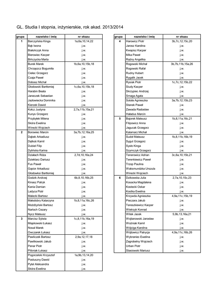 GL. Studia I stopnia, inżynierskie, rok akad. 2013/2014 grupa 1 nazwisko i imię Barczyńska Kinga 4 nazwisko i imię nr okazu Harowicz Piotr 3b,7c,12,15c,20 j.w. Jarosz Karolina j.w. Białończyk Anna j.w. Kwapisz Kacper j.w. Bierowiec Kacper j.w. Mika Paweł j.w. Bińczycka Marta j.w. Raźny Angelika j.w. 1b,6a,10,15b,18 Rogowski Michał 3b,7b,11b,15a,26 Chrząszcz Bogumiła j.w. Rogowski Rafał j.w. Cielec Grzegorz j.w. Rudny Hubert j.w. Czaja Paweł j.w. Rygalik Jacek j.w. j.w. Rysiak Piotr Dobosz Michał Głodowski Bartłomiej 1c,6a,10,15b,18 1c,7c,12,15b,22 Siudy Kacper j.w. j.w. Harabin Beata j.w. Skrzypiec Andrzej Janeczek Sebastian j.w. Smaga Agata Jazłowiecka Dominika j.w. Sotoła Agnieszka Kierzek Dawid j.w. Stanek Paweł j.w. Kołcz Justyna 2,7a,11b,15a,21 Zawada Radosław j.w. Haładus Marcin j.w. j.w. 3a,7b,12,15b,23 Kunys Grzegorz j.w. Przybyłek Milena j.w. Bajorek Mateusz 1b,8,11a,16c,21 Skóra Ewelina j.w. Filipowicz Anna j.w. Wirecki Wojciech j.w. Jagucak Grzegorz j.w. Borowiec Marcin 3a,7b,12,16a,25 Dąbek Arkadiusz j.w. Sudoł Mateusz 1b,8,11b,16b,19 Dętkoś Kamil j.w. Sygut Grzegorz j.w. Dubiel Filip j.w. Sysło Kinga j.w. Dylińska Karina j.w. Szymczyk Grzegorz j.w. Działach Róża 5 Kalamarz Michał j.w. 2,7d,10,16a,24 Tenerowicz Adrian 3c,6a,10,15b,21 Dziektarz Dariusz j.w. Terenkiewicz Paweł j.w. Fus Paweł j.w. Trzop Paulina j.w. Gąsior Arkadiusz j.w. Waksmundzka Urszula j.w. Głodowksi Bartłomiej j.w. Wirecki Wojciech Godzik Andrzej 6b,8,10,16b,25 6 Dzikowska Julia j.w. 2,7a,10,15c,23 Kinasz Patryk j.w. Kosacka Magdalena j.w. Kania Damian j.w. Kostecki Oskar j.w. Ladyca Piotr j.w. Kostka Ewelina j.w. j.w. Krzywda Agnieszka Malecki Bartosz 3 grupa Bąk Iwona Burek Marek 2 nr okazu 1a,6a,10,14,22 Małodobry Katarzyna 1b,8,11a,16c,26 Możdżyński Bartosz 4,9a,11c,15b,19 Pieczara Jakub j.w. j.w. Tereszkiewicz Kacper j.w. Narloch Cezary j.w. Wietrzyk Konrad Nycz Mateusz j.w. Witek Jacek Marcisz Sylwia 1c,8,11b,16a,19 j.w. 5,9b,13,16a,21 Wojtanowski Jarosław j.w. Miąskowski Łukasz j.w. Woźniak Kamil j.w. Nosal Marek j.w. Wójciga Karolina j.w. Owczarek Łukasz j.w. Wójtowicz Patrycja 4,9a,11c,16b,26 Pawliczek Bartosz 2,9a,12,17,18 Wybraniec Ewelina j.w. Pawlikowski Jakub j.w. Zagrobelny Wojciech j.w. Penar Piotr j.w. Urban Piotr j.w. Pilśniak Łukasz j.w. Stasiowski Mariusz j.w. Pogorzelski Krzysztof 1a,9b,13,14,20 Posłuszny Dawid j.w. Pytel Aleksandra j.w. Skóra Ewelina j.w.