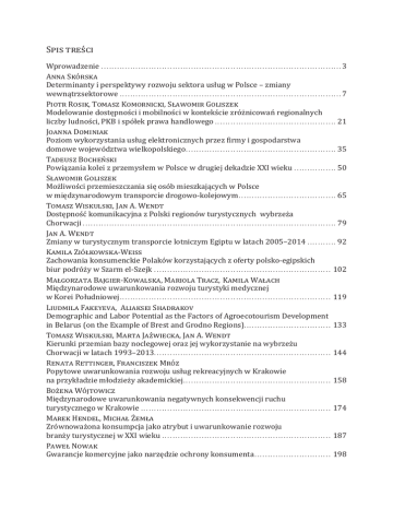 Spis treści Wprowadzenie������������������������������������������������������������������������������������������� 3 Anna Skórska Determinanty i perspektywy rozwoju sektora usług w Polsce – zmiany wewnątrzsektorowe������������������������������������������������������������������������������������ 7 Piotr Rosik, Tomasz Komornicki, Sławomir Goliszek Modelowanie dostępności i mobilności w kontekście zróżnicowań regionalnych liczby ludności, PKB i spółek prawa handlowego���������������������������������������������� 21 Joanna Dominiak Poziom wykorzystania usług elektronicznych przez firmy i gospodarstwa domowe województwa wielkopolskiego��������������������������������������������������������� 35 Tadeusz Bocheński Powiązania kolei z przemysłem w Polsce w drugiej dekadzie XXI wieku���������������� 50 Sławomir Goliszek Możliwości przemieszczania się osób mieszkających w Polsce w międzynarodowym transporcie drogowo-kolejowym������������������������������������� 65 Tomasz Wiskulski, Jan A. Wendt Dostępność komunikacyjna z Polski regionów turystycznych wybrzeża Chorwacji������������������������������������������������������������������������������������������������ 79 Jan A. Wendt Zmiany w turystycznym transporcie lotniczym Egiptu w latach 2005–2014����������� 92 Kamila Ziółkowska-Weiss Zachowania konsumenckie Polaków korzystających z oferty polsko-egipskich biur podróży w Szarm el-Szejk������������������������������������������������������������������� 102 Małgorzata Bajgier-Kowalska, Mariola Tracz, Kamila Wałach Międzynarodowe uwarunkowania rozwoju turystyki medycznej w Korei Południowej�������������������������������������������������������������������������������� 119 Liudmila Fakeyeva, Aliaksei Shadrakov Demographic and Labor Potential as the Factors of Agroecotourism Development in Belarus (on the Example of Brest and Grodno Regions)�������������������������������� 133 Tomasz Wiskulski, Marta Jaźwiecka, Jan A. Wendt Kierunki przemian bazy noclegowej oraz jej wykorzystanie na wybrzeżu Chorwacji w latach 1993–2013������������������������������������������������������������������� 144 Renata Rettinger, Franciszek Mróz Popytowe uwarunkowania rozwoju usług rekreacyjnych w Krakowie na przykładzie młodzieży akademickiej�������������������������������������������������������� 158 Bożena Wójtowicz Międzynarodowe uwarunkowania negatywnych konsekwencji ruchu turystycznego w Krakowie������������������������������������������������������������������������ 174 Marek Hendel, Michał Żemła Zrównoważona konsumpcja jako atrybut i uwarunkowanie rozwoju branży turystycznej w XXI wieku���������������������������������������������������������������� 187 Paweł Nowak Gwarancje komercyjne jako narzędzie ochrony konsumenta����������������������������� 198 Contents Introduction����������������������������������������������������������������������������������������������� 5 Anna Skóska Determinants and Perspectives of Service Sector Development in Poland – Intra-sector Changes������������������������������������������������������������������������������������ 7 Piotr Rosik, Tomasz Komornicki, Sławomir Goliszek Modeling of Accessibility and Mobility in the Context of Regional Differences in Total Population, GDP and Commercial Law Companies���������������������������������� 21 Joanna Dominiak The Level of Use of e-services by Firms and Households in Wielkopolska��������������� 35 Tadeusz Bocheński Links Between Railways and Industry in Poland in the Second Decade of the 21st century�������������������������������������������������