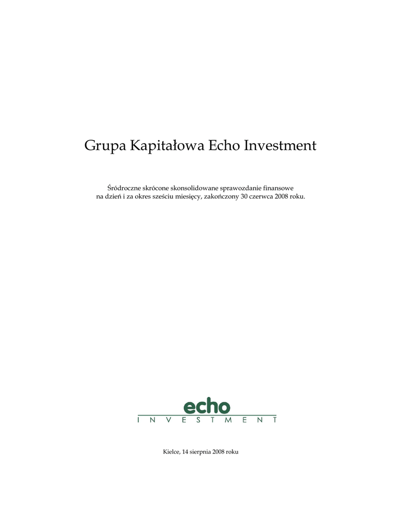 Grupa Kapitałowa Echo Investment Śródroczne skrócone skonsolidowane sprawozdanie finansowe na dzień i za okres sześciu miesięcy, zakończony 30 czerwca 2008 roku. Kielce, 14 sierpnia 2008 roku Grupa Kapitałowa Echo Investment QSr - 2Q 2008 1. Skrócony skonsolidowany bilans w tys. PLN stan na 2008.06.30 koniec kwartału stan na 2007.12.31 koniec poprzedniego roku stan na 2007.06.30 koniec kwartału Aktywa 1. Aktywa trwałe 1.1. Wartości niematerialne i prawne 1.2. Wartość firmy jednostek podporządkowanych 417 525 201 65 074 40 382 40 382 247 154 558 318 463 167 1.4. Należności długoterminowe 52 54 5 1.5. Nieruchomości inwestycyjne 1 960 518 2 034 700 2 186 416 1.6. Długoterminowe aktywa finansowe 11 005 11 000 11 450 1.7. Aktywa z tytułu odroczonego podatku dochodowego 46 351 42 176 18 322 2 641 735 2 592 004 2 503 930 477 998 455 619 312 593 2.2. Należności z tytułu podatków 25 949 46 246 24 440 2.3. Należności z tyt. dostaw i usług i inne 10 380 13 442 68 872 2.4. Krótkoterminowe inwestycje finansowe 25 073 33 478 709 7 263 3 212 5 012 238 654 394 947 396 460 785 317 946 944 808 086 3 427 052 3 538 948 3 312 016 1 557 744 1 510 535 1 406 140 1.3. Rzeczowe aktywa trwałe 2. Aktywa obrotowe 2.1. Zapasy 2.5. Rozliczenia międzyokresowe 2.6. Środki pieniężne i inne aktywa pieniężne Aktywa razem Pasywa 1. Kapitał własny 1.1. Kapitał własny przypisany akcjonariuszom jednostki dominującej 21 000 21 000 21 000 1.1.2. Kapitał zapasowy 1 598 785 985 994 985 994 1.1.3. Niepodzielony zysk (strata) z lat ubiegłych (105 443) 188 247 188 247 54 099 319 039 210 899 (10 697) (3 745) - 1.1.1. Kapitał zakładowy 1.1.4. Zysk (strata) roku bieżącego 1.1.5. Różnice kursowe z przeliczenia danych spółek zagranicznych 20 442 15 806 11 292 1 578 186 1 526 341 1 417 432 267 519 252 836 220 536 23 441 70 441 34 886 290 960 323 277 255 422 1 221 952 1 283 221 1 212 514 30 256 32 180 36 125 1 252 208 1 315 401 1 248 639 4.1. Zobowiązania finansowe 34 203 37 859 145 191 4.2. Zobowiązania podatkowe 11 510 9 245 11 384 4.3. Zobowiązania z tyt. dostaw i usług 55 443 121 352 57 525 204 542 205 473 176 423 305 698 373 929 390 523 3 427 052 3 538 948 3 312 016 1.2. Kapitały mniejszości 2. Rezerwy 2.1. Rezerwa z tytułu odroczonego podatku dochodowego 2.2. Pozostałe rezerwy 3. Zobowiązania długoterminowe 3.1. Zobowiązania finansowe 3.2. Pozostałe zobowiązania 4. Zobowiązania krótkoterminowe 4.4. Pozostałe zobowiązania Pasywa razem 2 Grupa Kapitałowa Echo Investment QSr -2Q 2008 1 557 744 1 510 535 1 406 140 420 000 000 420 000 000 420 000 000 3,71 3,60 3,35 420 000 000 420 000 000 420 000 000 Rozwodniona wartość księgowa na jedną akcję (w zł) 3,71 3,60 3,35 POZYCJE POZABILANSOWE w tys. PLN stan na 2008.06.30 koniec kwartału Wartość księgowa (w tys. zł) Liczba akcji Wartość księgowa na jedną akcję (w zł) Rozwodniona liczba akcji 1. Należności pozabilansowe 2. Zobowiązania pozabilansowe stan na 2007.12.31 koniec poprzedniego roku stan na 2007.06.30 koniec kwartału - - - 23 581 22 501 28 140 2. Skrócony skonsolidowany rachunek zysków i strat w tys. PLN Przychody operacyjne 2 kwartał okres od 2008.04.01 do 2008.06.30 91 213 2 kwartały okres od 2008.01.01 do 2008.06.30 182 845 2 kwartał okres od 2007.04.01 do 2007.06.30 125 598 2 kwartały okres od 2007.01.01 do 2007.06.30 190 991 (50 811) (91 728) (70 044) (95 293) 40 402 91 117 55 554 95 698 - - - - (23 518) (22 627) 136 137 195 903 Koszty operacyjne Zysk (strata) brutto ze sprzedaży Zysk (strata) ze sprzedaży nieruchomości Aktualizacji wartości nieruchomości Koszty sprzedaży Koszty ogólnego zarządu Pozostałe przychody (koszty) operacyjne Zysk przed opodatkowaniem i uwzględnieniem przychodów/kosztów finansowych Przychody finansowe Koszty finansowe Zysk (strata) z tytułu różnic kursowych Aktualizacja wartości firmy jednostek podporządkowanych (5 058) (10 467) (3 897) (7 643) (13 193) (22 610) (11 968) (18 177) 12 086 18 113 941 489 10 719 53 526 176 767 266 270 21 987 29 680 8 733 13 316 (26 575) (48 532) (20 648) (36 044) 33 083 39 118 23 147 19 197 - - (28) (73) (10) (25) (7) (7) Udział w zysku jednostek stowarzyszonych Zysk (strata) brutto Podatek dochodowy Zysk (strata) netto Zysk (strata) przypadający akcjonariuszom mniejszościowym Zysk (strata) przypadający akcjonariuszom jednostki dominującej 39 204 73 767 187 964 262 659 (8 041) 31 163 (15 015) 58 752 (37 629) 150 335 (51 052) 211 607 3 296 4 653 130 708 27 867 54 099 150 205 210 899 Zysk (strata) netto (zanualizowany) Średnia ważona liczba akcji zwykłych Zysk (strata)zanualizaowany na jedną akcję zwykłą (w zł) Średnia ważona rozwodniona liczba akcji zwykłych Rozwodniony zysk (strata) na jedną akcję zwykłą (w zł) 162 239 386 847 420 000 000 420 000 000 0,39 0,92 420 000 000 420 000 000 0,39 0,39 3 Grupa Kapitałowa Echo Investment QSr - 2Q 2008 3. Skrócone zestawienie zmian w skonsolidowanym kapitale własnym w tys. PLN Kapitał własny Zysk Różnice przypisany (strata) Kapitały Kapitał kursowe z akcjonariuszom roku mniejszości własny razem przeliczenia jednostki bieżącego dominującej Niepodzielony zysk (strata) z lat ubiegłych Kapitał Kapitał zakładowy zapasowy Za 2 kwartały (rok bieżący) okres od 2008.01.01 do 2008.06.30 Stan na początek okresu 21 000 985 994 507 286 (3 745) Korekty błędów podstawowych Stan na początek okresu, po uzgodnieniu do danych porównywalnych 1 510 535 15 806 1 526 341 - - 21 000 985 994 507 286 - (3 745) 1 510 535 15 806 1 526 341 Podział wyniku z lat ubiegłych - 612 791 (612 729) - - 62 - 62 Zmiany w udziałach mniejszościowych - - - - - - (17) (17) Zysk (strata) netto danego okresu - - - 54 099 (6 952) 47 147 4 653 51 800 21 000 1 598 785 (105 443) 54 099 (10 697) 1 557 744 20 442 1 578 186 2 Stan na koniec okresu Za 4 kwartały (rok poprzedni) okres od 2007.01.01 do 2007.12.31 Stan na początek okresu 21 000 538 319 635 922 - 1 195 243 10 58