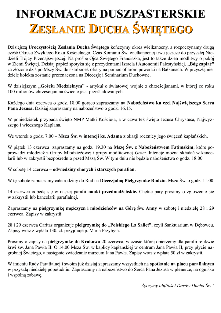 INFORMACJE DUSZPASTERSKIE ZESŁANIE DUCHA ŚWIĘTEGO Dzisiejszą Uroczystością Zesłania Ducha Świętego kończymy okres wielkanocny, a rozpoczynamy drugą część Okresu Zwykłego Roku Kościelnego. Czas Komunii Św. wielkanocnej trwa jeszcze do przyszłej Niedzieli Trójcy Przenajświętszej. Na prośbę Ojca Świętego Franciszka, jest to także dzień modlitwy o pokój w Ziemi Świętej. Dzisiaj papież spotyka się z prezydentami Izraela i Autonomii Palestyńskiej. „Bóg zapłać” za złożone dziś po Mszy Św. do skarbonek ofiary na pomoc ofiarom powodzi na Bałkanach. W przyszłą niedzielę kolekta zostanie przeznaczona na Diecezję i Seminarium Duchowne. W dzisiejszym „Gościu Niedzielnym” - artykuł o światowej wojnie z chrześcijanami, w której co roku 100 milionów chrześcijan na świecie jest prześladowanych. Każdego dnia czerwca o godz. 18.00 gorąco zapraszamy na Nabożeństwo ku czci Najświętszego Serca Pana Jezusa. Dzisiaj zapraszamy na nabożeństwo o godz. 16.15. W poniedziałek przypada święto NMP Matki Kościoła, a w czwartek święto Jezusa Chrystusa, Najwyższego i wiecznego Kapłana. We wtorek o godz. 7.00 – Msza Św. w intencji ks. Adama z okazji rocznicy jego święceń kapłańskich. W piątek 13 czerwca zapraszamy na godz. 19.30 na Mszę Św. z Nabożeństwem Fatimskim, które poprowadzi młodzież z Grupy Młodzieżowej i grupy modlitewnej Grom. Intencje można składać w kancelarii lub w zakrystii bezpośrednio przed Mszą Św. W tym dniu nie będzie nabożeństwa o godz. 18.00. W sobotę 14 czerwca – odwiedziny chorych i starszych parafian. W tę sobotę zapraszamy całe rodziny do Rud na Diecezjalną Pielgrzymkę Rodzin. Msza Św. o godz. 11.00 14 czerwca odbędą się w naszej parafii nauki przedmałżeńskie. Chętne pary prosimy o zgłoszenie się w zakrystii lub kancelarii parafialnej. Zapraszamy na pielgrzymkę mężczyzn i młodzieńców na Górę Św. Anny w sobotę i niedzielę 28 i 29 czerwca. Zapisy w zakrystii. 28 i 29 czerwca Caritas organizuje pielgrzymkę do „Polskiego La Sallet”, czyli Sanktuarium w Dębowcu. Zapisy wraz z wpłatą 130. zł. przyjmuje p. Maria Przybyła. Prosimy o zapisy na pielgrzymkę do Krakowa 20 czerwca, w czasie której obierzemy dla parafii relikwie krwi św. Jana Pawła II. O 14.00 Msza Św. w kaplicy kapłańskiej w centrum Jana Pawła II, przy płycie nagrobnej Świętego, a następnie zwiedzanie muzeum Jana Pawła. Zapisy wraz z wpłatą 50 zł w zakrystii. W imieniu Rady Parafialnej i swoim już dzisiaj zapraszamy wszystkich na spotkanie na placu parafialnym w przyszłą niedzielę popołudniu. Zapraszamy na nabożeństwo do Serca Pana Jezusa w plenerze, na ognisko i wspólną zabawę. Życzymy obfitości Darów Ducha Św.!