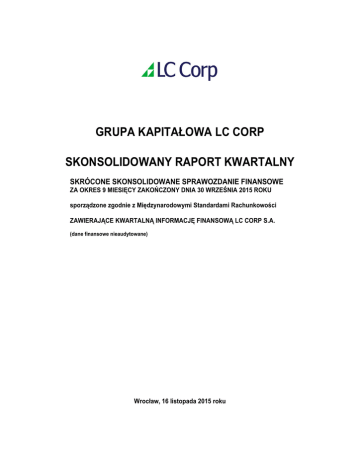 GRUPA KAPITAŁOWA LC CORP SKONSOLIDOWANY RAPORT KWARTALNY SKRÓCONE SKONSOLIDOWANE SPRAWOZDANIE FINANSOWE ZA OKRES 9 MIESIĘCY ZAKOŃCZONY DNIA 30 WRZEŚNIA 2015 ROKU sporządzone zgodnie z Międzynarodowymi Standardami Rachunkowości ZAWIERAJĄCE KWARTALNĄ INFORMACJĘ FINANSOWĄ LC CORP S.A. (dane finansowe nieaudytowane) Wrocław, 16 listopada 2015 roku Grupa Kapitałowa LC Corp QSr za III kwartał 2015 SKONSOLIDOWANY RAPORT KWARTALNY 1. WYBRANE DANE FINANSOWE ............................................................................................................................................ 5 2. ŚRÓDROCZNE SKRÓCONE SKONSOLIDOWANE SPRAWOZDANIE FINANSOWE GRUPY LC CORP ........................ 7 SKONSOLIDOWANE SPRAWOZDANIE Z SYTUACJI FINANSOWEJ .............................................................................................. 7 SKONSOLIDOWANE SPRAWOZDANIE Z CAŁKOWITYCH DOCHODÓW ...................................................................................... 8 SKONSOLIDOWANE SPRAWOZDANIE ZE ZMIAN W KAPITALE WŁASNYM............................................................................... 10 SKONSOLIDOWANE SPRAWOZDANIE Z PRZEPŁYWÓW PIENIĘŻNYCH ................................................................................... 12 DODATKOWE INFORMACJE I NOTY OBJAŚNIAJĄCE .................................................................................................................. 13 2.1. Informacje podstawowe dotyczące Grupy Kapitałowej LC Corp ............................................................................................ 13 2.2. Opis organizacji Grupy Kapitałowej LC Corp, ze wskazaniem jednostek podlegających konsolidacji, wskazanie skutków zmian w strukturze Grupy, w tym w wyniku połączeń jednostek gospodarczych, przejęcia lub sprzedaży jednostek Grupy, inwestycji długoterminowych, podziału, restrukturyzacji i zaniechania działalności ................................... 13 2.3. Zasady przyjęte przy sporządzaniu raportu kwartalnego (w szczególności informacje o zmianach stosowanych zasad/polityki rachunkowości) ................................................................................................................................................ 15 2.4. Sezonowość lub cykliczność w działalności Grupy Kapitałowej LC Corp .............................................................................. 18 2.5. Informacja o istotnych wartościach szacunkowych i profesjonalnym osądzie ....................................................................... 18 2.6. Informacja o odpisach aktualizujących wartość zapasów do wartości netto możliwej do uzyskania i odwróceniu odpisów z tego tytułu .............................................................................................................................................................. 20 2.7. Informacja o odpisach aktualizujących z tytułu trwałej utraty wartości aktywów finansowych, rzeczowych aktywów trwałych, wartości niematerialnych i prawnych lub innych aktywów oraz odwróceniu takich odpisów ................................... 20 2.8. Informacja o utworzeniu, zwiększeniu, wykorzystaniu i rozwiązaniu rezerw .......................................................................... 21 2.9. Informacje o rezerwach i aktywach z tytułu odroczonego podatku dochodowego ................................................................. 22 2.10. Informacje o istotnych transakcjach nabycia i sprzedaży rzeczowych aktywów trwałych ...................................................... 22 2.11. Informacje o istotnym zobowiązaniu z tytułu dokonania zakupu rzeczowych aktywów trwałych ........................................... 23 2.12. Informacje o istotnych rozliczeniach z tytułu spraw sądowych ............................................................................................... 23 2.13. Wykazanie korekt błędów poprzednich okresów .................................................................................................................... 23 2.14. Informacje na temat zmian sytuacji gospodarczej i warunków prowadzenia działalności, które mają istotny wpływ na wartość godziwą aktywów finansowych i zobowiązań finansowych Grupy, niezależnie czy te aktywa i zobowiązania są ujęte w wartości godziwej czy w skorygowanej cenie nabycia (koszcie amortyzowanym) ......................... 23 2.15. Informacje o niespłaceniu kredytu lub pożyczki lub naruszeniu istotnych postanowień umowy kredytu lub pożyczki, w odniesieniu do których nie podjęto żadnych działań naprawczych do końca okresu sprawozdawczego ........... 23 2.16. Informacje o zawarciu przez Emitenta lub jednostkę od niego zależną jednej lub wielu transakcji z podmiotami powiązanymi, jeżeli pojedynczo lub łącznie są one istotne i zostały zawarte na innych warunkach niż rynkowe ................. 23 2.17. Informacje o zmianie sposobu (metody) ustalania wartości godziwej dla instrumentów finansowych wycenianych w wartości godziwej ................................................................................................................................................................ 23 2.18. Informacje dotyczące zmiany w klasyfikacji aktywów finansowych w wyniku zmiany celu lub wykorzystania tych aktywów .................................................................................................................................................................................. 23 2.19. Zobowiązania finansowe ........................................................................................................................................................ 24 2.19.1 Oprocentowane kredyty bankowe i obligacje ............................................................................................................ 24 2.19.2 Inne zobowiązania z tytułu instrumentów finansowych ............................