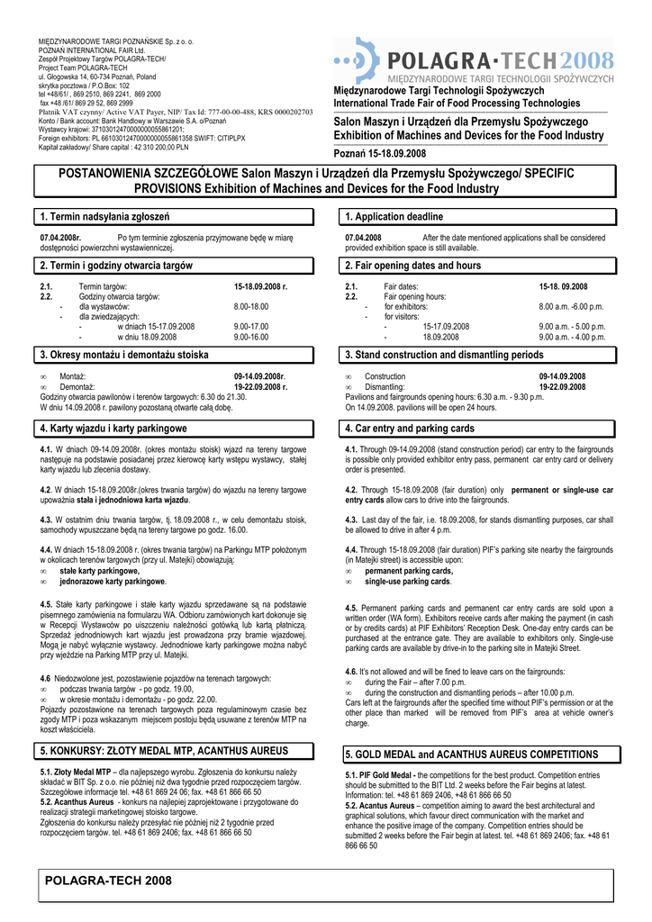 MIĘDZYNARODOWE TARGI POZNAŃSKIE Sp. z o. o. POZNAŃ INTERNATIONAL FAIR Ltd. Zespół Projektowy Targów POLAGRA-TECH/ Project Team POLAGRA-TECH ul. Głogowska 14, 60-734 Poznań, Poland skrytka pocztowa / P.O.Box: 102 tel +48/61/ , 869 2510, 869 2241, 869 2000 fax +48 /61/ 869 29 52, 869 2999 Płatnik VAT czynny/ Active VAT Payer, NIP/ Tax Id: 777-00-00-488, KRS 0000202703 Konto / Bank account: Bank Handlowy w Warszawie S.A. o/Poznań Wystawcy krajowi: 37103012470000000055861201; Foreign exhibitors: PL 66103012470000000055861358 SWIFT: CITIPLPX Kapitał zakładowy/ Share capital : 42 310 200,00 PLN Międzynarodowe Targi Technologii SpoŜywczych International Trade Fair of Food Processing Technologies ------------------------------------------------------------------------------------------------------------------------------------------------------------------------------------------------------------------------------------- Salon Maszyn i Urządzeń dla Przemysłu SpoŜywczego Exhibition of Machines and Devices for the Food Industry ------------------------------------------------------------------------------------------------------------------------------------------------------------------------------------------------------------------------------------- Poznań 15-18.09.2008 POSTANOWIENIA SZCZEGÓŁOWE Salon Maszyn i Urządzeń dla Przemysłu SpoŜywczego/ SPECIFIC PROVISIONS Exhibition of Machines and Devices for the Food Industry 1. Termin nadsyłania zgłoszeń 1. Application deadline 07.04.2008r. Po tym terminie zgłoszenia przyjmowane będę w miarę dostępności powierzchni wystawienniczej. 07.04.2008 After the date mentioned applications shall be considered provided exhibition space is still available. 2. Termin i godziny otwarcia targów 2. Fair opening dates and hours 2.1. 2.2. - Termin targów: Godziny otwarcia targów: dla wystawców: dla zwiedzających: w dniach 15-17.09.2008 w dniu 18.09.2008 15-18.09.2008 r. 8.00-18.00 9.00-17.00 9.00-16.00 2.1. 2.2. - Fair dates: Fair opening hours: for exhibitors: for visitors: 15-17.09.2008 18.09.2008 15-18. 09.2008 8.00 a.m. -6.00 p.m. 9.00 a.m. - 5.00 p.m. 9.00 a.m. - 4.00 p.m. 3. Okresy montaŜu i demontaŜu stoiska 3. Stand construction and dismantling periods • MontaŜ: 09-14.09.2008r. • DemontaŜ: 19-22.09.2008 r. Godziny otwarcia pawilonów i terenów targowych: 6.30 do 21.30. W dniu 14.09.2008 r. pawilony pozostaną otwarte całą dobę. • Construction 09-14.09.2008 • Dismantling: 19-22.09.2008 Pavilions and fairgrounds opening hours: 6.30 a.m. - 9.30 p.m. On 14.09.2008. pavilions will be open 24 hours. 4. Karty wjazdu i karty parkingowe 4. Car entry and parking cards 4.1. W dniach 09-14.09.2008r. (okres montaŜu stoisk) wjazd na tereny targowe następuje na podstawie posiadanej przez kierowcę karty wstępu wystawcy, stałej karty wjazdu lub zlecenia dostawy. 4.1. Through 09-14.09.2008 (stand construction period) car entry to the fairgrounds is possible only provided exhibitor entry pass, permanent car entry card or delivery order is presented. 4.2. W dniach 15-18.09.2008r.(okres trwania targów) do wjazdu na tereny targowe upowaŜnia stała i jednodniowa karta wjazdu. 4.2. Through 15-18.09.2008 (fair duration) only permanent or single-use car entry cards allow cars to drive into the fairgrounds. 4.3. W ostatnim dniu trwania targów, tj. 18.09.2008 r., w celu demontaŜu stoisk, samochody wpuszczane będą na tereny targowe po godz. 16.00. 4.3. Last day of the fair, i.e. 18.09.2008, for stands dismantling purposes, car shall be allowed to drive in after 4 p.m. 4.4. W dniach 15-18.09.2008 r. (okres trwania targów) na Parkingu MTP połoŜonym w okolicach terenów targowych (przy ul. Matejki) obowiązują: • stałe karty parkingowe, • jednorazowe karty parkingowe. 4.4. Through 15-18.09.2008 (fair duration) PIF’s parking site nearby the fairgrounds (in Matejki street) is accessible upon: • permanent parking cards, • single-use parking cards. 4.5. Stałe karty parkingowe i stałe karty wjazdu sprzedawane są na podstawie pisemnego zamówienia na formularzu WA. Odbioru zamówionych kart dokonuje się w Recepcji Wystawców po uiszczeniu naleŜności gotówką lub kartą płatniczą. SprzedaŜ jednodniowych kart wjazdu jest prowadzona przy bramie wjazdowej. Mogą je nabyć wyłącznie wystawcy. Jednodniowe karty parkingowe moŜna nabyć przy wjeździe na Parking MTP przy ul. Matejki. 4.5. Permanent parking cards and permanent car entry cards are sold upon a written order (WA form). Exhibitors receive cards after making the payment (in cash or by credits cards) at PIF Exhibitors’ Reception Desk. One-day entry cards can be purchased at the entrance gate. They are available to exhibitors only. Single-use parking cards are available by drive-in to the parking site in Matejki Street. 4.6 Niedozwolone jest, pozostawienie pojazdów na terenach targowych: • podczas trwania targów - po godz. 19.00, • w okresie montaŜu i demontaŜu - po godz. 22.00. Pojazdy pozostawione na terenach targowych poza regulaminowym czasie bez zgody MTP i poza wskazanym miejscem postoju będą usuwane z terenów MTP na koszt właściciela. 4.6. It’s not allowed and will be fined to leave cars on the fairgrounds: • during the Fair – after 7.00 p.m. • during the construction and dismantling periods – after 10.00 p.m. Cars left at the fairgrounds after the specified time without PIF’s permission or at the other place than marked will be removed from PIF’s area at vehicle owner’s charge. 5. KONKURSY: ZŁOTY MEDAL MTP, ACANTHUS AUREUS 5. GOLD MEDAL and ACANTHUS AUREUS COMPETITIONS 5.1. Złoty Medal MTP – dla najlepszego wyrobu. Zgłoszenia do konkursu naleŜy składać w BIT Sp. z o.o. nie później niŜ dwa tygodnie przed rozpoczęciem targów. Szczegółowe informacje tel. +48 61 869 24 06; fax. +48 61 866 66 50 5.2. Acanthus Aureus - konkurs na najlepiej zaprojektowane i przygotowane do realizacji strategii marketingo