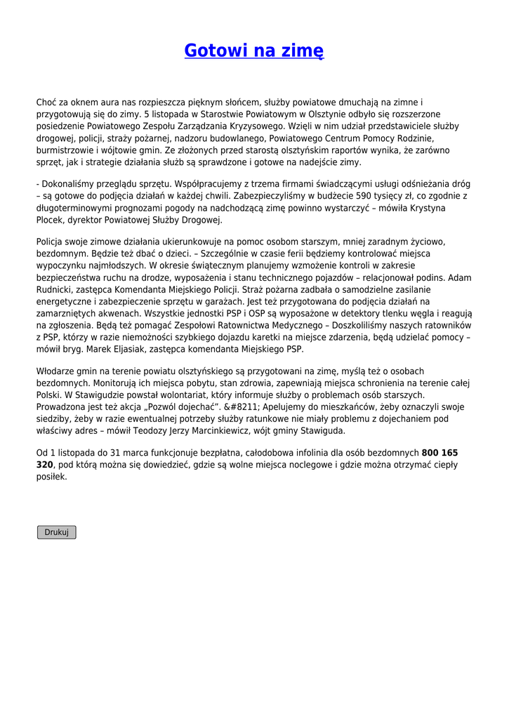 Gotowi na zimę Choć za oknem aura nas rozpieszcza pięknym słońcem, służby powiatowe dmuchają na zimne i przygotowują się do zimy. 5 listopada w Starostwie Powiatowym w Olsztynie odbyło się rozszerzone posiedzenie Powiatowego Zespołu Zarządzania Kryzysowego. Wzięli w nim udział przedstawiciele służby drogowej, policji, straży pożarnej, nadzoru budowlanego, Powiatowego Centrum Pomocy Rodzinie, burmistrzowie i wójtowie gmin. Ze złożonych przed starostą olsztyńskim raportów wynika, że zarówno sprzęt, jak i strategie działania służb są sprawdzone i gotowe na nadejście zimy. - Dokonaliśmy przeglądu sprzętu. Współpracujemy z trzema firmami świadczącymi usługi odśnieżania dróg – są gotowe do podjęcia działań w każdej chwili. Zabezpieczyliśmy w budżecie 590 tysięcy zł, co zgodnie z długoterminowymi prognozami pogody na nadchodzącą zimę powinno wystarczyć – mówiła Krystyna Plocek, dyrektor Powiatowej Służby Drogowej. Policja swoje zimowe działania ukierunkowuje na pomoc osobom starszym, mniej zaradnym życiowo, bezdomnym. Będzie też dbać o dzieci. – Szczególnie w czasie ferii będziemy kontrolować miejsca wypoczynku najmłodszych. W okresie świątecznym planujemy wzmożenie kontroli w zakresie bezpieczeństwa ruchu na drodze, wyposażenia i stanu technicznego pojazdów – relacjonował podins. Adam Rudnicki, zastępca Komendanta Miejskiego Policji. Straż pożarna zadbała o samodzielne zasilanie energetyczne i zabezpieczenie sprzętu w garażach. Jest też przygotowana do podjęcia działań na zamarzniętych akwenach. Wszystkie jednostki PSP i OSP są wyposażone w detektory tlenku węgla i reagują na zgłoszenia. Będą też pomagać Zespołowi Ratownictwa Medycznego – Doszkoliliśmy naszych ratowników z PSP, którzy w razie niemożności szybkiego dojazdu karetki na miejsce zdarzenia, będą udzielać pomocy – mówił bryg. Marek Eljasiak, zastępca komendanta Miejskiego PSP. Włodarze gmin na terenie powiatu olsztyńskiego są przygotowani na zimę, myślą też o osobach bezdomnych. Monitorują ich miejsca pobytu, stan zdrowia, zapewniają miejsca schronienia na terenie całej Polski. W Stawigudzie powstał wolontariat, który informuje służby o problemach osób starszych. Prowadzona jest też akcja „Pozwól dojechać”. – Apelujemy do mieszkańców, żeby oznaczyli swoje siedziby, żeby w razie ewentualnej potrzeby służby ratunkowe nie miały problemu z dojechaniem pod właściwy adres – mówił Teodozy Jerzy Marcinkiewicz, wójt gminy Stawiguda. Od 1 listopada do 31 marca funkcjonuje bezpłatna, całodobowa infolinia dla osób bezdomnych 800 165 320, pod którą można się dowiedzieć, gdzie są wolne miejsca noclegowe i gdzie można otrzymać ciepły posiłek. Drukuj
