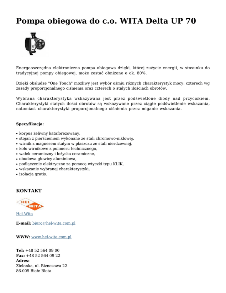 Pompa obiegowa do c.o. WITA Delta UP 70 Energooszczędna elektroniczna pompa obiegowa dzięki, której zużycie energii, w stosunku do tradycyjnej pompy obiegowej, może zostać obniżone o ok. 80%. Dzięki obsłudze "One Touch" możliwy jest wybór ośmiu różnych charakterystyk mocy: czterech wg zasady proporcjonalnego ciśnienia oraz czterech o stałych ilościach obrotów. Wybrana charakterystyka wskazywana jest przez podświetlone diody nad przyciskiem. Charakterystyki stałych ilości obrotów są wskazywane przez ciągłe podświetlenie wskazania, natomiast charakterystyki proporcjonalnego ciśnienia przez miganie wskazania. Specyfikacja: ● ● ● ● ● ● ● ● ● korpus żeliwny kataforezowany, stojan z pierścieniem wykonane ze stali chromowo-niklowej, wirnik z magnesem stałym w płaszczu ze stali nierdzewnej, koło wirnikowe z polimeru technicznego, wałek ceramiczny i łożyska ceramiczne, obudowa głowicy aluminiowa, podłączenie elektryczne za pomocą wtyczki typu KLIK, wskazanie wybranej charakterystyki, izolacja gratis. KONTAKT Hel-Wita E-mail: [email protected] WWW: www.hel-wita.com.pl Tel: +48 52 564 09 00 Fax: +48 52 564 09 22 Adres: Zielonka, ul. Biznesowa 22 86-005 Białe Błota