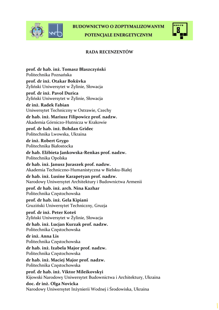 BUDOWNICTWO O ZOPTYMALIZOWANYM POTENCJALE ENERGETYCZNYM RADA RECENZENTÓW prof. dr hab. inż. Tomasz Błaszczyński Politechnika Poznańska prof. dr inż. Otakar Bokůvka Żyliński Uniwersytet w Żylinie, Słowacja prof. dr inż. Pavol Durica Żyliński Uniwersytet w Żylinie, Słowacja dr inż. Radek Fabian Uniwersytet Techniczny w Ostrawie, Czechy dr hab. inż. Mariusz Filipowicz prof. nadzw. Akademia Górniczo-Hutnicza w Krakowie prof. dr hab. inż. Bohdan Gridec Politechnika Lwowska, Ukraina dr inż. Robert Grygo Politechnika Białostocka dr hab. Elżbieta Jankowska-Renkas prof. nadzw. Politechnika Opolska dr hab. inż. Janusz Juraszek prof. nadzw. Akademia Techniczno-Humanistyczna w Bielsku-Białej dr hab. inż. Lusine Karapetyan prof. nadzw. Narodowy Uniwersytet Architektury i Budownictwa Armenii prof. dr hab. inż. arch. Nina Kazhar Politechnika Częstochowska prof. dr hab. inż. Gela Kipiani Gruziński Uniwersytet Techniczny, Gruzja prof. dr inż. Peter Koteš Żyliński Uniwersytet w Żylinie, Słowacja dr hab. inż. Lucjan Kurzak prof. nadzw. Politechnika Częstochowska dr inż. Anna Lis Politechnika Częstochowska dr hab. inż. Izabela Major prof. nadzw. Politechnika Częstochowska dr hab. inż. Maciej Major prof. nadzw. Politechnika Częstochowska prof. dr hab. inż. Viktor Mileikovskyi Kijowski Narodowy Uniwersytet Budownictwa i Architektury, Ukraina doc. dr inż. Olga Novicka Narodowy Uniwersytet Inżynierii Wodnej i Środowiska, Ukraina KBOiFB dr inż. Krzysztof Pawłowski Uniwersytet Technologiczno-Przyrodniczy w Bydgoszczy dr inż. Zdenek Perina Uniwersytet Techniczny w Ostrawie, Czechy prof. dr hab. inż. Jerzy Zbigniew Piotrowski Politechnika Świętokrzyska prof. dr hab. inż. Waldemar Pyda Akademia Górniczo-Hutnicza w Krakowie dr hab. inż. Adam Rak prof. nadzw. Politechnika Opolska prof. dr hab. inż. Myroslav Sanytsky Politechnika Lwowska, Ukraina doc. dr inż. Anna Sedlaková Uniwersytet Techniczny w Koszycach, Słowacja dr inż. Stepan Shapoval Politechnika Lwowska, Ukraina dr hab. inż. Igor Shubin Instytut Naukowo-Badawczy Fizyki Budowli, Rosja prof. dr hab. inż. Aleksy Soloviev Moskiewski Państwowy Uniwersytet Budowlany, Rosja dr inż. Aleksandr Spiridonov Instytut Naukowo-Badawczy Fizyki Budowli, Rosja dr inż. Nadia Spodyniuk Politechnika Lwowska, Ukraina dr hab. inż. Norbert Szmolke prof. nadzw. Politechnika Opolska dr hab. inż. arch. Bogusław Szuba prof. nadzw. Politechnika Opolska dr inż. Adam Ujma Politechnika Częstochowska dr hab. inż. Nina Umniakova Instytut Naukowo-Badawczy Fizyki Budowli, Rosja dr inż. János Várfalvi Budapesztański Uniwersytet Technologii i Ekonomii, Węgry doc. dr inż. Sylvia Vilčeková Uniwersytet Techniczny w Koszycach, Słowacja prof. dr inż. Zuzana Vranayová Uniwersytet Techniczny w Koszycach, Słowacja dr inż. Maria Wesołowska Uniwersytet Technologiczno-Przyrodniczy w Bydgoszczy doc. dr inż. Martina Zelenaková Uniwersytet Techniczny w Koszycach, Słowacja dr hab. inż. Vasyl Zhelykh Politechnika Lwowska, Ukraina dr inż. Henryk Żelazny Akademia Techniczno-Humanistyczna w Bielsku-Białej