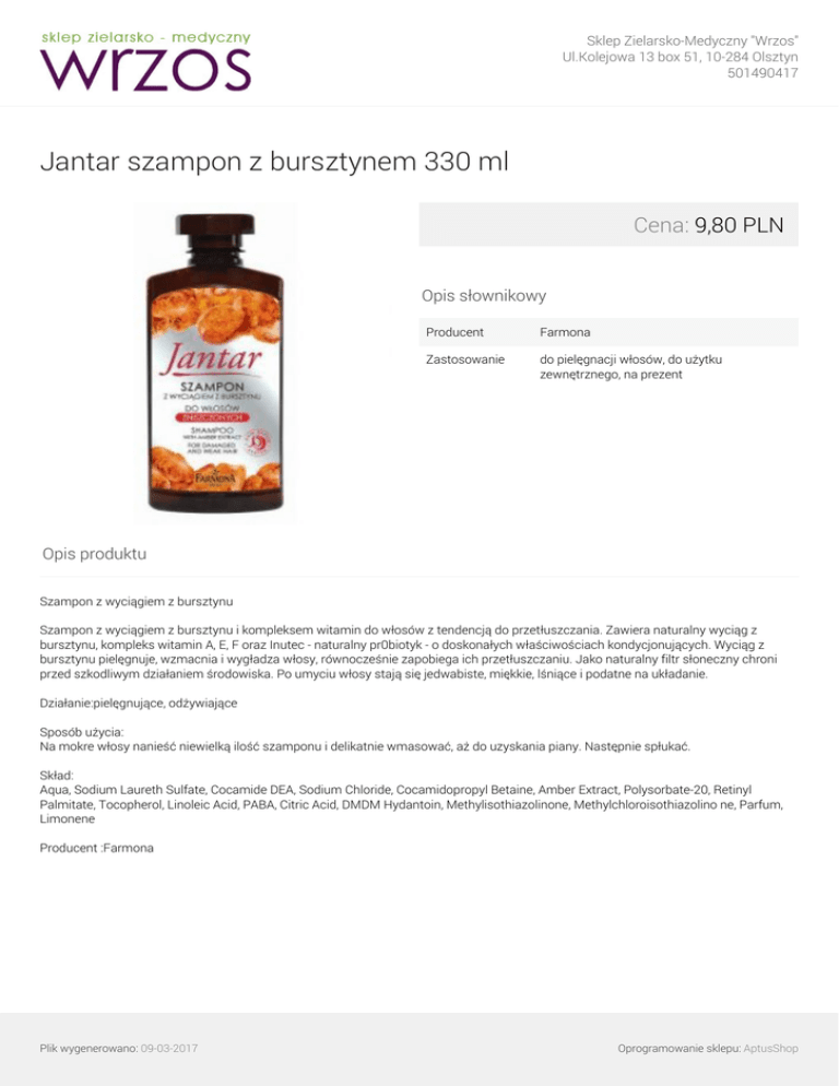 Sklep Zielarsko-Medyczny "Wrzos" Ul.Kolejowa 13 box 51, 10-284 Olsztyn 501490417 Jantar szampon z bursztynem 330 ml Cena: 9,80 PLN Opis słownikowy Producent Farmona Zastosowanie do pielęgnacji włosów, do użytku zewnętrznego, na prezent Opis produktu Szampon z wyciągiem z bursztynu Szampon z wyciągiem z bursztynu i kompleksem witamin do włosów z tendencją do przetłuszczania. Zawiera naturalny wyciąg z bursztynu, kompleks witamin A, E, F oraz Inutec - naturalny pr0biotyk - o doskonałych właściwościach kondycjonujących. Wyciąg z bursztynu pielęgnuje, wzmacnia i wygładza włosy, równocześnie zapobiega ich przetłuszczaniu. Jako naturalny filtr słoneczny chroni przed szkodliwym działaniem środowiska. Po umyciu włosy stają się jedwabiste, miękkie, lśniące i podatne na układanie. Działanie:pielęgnujące, odżywiające Sposób użycia: Na mokre włosy nanieść niewielką ilość szamponu i delikatnie wmasować, aż do uzyskania piany. Następnie spłukać. Skład: Aqua, Sodium Laureth Sulfate, Cocamide DEA, Sodium Chloride, Cocamidopropyl Betaine, Amber Extract, Polysorbate-20, Retinyl Palmitate, Tocopherol, Linoleic Acid, PABA, Citric Acid, DMDM Hydantoin, Methylisothiazolinone, Methylchloroisothiazolino ne, Parfum, Limonene Producent :Farmona Plik wygenerowano: 09-03-2017 Powered by TCPDF (www.tcpdf.org) Oprogramowanie sklepu: AptusShop
