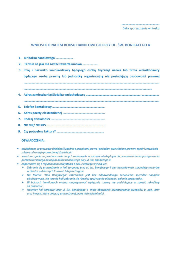 …………………………………………. Data sporządzenia wniosku WNIOSEK O NAJEM BOKSU HANDLOWEGO PRZY UL. ŚW. BONIFACEGO 4 1. Nr boksu handlowego …………………. 2. Termin na jaki ma zostać zawarta umowa ………………. 3. Imię i nazwisko wnioskodawcy będącego osobą fizyczną/ nazwa lub firma wnioskodawcy będącego osobą prawną lub jednostką organizacyjną nie posiadającą osobowości prawnej ……………………………………………………………………………………………………………………………………………………… ……………………………………………………………………………………………………………………………………………… 4. Adres zamieszkania/Siedziba wnioskodawcy ……………………………………………………………. ………………… ……………………………………………………………………………………………………………………………………………………… 5. Telefon kontaktowy ………………………………………………………… 6. Adres poczty elektronicznej …………………………………………….. 7. Rodzaj działalności ………………………………………………………….. 8. NR NIP/ NR KRS ………………………………………………………………. 9. Czy potrzebna faktura? …………………………………………………… OŚWIADCZENIA: • oświadczam, że prowadzę działalność zgodnie z przepisami prawa i posiadam przewidziane prawem zgody i zezwolenia zależne od rodzaju prowadzonej działalności • wyrażam zgodę na przetwarzanie danych osobowych w zakresie niezbędnym do przeprowadzenia postępowania pozakonkursowego na najem boksu handlowego przy ul. św. Bonifacego 4 • Zapoznałem się z regulaminem korzystania z hali, z którego wynika, że: Zabrania się prowadzenia w hali targowej przy ul. św. Bonifacego 4 gier hazardowych, sprzedaży towarów w drodze publicznych losowań lub przetargów. Na terenie "Hali Bonifacego" zabroniona jest bez odpowiedniego zezwolenia sprzedaż napojów alkoholowych. Na terenie hali zabrania się również spożywania alkoholu i palenia papierosów. W boksach handlowych można magazynować wyłącznie towary nie oddziałujące w sposób szkodliwy na otoczenie. Najemcy hali targowej przy ul. św. Bonifacego 4 mają obowiązek przestrzegania przepisów p. poż., BHP oraz innych, które dotyczą prowadzonej przez nich działalności.