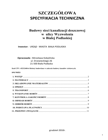 SZCZEGÓŁOWA SPECYFIKACJA TECHNICZNA Budowy sieci kanalizacji deszczowej w ulicy Wyzwolenia w Białej Podlaskiej Inwestor: URZĄD MIASTA BIAŁA PODLASKA Opracowała : Mirosława Kobylińska ul. Drzewieckiego 26 21-500 Biała Podlaska Kod CPV: 45232400-6 Roboty budowlane w zakresie budowy kanałów ściekowych. SPIS TREŚCI 1. WSTĘP ....................................................................................................................... 2 2. MATERIAŁY ............................................................................................................ 3 3. SKŁADOWANIE MATERIAŁÓW ........................................................................ 5 4. SPRZĘT ...................................................................................................................... 6 5. TRANSPORT ............................................................................................................. 6 6. WYKONANIE ROBÓT ............................................................................................ 7 7. KONTROLA JAKOŚCI ROBÓT ............................................................................ 8 8. OBMIAR ROBÓT ..................................................................................................... 9 9. ODBIÓR ROBÓT...................................................................................................... 9 10. PODSTAWA PŁATNOŚCI .................................................................................. 10 11. PRZEPISY ZWIĄZANE ........................................................................................ 11 grudzień 2010r. 1 KANALIZACJA DESZCZOWA 1. WSTĘP 1.1. Przedmiot ST Przedmiotem niniejszej Specyfikacji Technicznej ( ST ) są wymagania szczegółowe dotyczące wykonania i odbioru robót związanych z budową kanalizacji deszczowej w ulicy Wyzwolenia w Białej Podlaskiej. 1.2. Zakres stosowania ST Specyfikacja techniczna jest dokumentem przetargowym i kontraktowym przy zlecaniu i realizacji robót dla zadania j.w. 1.3. Zakres robót objętych ST Zakres robót zawarty w niniejszej Specyfikacji Technicznej obejmuje budowę : - kolektory deszczowe o średnicy DN500mm z rur żelbet WIPRO - studnie rewizyjne średnicy 1200mm z płytą żelbetową nastudzienną , pierścieniem żelbetowym odciążającym i włazem żeliwnym typu ciężkiego kl.40t. - podłączenia wpustów deszczowych z tur PVC –U strukturalne SN8 SDR34 klasy S , łączonych na uszczelkę gumową wg PN-80\C-89205 o średnicy nominalnej 200mm (200 mm x 5,9mm). - Wpusty uliczne typu WU-IIA średnicy 500mm 1.4. Określenia podstawowe 1.4.1. Kanalizacja deszczowa - sieć kanalizacyjna zewnętrzna przeznaczona do odprowadzenia wód opadowych 1.4.2. Kanały 1.4.2.1. Kanał - liniowa budowla przeznaczona do grawitacyjnego odprowadzenia wód opadowych 1.4.2.2. Kanał deszczowy - kanał przeznaczony do odprowadzenia wód opadowych 1.4.2.3. Kanalizacja grawitacyjna – system kanalizacyjny, w którym przepływ ścieków następuje dzięki sile ciężkości 1.4.2.4. Przykanalik- kanał przeznaczony do połączenia wód opadowych z wpustu deszczowego do kanalizacji deszczowej 1.4.2.6. Kanał zbiorczy - kanał przeznaczony do zbierania ścieków z co najmniej dwóch kanałów bocznych 1.4.2.7. Kanał nieprzełazowy - kanał zamknięty o wysokości wewnętrznej mniejszej niż 1,0m 1.4.3. Komora kanalizacyjna – na kanale przełazowym przeznaczona do kontroli i prawidłowej eksploatacji kanałów 1.4.4. Urządzenia ( elementy ) uzbrojenia sieci 1.4.4.1. Studzienka kanalizacyjna - studzienka rewizyjna - na kanale nieprzełazowym przeznaczona do kontroli i prawidłowej eksploatacji kanałów 1.4.4.2. Studzienka przelotowa - studzienka kanalizacyjna zlokalizowania na załamaniach osi kanału w planie, na załamaniach spadku kanału oraz na odcinkach prostych 1.4.4.3. Studzienka połączeniowa - studzienka kanalizacyjna przeznaczona do łączenia co najmniej dwóch kanałów dopływowych w jeden kanał odpływowy. 1.4.4.5. Studzienka ściekowa – urządzenie do odbioru ścieków opadowych spływających do kanału z utwardzonych powierzchni terenu 1.4.5. Elementy studzienek i komór 1.4.5.1. Płyta przykrycia studzienki/komory - płyta przykrywająca komorę roboczą 1.4.5.2. Komora robocza - zasadnicza część studzienki przeznaczona do czynności eksploatacyjnych. Wysokość komory roboczej jest to odległość pomiędzy rzędną dolnej powierzchni płyty lub innego przykrycia studzienki a rzędną spocznika. 1.4.5.3. Właz kanałowy - element żeliwny przeznaczony do przykrycia podziemnych studzienek/komór rewizyjnych umożliwiający dostęp do urządzeń kanalizacyjnych 1.4.5.4. Kineta - wyprofilowany rowek w dnie studzienki/komory, przeznaczony do przepływu w nim ścieków 1.4.5.5. Spocznik - element dna studzienki/komory kanalizacyjnej pomiędzy kinetą a ścianą komory roboczej 1.4.6. Rury CFW-GRP- fabrycznie wykonane rury z tworzywa sztucznego na bazie żywicy poliestrowej zbrojonej ciągłym i 1.4.7. Beton zwykły-beton o gęstości powyżej 1,8 kg.dcm3 wykonany z cementu, wody, kruszywa mineralnego o frakcjach piaskowych i grubszych oraz ewentualnych dodatków mineralnych i domieszek chemicznych. 1.4.8.Mieszanka betonowa- mieszanina wszystkich składników przed związaniem betonu. 1.4.9. Zaczyn cementowy- mieszanina cementu i wody. 1.4.10. Zaprawa - mieszanina cementu, wody, składników i ewentualnych dodatków przechodzących przez sito kontrolne o boku oczka kwadratowego 2mm. 1.4.11. Pręty stalowe wiotkie - pręty stalowe o przekroju kołowym gładkie lub żebrowane o średnicy do 40 mm. 1.4.12.Zbrojenie niesprężające - zbrojenie konstrukcji betonowej nie wprowadzające do niej naprężeń w sposób czynny. 2. MATERIAŁY 2.1. Rury kanałowe Kanały deszczowe wykonać z rur żelbetowych WIPRO średnicy 500mm 2.2.2. Rury z tworzyw sztucznych Rury z pvc- u- strukturalnych średnicy 200mm kielichowe klasy SN8 zgodne z