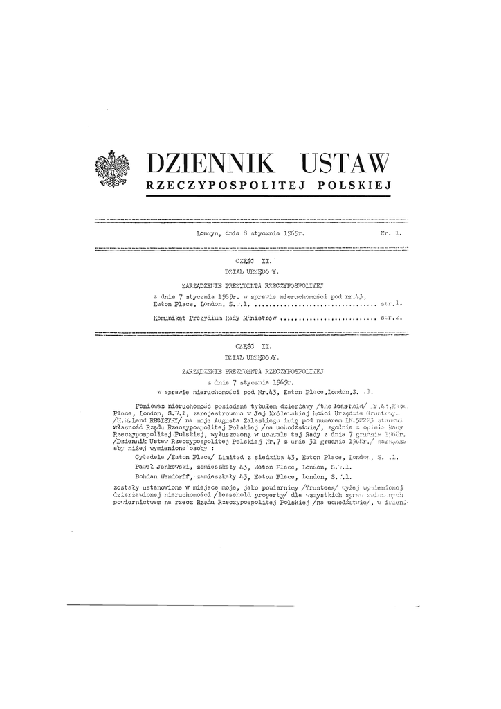 DZIENNIK USTAW RZECZYPOSPOLITEJ POLSKIEJ Lonoyn, dnia 8 stycznia 1$69r. CZĘSC Nr. 1. II. DZIAŁ URZĘDO Y. ZARZĄDZĘ!'IE PREZYDEInTA RZECZYPOSPOLITEJ z dnia 7 stycznia 19ć9r. w sprawie nieruchomości pod nr.43, Eaton Place, London, S. ,:.l . . . s t r . 1« Komunikat Prezydium Rady LC\nistrów CZĘSC ., slr.ć. II. DZIAŁ URZĘDO.ff. ZARZĄDZENIE PREKDEMTA RZECZYPOSPOLITEJ z dnia 7 stycznia 1969r. w sprawie nieruchomości pod Nr.43> Eaton Place,London,3. .1. Ponieważ nieruchomość posiadana tytułem dzierżawy /the loast-hold/ ..'r >46 VL. P l a c e , London, S/7.1, zarejestrowana w Je j Króle-./skie j kości Urzędzie Grunt owy,.. /H. j/l. Land REG-ISTPY'/ na moje Augusta Zaleskiego ii.iię pod numerem IN, 52223 stanowi własność Rzędu Rzeczypospolitej P o l s k i e j /na uchodźstwie/, zgodnie z, opj nir< Raciy Rzeczypospolitej P o l s k i e j , wyłuszczonę w ucrr.rale t e j Rady z dnia 7 grudnia l % 0 r , /Dziennik Usta;/ Rzeczypospolitej P o l s k i e j Nr.7 ss cinia 31 grudnia 19b8r#/ aby n i ż e j wymienione osoby : Cytadela /Eaton Place/ Limited z siedzibę. 43, Eaton Place, Londor., S, .1, Paweł Janlcowski, zamieszkały 43, Eaton Place, London, S/;. 1. Bohdan Wendórff, zamieszkały 43, Eaton Place, London, S. r . l . zostały ustanowione w miejsce moje, jako powiernicy /Trustees/ wyżej \yymienionej dzierżawionej nieruchomości /leasehold property/ dla wszystkich sera'./ ^Y/i.K^.nj^h powiernictwem na rzecz Rzędu Rzeczypospolitej P o l s k i e j /na uchodźstwie/', w ir.iieni' którego ż e j wymieniona nieruchomość j e s t posiadana, i aby przełączanie wyżej wyr/rienior/jj nieruchomości'na łęczne imię wymienionych no\.ych po\/ierni!;ów/Trustees/ zostało odpoY/iednio załatwione. ERB22DUT HZECZYPOSPOLITBJ / - / August Zaleski PREZES RADY MINISTRÓW / - / Aleksander Zawisza MINISTER SKARBU / - / Augustyn Gruszka MINISTER SPRA/IEDLIWOSCI /-/Stanisłay/ LubodzieoldL KOMUNIKAT PREZYDIUM RADY KENISTRÓY/ Wobec poY/ołania nov/ego składu Rady R z e c z y p o s p o l i t e j P o l s k i e j /Dz.U.Ji.P.i r.6 z 30 października 1968r./ i zgodnie z przyjętym zwyczajom Prezes Rady L£Lnistr:'w Aleksander Za\/isza w dniu 28 listopada 196or. przedstawił Panu Prezydentov/i Kzeozyp o s p o l i t e j podanie o udzielenie Rzę.dovvi R.P. d y m i s j i . Pan Prezydent Rzeczypospolit pismem z dnia 4 stycznia 1969r. zav/iadomił Prezesa Rady Ministrów, że po przeprowa. dzeniu k o n s u l t a c j i z przedstav/icielami v/chodzęoycii v/ skład Rady R e p f stronnictw i ugrupowań p o l i t y c z n y c h nie znajduje podstaw do udzielenia d y m i s j i olecner-Ai skłndow. Rzędu R.P. Londyn, dnia 6 stycznia 1969r. PREZES RADY MMISTRÓw / - / A l e ksandor Zawisza Odbito z polecenia Ministra SpraY/iedliwości.