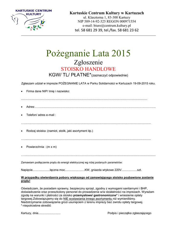 Kartuskie Centrum Kultury w Kartuzach ul. Klasztorna 1, 83-300 Kartuzy NIP 589-14-92-325 REGON 000971554 e-mail: [email protected] tel. 58 681 29 39, tel./fax. 58 681 23 62 Pożegnanie Lata 2015 Zgłoszenie STOISKO HANDLOWE KGW/ TL/ PŁATNE*(zaznaczyć odpowiednie) Zgłaszam udział w imprezie POŻEGNANIE LATA w Parku Solidarności w Kartuzach 19-09-2015 roku. Firma dane NIP/ Imię i nazwisko: ......................................................................................................................................................... Adres:….............................................................................................................................................. Telefon/ adres e-mail : …......................................................................................................................................................... Rodzaj stoiska :(namiot, stolik, jaki asortyment itp.) …......................................................................................................................................................... Powierzchnia : (m x m) …........................................................................................................................................................ Zamawiam podłączenie prądu do energii elektrycznej wg niżej podanych parametrów: Napięcie.....................łączna moc........................KW, gniazda wtykowe 220V...................szt. W przypadku stwierdzenia poboru większego od zamawiającego stoisko pozbawione zostanie prądu! Oświadczam, że posiadam sprawny, bezpieczny sprzęt, zgodny z wymogami sanitarnymi i BHP, doświadczenie oraz przeszkolony personel do prowadzenia w/w działalności na imprezach. Wyrażam zgodę na warunki i płatności za stoisko przemysłowe/ gastronomiczne* i wniesienie opłaty targowej.Zobowiązujemy się do NIE wystawiania innego asortymentu niż wymieniliśmy. Niedotrzymanie zobowiązania grozi usunięciem z terenu imprezy bez zwrotu opłaty targowej. *-niepotrzebne skreślić Kartuzy, dnia........................... Podpis i pieczątka zgłaszającego