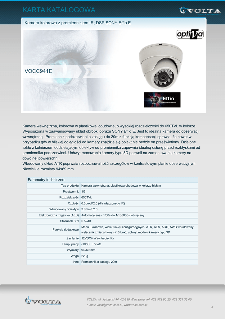 KARTA KATALOGOWA Kamera kolorowa z promiennikiem IR; DSP SONY Effio E VOCC941E Kamera wewnętrzna, kolorowa w plastikowej obudowie, o wysokiej rozdzielczości do 650TVL w kolorze. Wyposażona w zaawansowany układ obróbki obrazu SONY Effio E. Jest to idealna kamera do obserwacji wewnętrznej. Promiennik podczerwieni o zasięgu do 20m z funkcją kompensacji sprawia, że nawet w przypadku gdy w bliskiej odległości od kamery znajdzie się obiekt nie będzie on prześwietlony. Dzielone szkło z kołnierzem oddzielającym obiektyw od promiennika zapewnia idealną osłonę przed rozbłyskami od promiennika podczerwieni. Uchwyt mocowania kamery typu 3D pozwoli na zamontowanie kamery na dowolnej powierzchni. Wbudowany układ ATR poprwaia rozpoznawalność szczegółow w kontrastowym planie obserwacyjnym. Niewielkie rozmiary 94x69 mm Parametry techniczne Typ produktu Kamera wewnętrzna, plastikowa obudowa w kolorze białym Przetwornik 1/3 Rozdzielczość 650TVL Czułość 0.0Lux/F2.0 (dla włączonego IR) Wbudowany obiektyw 3.6mm/F2.0 Elektroniczna migawka (AES) Automatyczna - 1/50s do 1/100000s lub ręczny Stosunek S/N > 52dB Funkcje dodatkowe Menu Ekranowe, wiele funkcji konfiguracyjnych, ATR, AES, AGC, AWB wbudowany wyłącznik zmierzchowy (<10 Lux), uchwyt modułu kamery typu 3D Zasilanie 12VDC/4W (w trybie IR) Temp. pracy -10oC...+50oC Wymiary 94x69 mm Waga 220g Inne Promiennik o zasięgu 20m VOLTA, ul. Jutrzenki 94, 02-230 Warszawa, tel. 022 572 90 20, 022 331 33 00 e-mail: [email protected], www.volta.com.pl 1