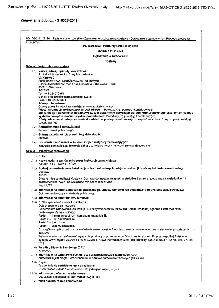 Zamowienie public... - 316328-2011 - TED Tenders Electronic Daily http://ted.europa.eu/udl?uri=TED:NOTICE:3 16328-2011 :TEXT:P... - Zamowienie public... 316328-2011 0811012011 S194 I.II.III.IV.VI. Pahstwa cztonkowskie - Zam6wienie publiczne na dostawy - Ogtoszenie o zambwieniu - Procedura otwarta PL-Warszawa: Produkty farmaceutyczne 20111s 194-316328 Ogloszenie o zamdwieniu Dostawy Sekcia I: lnstvtucia zamawiaiaca 1.1) Nazwa, adresy i punkty kontaktowe Szpital Kliniczny im. ks. Anny Mazowieckiej UI. Karowa 2 Punkt kontaktowy: Dziat Zam6wierl Publicznych Osoba do kontakt6w: mgr Anna Pietruszka - Kierownik Dziatu 00-315 Warszawa POLSKA Tel.: +48 228279354 E-mail: [email protected] Faks: +48 228279354 Adresy internetowe Og6lny adres instytucji zamawiajqcej w.szpitalkarowa.pl Wiecej informacji m o i n a uzyskat pod adresem: Powytszy(-e) punkt(-y) kontaktowy(-e) Specyfikacje i dokumenty dodatkowe (w tym dokumenty dotyczqce dialogu konkurencyjnego oraz dynamicznego systemu zakupow) m o i n a uzyskat pod adresem: Powytszy(-e) punkt(-y) kontaktowy(-e) Oferty lub wnioski o dopuszczenie do udzialu w postepowaniu naleiy przesylat na adres: Powytszy(-e) punkt(-y) kontaktowy(-e) 1.2) Rodzaj instytucji zamawiajqcej Podmiot prawa publicznego 1.3) Glowny przedmiot lub przedmioty dzialalnokci Zdrowie 1.4) Udzielenie zamowienia w imieniu innych instytucji zamawiajqcych lnstytucja zamawiajqca dokonuje zakupu w imieniu innych instytucji zamawiajqcych: nie Sekcia II: Przedmiot zamowienia 11.1) Opis 11.1. l ) Nazwa nadana zamowieniu przez instytucjq zamawiajqcq: ZAKUP I DOSTAWY L E K ~ W . 11.1.2) Rodzaj zamowienia oraz lokalizacja robot budowlanych, miejsce realizacji dostawy lub Swiadczenia uslug Dostawy Kupno Gt6wne miejsce realizacji dostawy: Dostawa do magazynu apteki w siedzibie Zamawiajqcego wraz z rozladunkiem i dostarueniem towaru na wskazane miejsce w magazynie. Kod NUTS 11.1.3) lnformacje na temat zamowienia publicznego, umowy ramowej lub dynamicznego systemu zakupdw (DSZ) Ogtoszenie dotyczy zam6wienia publicznego 11.1.4) lnformacje na temat umowy ramowej 11.1.5) Krdtki opis zamowienia lub zakupu Opis przedmiotu zam6wienia. Przedmiotem zam6wienia jest zakup i sukcesywne dostawy lek6w dla Apteki Szpitalnej zgodnie z zam6wieniami czgSciowymi Zamawiajqcego: Pakiet 1 - lmmunoglobulinum humanum hepatitidis B. Pakiet 2 - Leki onkologiczne. Pakiet 3 - Leki r6tne. Pakiet 4 - Bleomycini sulfas. Szczeg6lowy opis przedmiotu zam6wienia zawarty jest w formularzu asortymentowo-cenowym stanowiqcym zatqcznik nr 1 do SIWZ. Wykonawca moie zaoferowat wytqcznie produkty dopuszczone do Obrotu na terytorium Rzeczypospolitej Polskiej zgodnie z wymogami ustawy z dnia 6.9.2001 r. Prawo Farmaceutyczne (test jednolity: Dz.U. z 2008 r., Nr 45, poz. 271 ze zm.). 11.1.6) Wspdlny Slownik Zamowien (CPV) 33600000 11.1.7) lnformacje na temat Porozumienia w sprawie zamdwieri rzqdowych (GPA) Zam6wienie jest objgte Porozumieniem w sprawie zam6wieh rzqdowych (GPA): nie 11.1.8) Czekci To zam6wienie podzielone jest na czeSci: tak Oferty motna sktadat w odniesieniu do jednej lub wiecej czgSci 11.1.9) lnformacje o ofertach wariantowych Dopuszcza sig sktadanie ofert wariantowych: nie 11.2) Wielkokt lub zakres zamdwienia Zamowienie public... - 3 16328-2011 - TED Tenders Electronic Daily http://ted.europa.eu/udl?uri=TED:NOTICE:316328-2011:TEXT:P... 11.2.1) Calkowita wielkoSC lub zakres Szacunkowa calkowita wartosC zakupow w calym okresie obowiqzywania umowy ramowej Szacunkowa wartoSC bez VAT: 91 763,64 PLN 11.2.2) lnformacje o opcjach Opcje: nie 11.2.3) lnformacje o wznowieniach Jest to zamdwienie podlegajqce wznowieniu: nie 11.3) Czas trwania zam6wienia lub termin realizacji Okres w miesiqcach: 12 (od udzielenia zarnbwienia) lnformacie o czesciach zam6wienia CzqSC nr: 1 Nazwa: Pakiet 1 1) Krotki opis lmmunoglobulinum humanum hepatitidis B. Szczegblowy opis przedmiotu zambwienia zawarty jest w formularzu asortymentowo-cenowymstanowiqcym zalqcznik nr 1 do SIWZ. 2) Wspolny Slownik Zamowien (CPV) 33600000 3) WielkosC lub zakres Szacunkowa calkowita wartosC zakup6w w calym okresie obowiqzywania umowy ramowej Szacunkowa wartoSC bez VAT 34 681,50 PLN 4) lnformacje o r6inych datach dotyczqcych czasu trwania lub rozpoczqcialrealizacji zam6wienia Okres w miesiqcach: 12 (od udzielenia zambwienia) 5) lnformacje dodatkowe na temat czqsci zam6wienia CzqSC nr: 2 1) Kr6tki opis Leki onkologiczne. Szczegdowy opis przedmiotu zambwienia zawarty jest w formularzu asortymentowo-cenowymstanowiqcym zalqcznik nr 1 do SIWZ. 2) Wspolny Slownik Zam6wieh (CPV) 33600000 3) WielkoSC lub zakres Szacunkowa calkowita wart056 zakup6w w calym okresie obowiqzywania umowy ramowej Szacunkowa wartoSC bez VAT 18 992,50 PLN 4) lnformacje o r6inych datach dotyczqcych czasu trwania lub rozpoczqcialrealizacji zamowienia Okres w miesiqcach: 12 (od udzielenia zambwienia) 5) lnformacje dodatkowe na temat czqSci zam6wienia CzeSC nr: 3 Nazwa: Pakiet 3 1) Kr6tki opis Leki rbtne. Szczegblowy opis przedmiotu zarnbwienia zawarty jest w formularzu asortymentowo-cenowymstanowiqcym zalqcznik nr 1 do SIWZ. 2) Wsp6lny Slownik Zamowieri (CPV) 33600000 3) WielkoSC lub zakres Szacunkowa calkowita wartoSC zakupow w calym okresie obowiqzywania umowy ramowej Szacunkowa wartost bez VAT 32 559,14 PLN 4) lnformacje o r6inych datach dotyczqcych czasu trwania lub rozpoczqcialrealizacji zamowienia Okres w miesiqcach: 12 (od udzielenia zambwienia) 5) lnformacje dodatkowe na temat czqSci zam6wienia CzqSC nr: 4 Nazwa: Pakiet 4 1) Krotki opis Bleomycini sulfas. Szczegblowy opis przedmiotu zarnbwienia zawarty jest w formularzu asortymentowo-cenowymstanowiqcym zalqcznik nr 1 do SIWZ. 2) Wsp6lny Slownik Zam6wien (CPV) 33600000 3) WielkosC lub zakres Szacunkowa calkowita wart056 zakupow w calym okresie obowiqzywania umowy ramowej Szacunkowa wartoSC bez VAT 5 530,50 PLN 4) lnformacje o rdinych datach dotyczqcych czasu trwania lub rozpoczqcialrealizacji zamowienia Okres w miesiqcach: 12 (od udzielenia zambwienia) 5) lnf