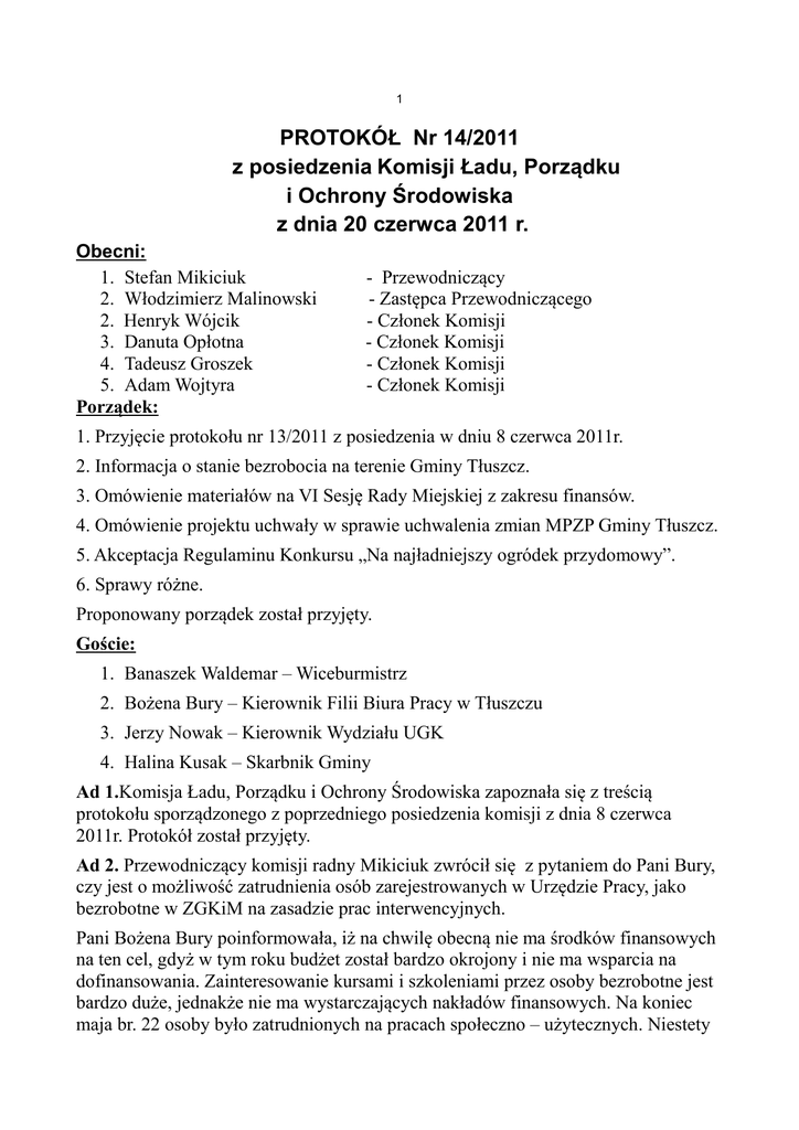 PROTOKÓŁ Nr 14/2011 z posiedzenia Komisji Ładu, Porządku i