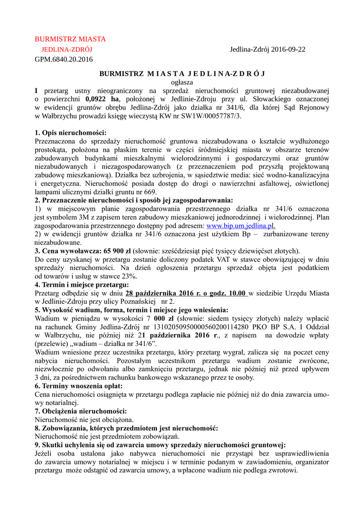 BURMISTRZ MIASTA JEDLINA-ZDRÓJ Jedlina-Zdrój 2016-09-22 GPM.6840.20.2016 BURMISTRZ M I A S T A J E D L I N A-Z D R Ó J ogłasza I przetarg ustny nieograniczony na sprzedaż nieruchomości gruntowej niezabudowanej o powierzchni 0,0922 ha, położonej w Jedlinie-Zdroju przy ul. Słowackiego oznaczonej w ewidencji gruntów obrębu Jedlina-Zdrój jako działka nr 341/6, dla której Sąd Rejonowy w Wałbrzychu prowadzi księgę wieczystą KW nr SW1W/00057787/3. 1. Opis nieruchomości: Przeznaczona do sprzedaży nieruchomość gruntowa niezabudowana o kształcie wydłużonego prostokąta, położona na płaskim terenie w części śródmiejskiej miasta w obszarze terenów zabudowanych budynkami mieszkalnymi wielorodzinnymi i gospodarczymi oraz gruntów niezabudowanych i niezagospodarowanych (z przeznaczeniem pod przyszłą projektowaną zabudowę mieszkaniową). Działka bez uzbrojenia, w sąsiedztwie media: sieć wodno-kanalizacyjna i energetyczna. Nieruchomość posiada dostęp do drogi o nawierzchni asfaltowej, oświetlonej lampami ulicznymi działki gruntu nr 669. 2. Przeznaczenie nieruchomości i sposób jej zagospodarowania: 1) w miejscowym planie zagospodarowania przestrzennego działka nr 341/6 oznaczona jest symbolem 3M z zapisem teren zabudowy mieszkaniowej jednorodzinnej i wielorodzinnej. Plan zagospodarowania przestrzennego dostępny pod adresem: www.bip.um.jedlina.pl. 2) w ewidencji gruntów działka nr 341/6 oznaczona jest użytkiem Bp – zurbanizowane tereny niezabudowane. 3. Cena wywoławcza: 65 900 zł (słownie: sześćdziesiąt pięć tysięcy dziewięćset złotych). Do ceny uzyskanej w przetargu zostanie doliczony podatek VAT w stawce obowiązującej w dniu sprzedaży nieruchomości. Na dzień ogłoszenia przetargu sprzedaż objęta jest podatkiem od towarów i usług w stawce 23%. 4. Termin i miejsce przetargu: Przetarg odbędzie się w dniu 28 października 2016 r. o godz. 10.00 w siedzibie Urzędu Miasta w Jedlinie-Zdroju przy ulicy Poznańskiej nr 2. 5. Wysokość wadium, forma, termin i miejsce jego wniesienia: Wadium w pieniądzu w wysokości 7 000 zł (słownie: siedem tysięcy złotych) należy wpłacić na rachunek Gminy Jedlina-Zdrój nr 13102050950000560200114280 PKO BP S.A. I Oddział w Wałbrzychu, nie później niż 21 października 2016 r., z napisem na dowodzie wpłaty (przelewie) „wadium – działka nr 341/6”. Wadium wniesione przez uczestnika przetargu, który przetarg wygrał, zalicza się na poczet ceny nabycia nieruchomości. Pozostałym uczestnikom przetargu wadium zostanie zwrócone, niezwłocznie po odwołaniu albo zamknięciu przetargu, jednak nie później niż przed upływem 3 dni, za pośrednictwem rachunku bankowego wskazanego przez te osoby. 6. Terminy wnoszenia opłat: Cena nieruchomości osiągnięta w przetargu podlega zapłacie nie później niż do dnia zawarcia umowy notarialnej. 7. Obciążenia nieruchomości: Nieruchomość nie jest obciążona. 8. Zobowiązania, których przedmiotem jest nieruchomość: Nieruchomość nie jest przedmiotem zobowiązań. 9. Skutki uchylenia się od zawarcia umowy sprzedaży nieruchomości gruntowej: Jeżeli osoba ustalona jako nabywca nieruchomości nie przystąpi bez usprawiedliwienia do zawarcia umowy notarialnej w miejscu i w terminie podanym w zawiadomieniu, organizator przetargu może odstąpić od zawarcia umowy, a wpłacone wadium nie podlega zwrotowi. 10. Zastrzeżenie: Termin umowy notarialnej zostanie wyznaczony w ciągu 21 dni od dnia rozstrzygnięcia przetargu. Nabywca zobowiązany jest do poniesienia kosztów związanych z nabyciem nieruchomości, tj. opłaty sądowej i notarialnej. Burmistrz Miasta Jedlina-Zdrój może odwołać ogłoszony przetarg jedynie z ważnych powodów, niezwłocznie podając informację o odwołaniu do publicznej wiadomości z podaniem przyczyn odwołania przetargu. 12. Informacja o miejscu wywieszenia i publikacji ogłoszenia: Ogłoszenie o przetargu zostanie wywieszone na tablicy ogłoszeń w siedzibie Urzędu Miasta oraz opublikowane w Biuletynie Informacji Publicznej Urzędu Miasta (www.bip.um.jedlina.pl) i na stronie Urzędu Miasta Jedlina-Zdrój (www.jedlinazdroj.eu). Wyciąg z ogłoszenia opublikowany zostanie w Monitorze Urzędowym oraz wywieszony na tablicach informacyjnych rozmieszczonych na terenie gminy Jedlina-Zdrój. 13. Informacje dodatkowe: a) Sprzedaży nieruchomości dokonuje się w oparciu o przepisy ustawy z dnia 21 sierpnia 1997r o gospodarce nieruchomościami (Dz. U. Z 2015r., poz. 1774 ze zm.). b) nabywca przejmuje nieruchomość w stanie istniejącym. c) szczegółowe informacje o istniejącym uzbrojeniu i możliwości przyłączenia się do istniejącej infrastruktury określą poszczególni zarządzający. d) korzystanie z wszelkich urządzeń infrastruktury komunalnej i technicznej wymaga uzgodnienia z dysponentami sieci i obciąża całkowicie nabywcę nieruchomości. Istniejące na nieruchomości urządzenia infrastruktury technicznej i komunalnej mogą być wykorzystywane przez nabywcę tylko i wyłącznie na warunkach określonych przez dysponenta tych urządzeń. e) przetarg będzie ważny bez względu na liczbę uczestników przetargu, jeżeli przynajmniej jeden uczestnik zaoferuje co najmniej jedno postąpienie powyżej ceny wywoławczej. O wysokości postąpienia decydują uczestnicy przetargu, z tym że postąpienie nie może wynosić mniej niż 1% ceny wywoławczej, z zaokrągleniem do pełnych dziesiątek złotych. f) w przetargu mogą uczestniczyć osoby fizyczne i prawne oraz cudzoziemcy na zasadach określonych w ustawie z dnia 24 marca 1920 r. o nabywaniu nieruchomości przez cudzoziemców (Dz. U. z 2016 r. poz. 1061), g) uczestnik przetargu przedkłada komisji przetargowej przed jego otwarciem następujące dokumenty: - dowód tożsamości; - właściwe pełnomocnictwo udzielone przez osobę, którą reprezentuje – do uczestnictwa w przetargu: w formie pisemnej z notarialnie poświadczonym podpisem, do nabycia n
