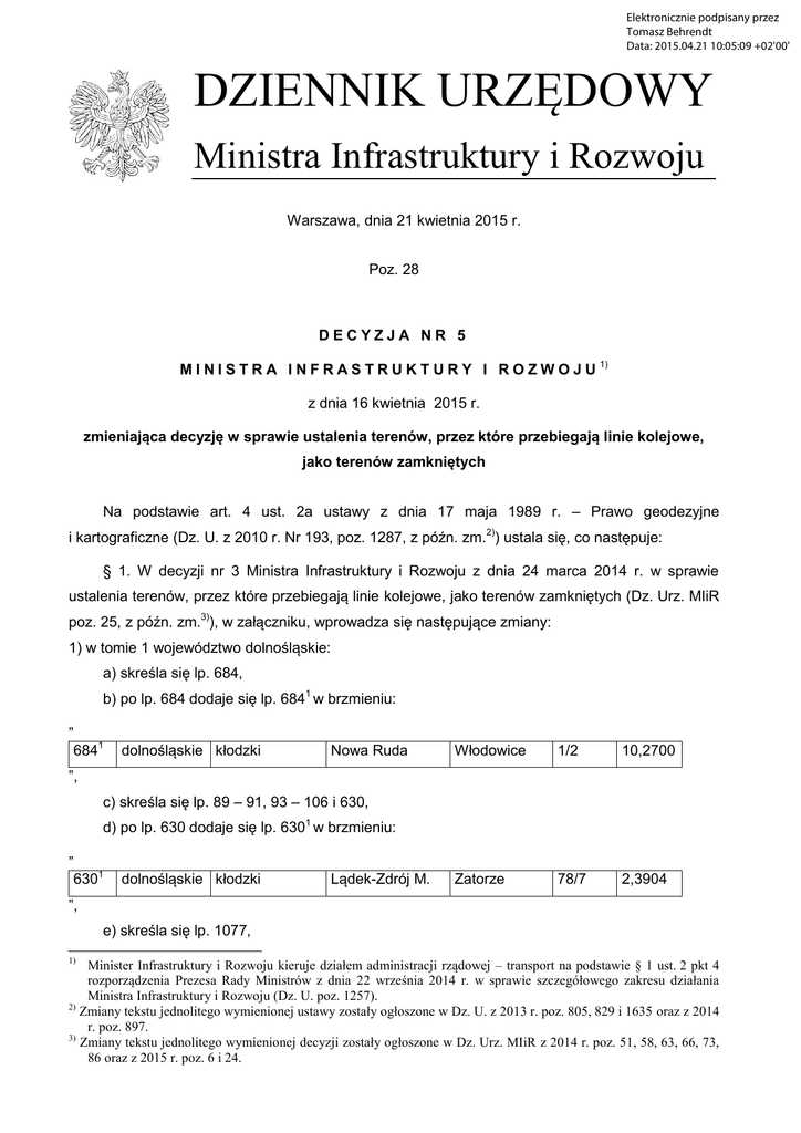 Elektronicznie podpisany przez Tomasz Behrendt Data: 2015.04.21 10:05:09 +02'00' DZIENNIK URZĘDOWY Ministra Infrastruktury i Rozwoju Warszawa, dnia 21 kwietnia 2015 r. Poz. 28 DECYZJA NR 5 M I N I S T R A I N F R A S T R U K T U R Y I R O Z W O J U 1) z dnia 16 kwietnia 2015 r. zmieniająca decyzję w sprawie ustalenia terenów, przez które przebiegają linie kolejowe, jako terenów zamkniętych Na podstawie art. 4 ust. 2a ustawy z dnia 17 maja 1989 r. – Prawo geodezyjne i kartograficzne (Dz. U. z 2010 r. Nr 193, poz. 1287, z późn. zm.2)) ustala się, co następuje: § 1. W decyzji nr 3 Ministra Infrastruktury i Rozwoju z dnia 24 marca 2014 r. w sprawie ustalenia terenów, przez które przebiegają linie kolejowe, jako terenów zamkniętych (Dz. Urz. MIiR poz. 25, z późn. zm.3)), w załączniku, wprowadza się następujące zmiany: 1) w tomie 1 województwo dolnośląskie: a) skreśla się lp. 684, b) po lp. 684 dodaje się lp. 6841 w brzmieniu: „ 6841 dolnośląskie kłodzki Nowa Ruda Włodowice 1/2 10,2700 Zatorze 78/7 2,3904 ”, c) skreśla się lp. 89 – 91, 93 – 106 i 630, d) po lp. 630 dodaje się lp. 6301 w brzmieniu: „ 6301 dolnośląskie kłodzki Lądek-Zdrój M. ”, e) skreśla się lp. 1077, 1) Minister Infrastruktury i Rozwoju kieruje działem administracji rządowej – transport na podstawie § 1 ust. 2 pkt 4 rozporządzenia Prezesa Rady Ministrów z dnia 22 września 2014 r. w sprawie szczegółowego zakresu działania Ministra Infrastruktury i Rozwoju (Dz. U. poz. 1257). 2) Zmiany tekstu jednolitego wymienionej ustawy zostały ogłoszone w Dz. U. z 2013 r. poz. 805, 829 i 1635 oraz z 2014 r. poz. 897. 3) Zmiany tekstu jednolitego wymienionej decyzji zostały ogłoszone w Dz. Urz. MIiR z 2014 r. poz. 51, 58, 63, 66, 73, 86 oraz z 2015 r. poz. 6 i 24. Dziennik Urzędowy Ministra Infrastruktury i Rozwoju –2– Poz. 28 f) po lp. 1077 dodaje się lp. 10771 w brzmieniu: „ 10771 dolnośląskie lubiński Lubin M. 0007 302/7 1,9468 ”, g) po lp. 2579 dodaje się lp. 25791 – 257915 w brzmieniu: „ 25791 dolnośląskie trzebnicki Oborniki Śląskie Golędzinów 1/12 0,0772 25792 dolnośląskie trzebnicki Oborniki Śląskie Golędzinów 1/14 0,0589 2579 3 dolnośląskie trzebnicki Oborniki Śląskie Golędzinów 1/15 0,0471 2579 4 dolnośląskie trzebnicki Oborniki Śląskie Golędzinów 167/7 0,0335 2579 5 dolnośląskie trzebnicki Oborniki Śląskie Golędzinów 167/8 0,1194 25796 dolnośląskie trzebnicki Oborniki Śląskie Golędzinów 167/11 0,2975 25797 dolnośląskie trzebnicki Oborniki Śląskie Golędzinów 239/1 0,1289 25798 dolnośląskie trzebnicki Oborniki Śląskie Golędzinów 242/1 0,0812 25799 dolnośląskie trzebnicki Oborniki Śląskie Golędzinów 242/2 0,0219 257910 dolnośląskie trzebnicki Oborniki Śląskie Golędzinów 246/3 0,1190 2579 11 dolnośląskie trzebnicki Oborniki Śląskie Golędzinów 247/1 0,0475 2579 12 dolnośląskie trzebnicki Oborniki Śląskie Golędzinów 270/2 0,0084 2579 13 dolnośląskie trzebnicki Oborniki Śląskie Golędzinów 274/2 0,0933 257914 dolnośląskie trzebnicki Oborniki Śląskie Golędzinów 275/4 0,0108 257915 dolnośląskie trzebnicki Oborniki Śląskie Golędzinów 275/6 0,0276 Golędzinów 373/1 0,0011 Golędzinów 379/1 0,1213 2390/2 0,0217 ”, h) po lp. 2581 dodaje się lp. 25811 w brzmieniu: 25811 dolnośląskie trzebnicki Oborniki Śląskie ”, i) po lp. 2582 dodaje się lp. 25821 w brzmieniu: 25821 dolnośląskie trzebnicki Oborniki Śląskie ”; 2) w tomie 3 województwo lubelskie: a) skreśla się lp. 89, b) po lp. 89 dodaje się lp. 891 w brzmieniu: „ 891 lubelskie bialski Terespol ”, c) po lp. 1718 dodaje się lp. 17181 w brzmieniu: Błotków Dziennik Urzędowy Ministra Infrastruktury i Rozwoju –3– Poz. 28 „ 17181 lubelskie świdnicki Świdnik 1 Miasto Świdnik 152/48 0,5463 ”; 3) w tomie 4 województwo lubuskie: a) skreśla się lp. 930, b) po lp. 930 dodaje się lp. 9301 i 9302 w brzmieniu: „ 9301 lubuskie żarski Żary Bieniów 464/5 0,0828 9302 lubuskie żarski Żary Bieniów 464/8 27,8300 6375 9,6808 8-Kęszyce Wieś 201/1 7,3200 ”; 4) w tomie 5 województwo łódzkie: a) skreśla się lp. 1988 i 1989, b) po lp. 1989 dodaje się lp. 19891 w brzmieniu: „ 19891 łódzkie pajęczański Nowa Brzeźnica Brzeźnica ”, c) skreśla się lp. 2582, d) po lp. 2582 dodaje się lp. 25821 w brzmieniu: „ 25821 łódzkie skierniewicki Bolimów ”; 5) w tomie 6 województwo małopolskie: a) skreśla się lp. 910 – 912 i 2166, b) po lp. 2166 dodaje się lp. 21661 w brzmieniu: „ 21661 małopolskie olkuski Wolbrom Zarzecze 911/16 8,5230 3-07-03 1/5 5,7607 ”, c) skreśla się lp. 2217 oraz 2218; 6) w tomie 7 województwo mazowieckie: a) skreśla się lp. 809, b) po lp. 809 dodaje się lp. 8091 w brzmieniu: „ 8091 mazowieckie m. st. Warszawa Warszawa Rembertów ”, c) skreśla się lp. 1015, Dziennik Urzędowy Ministra Infrastruktury i Rozwoju –4– Poz. 28 d) po lp. 1015 dodaje się lp. 10151 w brzmieniu: „ 10151 mazowieckie m. st. Warszawa Warszawa 6-03-02 1/1 3,0693 411/3 7,9758 411/9 3,5822 Wola ”, e) skreśla się lp. 1316, f) po lp. 1316 dodaje się lp. 13161 i 13162 w brzmieniu: „ 13161 mazowieckie miński Mińsk Mazowiecki – Barcząca Gmina 13162 mazowieckie miński Mińsk Mazowiecki – Barcząca Gmina ”, g) skreśla się lp. 1462, h) po lp. 1462 dodaje się lp. 14621 i 14622 w brzmieniu: „ 14621 mazowieckie miński 1462 2 mazowieckie miński Stanisławów Goździówka 94/1 1,8000 Stanisławów Goździówka 94/2 6,5000 ”, i) skreśla się lp. 1597, j) po lp. 1597 dodaje się lp. 15971 w brzmieniu: „ 15971 mazowieckie ostrołęcki Olszewo-Borki Olszewo-Borki 35/59 12,4033 ”, k) skreśla się lp. 2531, l) po lp. 2531 dodaje się lp. 25311 i 25312 w brzmieniu: „ 25311 mazowieckie wołomiński 2531 2 mazowieckie wołomiński Radzymin-Miasto 03-01 1/6 0,6716 Radzymin-Miasto 03-01 1/13 9,9086 ”, m) skreśla się lp. 2869, n) po lp. 2869 doda