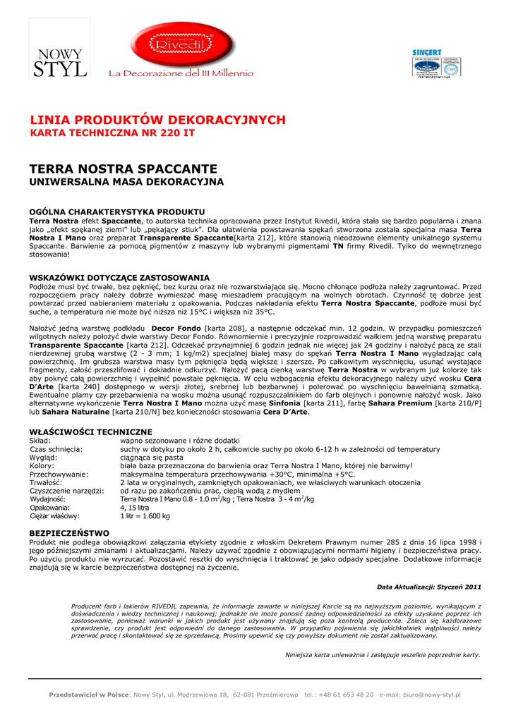 LINIA PRODUKTÓW DEKORACYJNYCH KARTA TECHNICZNA NR 220 IT TERRA NOSTRA SPACCANTE UNIWERSALNA MASA DEKORACYJNA OGÓLNA CHARAKTERYSTYKA PRODUKTU Terra Nostra efekt Spaccante, to autorska technika opracowana przez Instytut Rivedil, która stała się bardzo popularna i znana jako „efekt spękanej ziemi” lub „pękający stiuk”. Dla ułatwienia powstawania spękań stworzona została specjalna masa Terra Nostra I Mano oraz preparat Transparente Spaccante[karta 212], które stanowią nieodzowne elementy unikalnego systemu Spaccante. Barwienie za pomocą pigmentów z maszyny lub wybranymi pigmentami TN firmy Rivedil. Tylko do wewnętrznego stosowania! WSKAZÓWKI DOTYCZĄCE ZASTOSOWANIA Podłoże musi być trwałe, bez pęknięć, bez kurzu oraz nie rozwarstwiające się. Mocno chłonące podłoża należy zagruntować. Przed rozpoczęciem pracy należy dobrze wymieszać masę mieszadłem pracującym na wolnych obrotach. Czynność tę dobrze jest powtarzać przed nabieraniem materiału z opakowania. Podczas nakładania efektu Terra Nostra Spaccante, podłoże musi być suche, a temperatura nie może być niższa niż 15°C i większa niż 35°C. Nałożyć jedną warstwę podkładu Decor Fondo [karta 208], a następnie odczekać min. 12 godzin. W przypadku pomieszczeń wilgotnych należy położyć dwie warstwy Decor Fondo. Równomiernie i precyzyjnie rozprowadzić wałkiem jedną warstwę preparatu Transparente Spaccante [karta 212]. Odczekać przynajmniej 6 godzin jednak nie więcej jak 24 godziny i nałożyć pacą ze stali nierdzewnej grubą warstwę (2 - 3 mm; 1 kg/m2) specjalnej białej masy do spękań Terra Nostra I Mano wygładzając całą powierzchnię. Im grubsza warstwa masy tym pęknięcia będą większe i szersze. Po całkowitym wyschnięciu, usunąć wystające fragmenty, całość przeszlifować i dokładnie odkurzyć. Nałożyć pacą cienką warstwę Terra Nostra w wybranym już kolorze tak aby pokryć całą powierzchnię i wypełnić powstałe pęknięcia. W celu wzbogacenia efektu dekoracyjnego należy użyć wosku Cera D’Arte [karta 240] dostępnego w wersji złotej, srebrnej lub bezbarwnej i polerować po wyschnięciu bawełnianą szmatką. Ewentualne plamy czy przebarwienia na wosku można usunąć rozpuszczalnikiem do farb olejnych i ponownie nałożyć wosk. Jako alternatywne wykończenie Terra Nostra I Mano można użyć masę Sinfonia [karta 211], farbę Sahara Premium [karta 210/P] lub Sahara Naturalne [karta 210/N] bez konieczności stosowania Cera D’Arte. WŁAŚCIWOŚCI TECHNICZNE Skład: Czas schnięcia: Wygląd: Kolory: Przechowywanie: Trwałość: Czyszczenie narzędzi: Wydajność: Opakowania: Ciężar właściwy: wapno sezonowane i różne dodatki suchy w dotyku po około 2 h, całkowicie suchy po około 6-12 h w zależności od temperatury ciągnąca się pasta biała baza przeznaczona do barwienia oraz Terra Nostra I Mano, której nie barwimy! maksymalna temperatura przechowywania +30°C, minimalna +5°C. 2 lata w oryginalnych, zamkniętych opakowaniach, we właściwych warunkach otoczenia od razu po zakończeniu prac, ciepłą wodą z mydłem Terra Nostra I Mano 0.8 - 1.0 m2/kg ; Terra Nostra 3 - 4 m2/kg 4, 15 litra 1 litr = 1.600 kg BEZPIECZEŃSTWO Produkt nie podlega obowiązkowi załączania etykiety zgodnie z włoskim Dekretem Prawnym numer 285 z dnia 16 lipca 1998 i jego późniejszymi zmianami i aktualizacjami. Należy używać zgodnie z obowiązującymi normami higieny i bezpieczeństwa pracy. Po użyciu produktu nie wyrzucać. Pozostawić resztki do wyschnięcia i traktować je jako odpady specjalne. Dodatkowe informacje znajdują się w karcie bezpieczeństwa dostępnej na życzenie. Data Aktualizacji: Styczeń 2011 Producent farb i lakierów RIVEDIL zapewnia, że informacje zawarte w niniejszej Karcie są na najwyższym poziomie, wynikającym z doświadczenia i wiedzy technicznej i naukowej; jednakże nie może ponosić żadnej odpowiedzialności za efekty uzyskane poprzez ich zastosowanie, ponieważ warunki w jakich produkt jest używany znajdują się poza kontrolą producenta. Zaleca się każdorazowe sprawdzenie, czy produkt jest odpowiedni do danego zastosowania. W przypadku pojawienia się jakichkolwiek wątpliwości należy przerwać pracę i skontaktować się ze sprzedawcą. Prosimy upewnić się czy powyższy dokument nie został zaktualizowany. Niniejsza karta unieważnia i zastępuje wszelkie poprzednie karty. Przedstawiciel w Polsce: Nowy Styl, ul. Modrzewiowa 18, 62-081 Przeźmierowo tel.: +48 61 653 48 20 e-mail: [email protected]