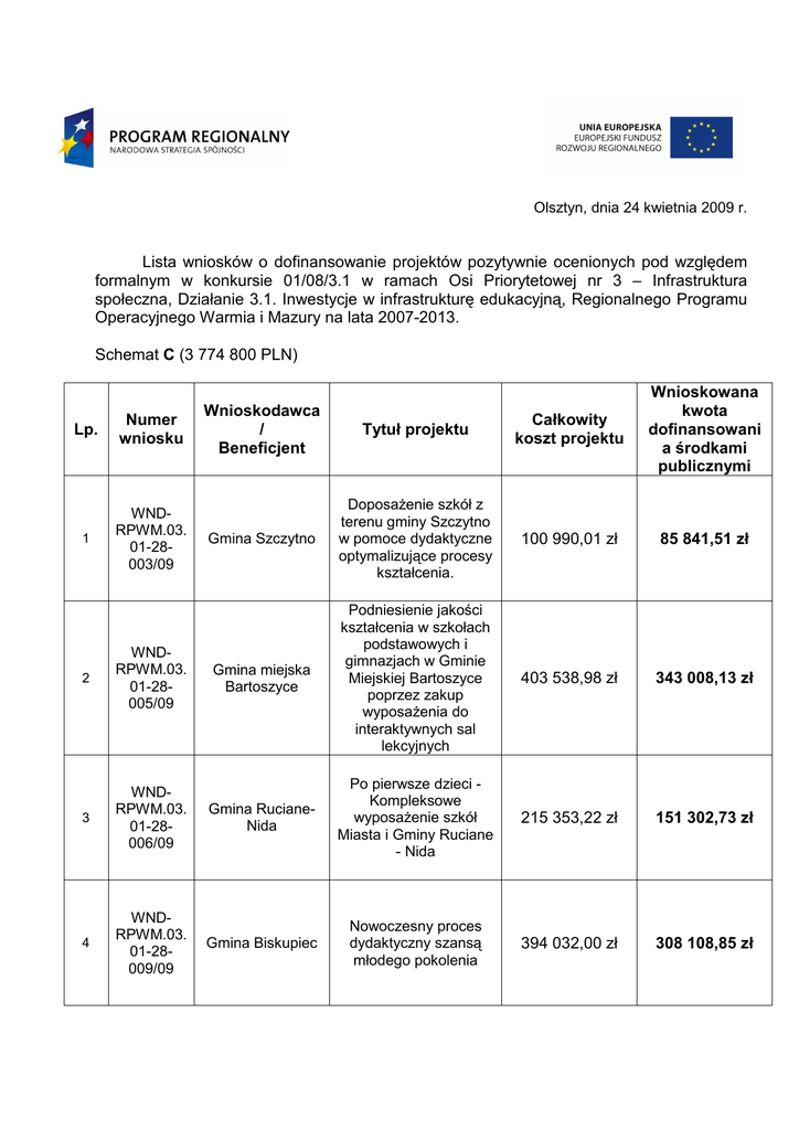 Olsztyn, dnia 24 kwietnia 2009 r. Lista wniosków o dofinansowanie projektów pozytywnie ocenionych pod względem formalnym w konkursie 01/08/3.1 w ramach Osi Priorytetowej nr 3 – Infrastruktura społeczna, Działanie 3.1. Inwestycje w infrastrukturę edukacyjną, Regionalnego Programu Operacyjnego Warmia i Mazury na lata 2007-2013. Schemat C (3 774 800 PLN) Lp. Numer wniosku 1 WNDRPWM.03. 01-28003/09 Wnioskodawca / Beneficjent Tytuł projektu Całkowity koszt projektu Wnioskowana kwota dofinansowani a środkami publicznymi Gmina Szczytno DoposaŜenie szkół z terenu gminy Szczytno w pomoce dydaktyczne optymalizujące procesy kształcenia. 100 990,01 zł 85 841,51 zł Gmina miejska Bartoszyce Podniesienie jakości kształcenia w szkołach podstawowych i gimnazjach w Gminie Miejskiej Bartoszyce poprzez zakup wyposaŜenia do interaktywnych sal lekcyjnych 403 538,98 zł 343 008,13 zł 215 353,22 zł 151 302,73 zł 394 032,00 zł 308 108,85 zł 2 WNDRPWM.03. 01-28005/09 3 WNDRPWM.03. 01-28006/09 Gmina RucianeNida Po pierwsze dzieci Kompleksowe wyposaŜenie szkół Miasta i Gminy Ruciane - Nida 4 WNDRPWM.03. 01-28009/09 Gmina Biskupiec Nowoczesny proces dydaktyczny szansą młodego pokolenia 5 WNDRPWM.03. 01-28010/09 6 WNDRPWM.03. 01-28011/09 7 WNDRPWM.03. 01-28012/09 8 WNDRPWM.03. 01-28013/09 9 WNDRPWM.03. 01-28014/09 10 WNDRPWM.03. 01-28016/09 Powiat GiŜycki Modernizacja i rozbudowa placówek kształcenia zawodowego. Modernizacja kształcenia zawodowego w Zespole Szkół Kształtowania Środowiska i Agrobiznesu w GiŜycku. Optymalizacja procesów kształcenia w szkołach wszystkich typów w Gminie Barczewokompleksowe wyposaŜenie w sprzęt i pomoce naukowe 347 703,00 zł 292 997,55 zł 258 700,00 zł 197 791,20 zł Gmina Miejska Kętrzyn Poprawa jakości nauczania poprzez doposaŜenie szkół Gminy Miejskiej Kętrzyn w sprzęt i pomoce naukowe 412 910,00 zł 348 933,50 zł Powiat Piski Unowocześnienie Zespołu Szkół Zawodowych w Piszu poprzez wyposaŜenie w sprzęt i pomoce naukowe 350 980,11 zł 298 333,09 zł Powiat Ełcki Optymalizacja kształcenia w powiecie ełckim w zawodach poszukiwanych na rynku pracy 437 370,00 zł 349 896,00 zł Gmina Morąg Unowocześnienie bazy dydaktycznej optymalizującej procesy kształcenia szkół podstawowych i gimnazjalnych w Gminie Morąg 491 985,58 zł 349 137,68 zł Miejski Zespół Oświaty i Zdrowia w Barczewie 11 WNDRPWM.03. 01-28017/09 Gmina Miasto Ełk WyposaŜenie szkół samorządowych w Ełku w pomoce naukowe 342 620,00 zł 264 664,50 zł 12 WNDRPWM.03. 01-28018/09 Gmina Pisz Nasze centrum informatyczno-językowe 411 260,00 zł 288 792,43 zł 295 879,00 zł 251 497,15 zł 280 520,01 zł 211 657,41 zł 349 792,30 zł 297 323,45 zł 422 898,52 zł 344 152,79 zł 155 306,84 zł 130 102,56 zł 13 14 15 16 17 WNDRPWM.03. 01-28019/09 WNDRPWM.03. 01-28020/09 WNDRPWM.03. 01-28021/09 WNDRPWM.03. 01-28023/09 WNDRPWM.03. 01-28024/09 Gmina Pisz Gmina Ełk Gmina Lubawa Gmina Miejska GiŜycko Gmina w Płoskini WyposaŜenie szkół podstawowych i gimnazjalnych Gminy Pisz w sprzęt i pomoce naukowe optymalizujące procesy kształcenia Pracownie językowe optymalizujące procesy kształcenia umiejętności językowych uczniów szkół Gminy Ełk WyposaŜenie 9 szkół wiejskich Gminy Lubawa w sprzęt i pomoce dydaktyczne celem utworzenia interaktywnych klas językowych WyposaŜenie szkół podstawowych oraz gimnazjalnych w GiŜycku w sprzęt i pomoce optymalizujące proces kształcenia WyposaŜenie sali informatycznej w Zespole Szkół w Płoskini oraz Szkole Podstawowej w Chruścielu 18 WNDRPWM.03. 01-28025/09 Gmina Miejska Lubawa 19 WNDRPWM.03. 01-28026/09 Gmina Miejska GiŜycko 20 WNDRPWM.03. 01-28027/09 Teatr im. Stefana Jaracza 21 WNDRPWM.03. 01-28029/09 Gmina Pasłęk WNDRPW M. 03.0128-034/09 Gmina Biskupiec 22 23 24 WNDRPW M. 03.0128-035/09 WNDRPWM.03. 01-28040/09 Gmina Biskupiec Gmina Jeziorany Szkolne Centrum Elearningowe 349 502,88 zł 283 959,40 zł 423 699,85 zł 347 433,88 zł 352 279,06 zł 245 555,29 zł Nowoczesna szkoła przyjazna wszystkim 390 773,73 zł 332 157,67 zł DoposaŜenie placówek szkolnych na terenie Gminy Biskupiec 301 209,46 zł 256 028,04 zł WyposaŜenie Zespołu Szkół w Kobułtach 283 931,82 zł 241 342,04 zł WyposaŜenie Szkoły Podstawowej w Jezioranach w sprzęt i pomoce naukowe optymalizujące procesy kształcenia 386 434,97 zł 321 054,17 zł WyposaŜenie giŜyckich klas o profilu sportowym w sprzęt Ŝeglarski Rozwój jakości kształcenia w Policealnym Studium Aktorskim im. Aleksandra Sewruka przy Teatrze im. Stefana Jaracza w Olsztynie 25 WNDRPWM.03. 01-28042/09 26 WNDRPWM.03. 01-28044/09 27 WNDRPWM.03. 01-28045/09 28 WNDRPWM.03. 01-28046/09 29 WNDRPWM.03. 01-28047/09 30 WyposaŜenie przedszkola i szkół z terenu gminy Gmina Jeziorany Jeziorany w sprzęt i pomoce naukowe optymalizujące procesy kształcenia WyposaŜenie Zespołu Szkół GastronomicznoSpoŜywczych w Gmina Olsztyn Olsztynie w sprzęt i pomoce naukowe optymalizujące proces kształcenia. Nowoczesne Pracownie Komputerowe w placówkach Gmina Ostróda oświatowych na terenie Gminy Ostróda szansą na rozwój edukacji informatycznej Kształcenie kadry na potrzeby profilaktyki zdrowotnej związanej z walorami turystycznoOlsztyńska Szkoła rekreacyjnymi WyŜsza im. regionu Józefa Warmii i Mazur poprzez Rusieckiego wyposaŜenie laboratorium kosmetyki pielęgnacyjnej i nutriikosmetiki WyposaŜenie szkół gminy Dobre Miasto w nowoczesny sprzęt i Gmina Dobre pomoce dydaktyczne Miasto poprawiające jakość kształcenia WNDOlsztyńska Szkoła RPWM.03. WyŜsza im. J. 01-28Rusieckiego 048/09 Podniesienie poziomu integracji osób pełno i niepełnosprawnych poprzez zakup specjalistycznego wyposaŜenia w celu prowadzenia zunifikowanych zajęć z Ŝeglarstwa 472 084,94 zł 343 746,01 zł 140 640,00 zł 119 544,00 zł 445 617,20 zł 349 375,67 zł 477 642,90 zł 349 968,95 zł 288 222,00 zł 244 988,70 zł 471 690,00 zł 348 636,12 zł WNDRPWM.03. 01-28049/