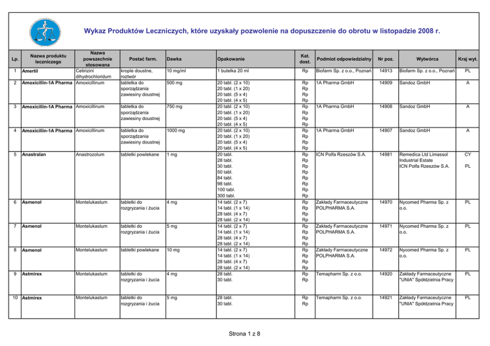 Wykaz Produktów Leczniczych, które uzyskały pozwolenie na dopuszczenie do obrotu w listopadzie 2008 r. BÓ O ODUKTÓ JI PR W AC LE TR C ES I PRODUKT ÓW CH NY BI CZ Y YROBÓW CH W ME ZY IC D ZN JCZ YCH URZ ĄD RE J 2 Nazwa powszechnie stosowana Cetirizini Amertil dihydrochloridum Amoxicillin-1A Pharma Amoxicillinum 3 Amoxicillin-1A Pharma Amoxicillinum tabletka do sporządzania zawiesiny doustnej 750 mg 4 Amoxicillin-1A Pharma Amoxicillinum tabletka do sporządzania zawiesiny doustnej 1000 mg 5 Anastralan Anastrozolum tabletki powlekane 1 mg Lp. 1 Nazwa produktu leczniczego Postać farm. Kat. dost. Podmiot odpowiedzialny Nr poz. Wytwórca Kraj wyt. 1 butelka 20 ml Rp Biofarm Sp. z o.o., Poznań 14913 Biofarm Sp. z o.o., Poznań PL 20 tabl. (2 x 10) 20 tabl. (1 x 20) 20 tabl. (5 x 4) 20 tabl. (4 x 5) 20 tabl. (2 x 10) 20 tabl. (1 x 20) 20 tabl. (5 x 4) 20 tabl. (4 x 5) 20 tabl. (2 x 10) 20 tabl. (1 x 20) 20 tabl. (5 x 4) 20 tabl. (4 x 5) 20 tabl. 28 tabl. 30 tabl. 50 tabl. 84 tabl. 98 tabl. 100 tabl. 300 tabl. 14 tabl. (2 x 7) 14 tabl. (1 x 14) 28 tabl. (4 x 7) 28 tabl. (2 x 14) 14 tabl. (2 x 7) 14 tabl. (1 x 14) 28 tabl. (4 x 7) 28 tabl. (2 x 14) 14 tabl. (2 x 7) 14 tabl. (1 x 14) 28 tabl. (4 x 7) 28 tabl. (2 x 14) 28 tabl. 30 tabl. Rp Rp Rp Rp Rp Rp Rp Rp Rp Rp Rp Rp Rp Rp Rp Rp Rp Rp Rp Rp Rp Rp Rp Rp Rp Rp Rp Rp Rp Rp Rp Rp Rp Rp 1A Pharma GmbH 14909 Sandoz GmbH A 1A Pharma GmbH 14908 Sandoz GmbH A 1A Pharma GmbH 14907 Sandoz GmbH A ICN Polfa Rzeszów S.A. 14981 Remedica Ltd Limassol Industrial Estate ICN Polfa Rzeszów S.A. CY 28 tabl. 30 tabl. Rp Rp Dawka Opakowanie krople doustne, roztwór tabletka do sporządzania zawiesiny doustnej 10 mg/ml 500 mg 6 Asmenol Montelukastum tabletki do rozgryzania i Ŝucia 4 mg 7 Asmenol Montelukastum tabletki do rozgryzania i Ŝucia 5 mg 8 Asmenol Montelukastum tabletki powlekane 10 mg 9 Astmirex Montelukastum tabletki do rozgryzania i Ŝucia 4 mg 10 Astmirex Montelukastum tabletki do rozgryzania i Ŝucia 5 mg Strona 1 z 8 PL Zakłady Farmaceutyczne POLPHARMA S.A. 14970 Nycomed Pharma Sp. z o.o. PL Zakłady Farmaceutyczne POLPHARMA S.A. 14971 Nycomed Pharma Sp. z o.o. PL Zakłady Farmaceutyczne POLPHARMA S.A. 14972 Nycomed Pharma Sp. z o.o. PL Temapharm Sp. z o.o. 14920 Zakłady Farmaceutyczne "UNIA" Spółdzielnia Pracy PL Temapharm Sp. z o.o. 14921 Zakłady Farmaceutyczne "UNIA" Spółdzielnia Pracy PL Lp. Nazwa produktu leczniczego 11 Astmirex Nazwa powszechnie stosowana Montelukastum Postać farm. Dawka Opakowanie tabletki powlekane 10 mg 28 tabl. 30 tabl. koncentrat do sporządzania roztworu do infuzji 10 mg/ml 1 fiol. 5 ml 1 fiol. 15 ml 1 fiol. 45 ml 1 fiol. 60 ml 10 tabl. 20 tabl. 30 tabl. 30 tabl. 90 tabl. 12 Carboplatin BMM Pharma Carboplatinum 13 Celaskon o smaku mandarynkowym Acidum ascorbicum tabletki musujące 14 Co-Prestarium Perindoprilum argininum + Amlodipinum 15 Co-Prestarium 16 Co-Prestarium 17 Co-Prestarium Perindoprilum argininum + Amlodipinum Perindoprilum argininum + Amlodipinum Perindoprilum argininum + Amlodipinum tabletki tabletki tabletki tabletki 0,5 g 5 mg + 5 mg 5 mg + 10 mg 10 mg + 5 mg 10 mg + 10 mg 30 tabl. 90 tabl. 30 tabl. 90 tabl. 30 tabl. 90 tabl. Strona 2 z 8 Kat. dost. Rp Rp Lz Lz Lz Lz OTC OTC OTC Rp Rp Rp Rp Rp Rp Rp Rp Podmiot odpowiedzialny Nr poz. Wytwórca Kraj wyt. Temapharm Sp. z o.o. 14922 Zakłady Farmaceutyczne "UNIA" Spółdzielnia Pracy PL Lefarm Laboratorium Galenowe Sp. z o.o. 14958 BMM PHARMA AB S Zentiva a.s. 14965 Zentiva a.s. Les Laboratoires Servier 14896 Les Laboratoires Servier Industrie Servier (Ireland) Industries Ltd. (SII) ANPHARM Przedsiębiorstwo Farmaceutyczne Spółka Akcyjna Les Laboratoires Servier Les Laboratoires Servier Les Laboratoires Servier 14899 14897 14898 Les Laboratoires Servier Industrie Servier (Ireland) Industries Ltd. (SII) ANPHARM Przedsiębiorstwo Farmaceutyczne Spółka Akcyjna Les Laboratoires Servier Industrie Servier (Ireland) Industries Ltd. (SII) ANPHARM Przedsiębiorstwo Farmaceutyczne Spółka Akcyjna Les Laboratoires Servier Industrie Servier (Ireland) Industries Ltd. (SII) ANPHARM Przedsiębiorstwo Farmaceutyczne Spółka Akcyjna SK F IRL PL F IRL PL F IRL PL F IRL PL 18 Enlaf Nazwa powszechnie stosowana Venlafaxinum 19 Enlaf Lp. Nazwa produktu leczniczego Postać farm. Kat. dost. Dawka Opakowanie tabletki 25 mg 30 tabl. 60 tabl. Rp Rp Teva Pharmaceuticals Polska Sp. z o.o. 14947 Venlafaxinum tabletki 37,5 mg 14948 Venlafaxinum tabletki 50 mg Rp Rp Rp Rp Rp Rp Rp Rp Rp Rp Rp Teva Pharmaceuticals Polska Sp. z o.o. 20 Enlaf 28 tabl. 30 tabl. 50 tabl. 56 tabl. 60 tabl. 100 tabl. 28 tabl. 30 tabl. 56 tabl. 60 tabl. 100 tabl. Teva Pharmaceuticals Polska Sp. z o.o. 14949 21 Enlaf Venlafaxinum tabletki 75 mg Teva Pharmaceuticals Polska Sp. z o.o. 14950 22 Fenta MX 37,5 Fentanylum system transdermalny 37,5 mcg/h Sandoz GmbH 14979 23 Fenta MX 150 Fentanylum system transdermalny 150 mcg/h Sandoz GmbH 14980 HEXAL AG D 24 Ibuprofen Aflofarm Ibuprofenum tabletki draŜowane 400 mg Rp Rp Rp Rp Rp Rp Rpw Rpw Rpw Rpw Rpw Rpw OTC OTC Teva Sante SA Teva UK Ltd. Teva Pharmaceutical Works Private Limited Company Pharmachemie B.V. Teva Sante SA Teva UK Ltd. Pharmachemie B.V. Teva Pharmaceutical Works Private Limited Company Teva Sante SA Teva UK Ltd. Pharmachemie B.V. Teva Pharmaceutical Works Private Limited Company Teva Sante SA Teva UK Ltd. Pharmachemie B.V. Teva Pharmaceutical Works Private Limited Company HEXAL AG Aflofarm Fabryka Leków Sp. z o.o. 14906 Aflofarm Fabryka Leków Sp. z o.o. PL 25 Ladybon Tibolonum tabletki 2,5 mg 26 Letrozol Teva Letrozolum tabletki powlekane 2,5 mg 28 tabl. 30 tabl. 50 tabl. 56 tabl. 60 tabl. 100 tabl. 5 plastrów 10 plastrów 20 plastrów 5 plastrów 10 plastrów 20 plastrów 10 tabl. 20 tabl. 27 Milukante Montelukastum tabletki do rozgryzania i Ŝucia 4 mg 28 tabl. 84 tabl. 10 tabl. 30 tabl. 60 tabl. 90 tabl. 100 tabl. 28 tabl. 28 Milukante Montelukastum tabletki do rozgryzania i Ŝucia 5 mg 28 tabl. Strona 3 z 8 Podmiot odpowiedzi