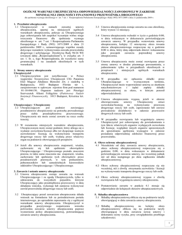 OGÓLNE WARUNKI UBEZPIECZENIA ODPOWIEDZIALNOŚCI ZAWODOWEJ W ZAKRESIE MINIMALNEJ ZDOLNOŚCI FINANSOWEJ PRZEWOŹNIKA DROGOWEGO dla spełnienia wymogu określonego w art. 7 ust. 1 Rozporządzenia Parlamentu Europejskiego i Rady (WE) 1071/2009 z dnia 21 października 2009 r. 1. Przedmiot ubezpieczenia 1.1 Ubezpieczyciel w ramach zawartej umowy ubezpieczenia, opartej na niniejszych ogólnych warunkach ubezpieczenia, pokryje za Ubezpieczonego jego zobowiązania lub zaspokoi wysunięte wobec niego roszczenia finansowe dla spełnienia wymogu określonego w art. 7 ust. 1 Rozporządzenia Parlamentu Europejskiego i Rady (WE) 1071/2009 z dnia 21 października 2009 r., ustanawiającego wspólne zasady dotyczące warunków wykonywania zawodu przewoźnika drogowego i uchylającego Dyrektywę Rady 96/26 WE (zwanym dalej „Rozporządzeniem”), w związku art. 3 ust. 1. lit. c, tego Rozporządzenia, do wysokości sumy gwarancyjnej i na zasadach określonych w tych warunkach. 2. Strony umowy ubezpieczenia Ubezpieczyciel 2.1 Ubezpieczycielem jest notyfikowane w Polsce węgierskie Towarzystwo Ubezpieczeń CIG Pannónia Első Magyar Általános Biztosító Zrt. z siedzibą w Budapeszcie, 1033 Budapest Flórián tér 1, zarejestrowane w sądowym rejestrze firm pod numerem 01-10-046150. Organem nadzoru jest Pénzügyi Szervezetek Állami Felügylete (Państwowy Nadzór Instytucji Finansowych), 1013 Budapest, Krisztina krt. 39. Ubezpieczający / Ubezpieczony 2.2 Ubezpieczającym jest podmiot zawierający przedmiotowe ubezpieczenie na potrzebę prowadzonego przez siebie przedsiębiorstwa przewozowego. Ubezpieczenie nie może zostać zawarte na rzecz osoby trzeciej. 2.3 W rozumieniu niniejszych warunków ubezpieczenia, Ubezpieczonym może zostać podmiot, który ubiega się o wydanie zezwolenia/licencji albo też dysponuje ważnym zezwoleniem/ licencją na wykonywanie transportu drogowego rzeczy lub osób, wydaną przez właściwy organ na podstawie obowiązujących przepisów. 2.4 Jeżeli dla umowy ubezpieczenia znajomość, wiedza, zachowanie się lub spełnienie obowiązków Ubezpieczającego / Ubezpieczonego posiada znaczenie prawne, to takie samo znaczenie ma znajomość, wiedza, zachowanie lub spełnienie tych obowiązków przez przedstawicieli prawnych, w tym prokurentów, pełnomocników lub samodzielnych kierowników oddziałów Ubezpieczającego / Ubezpieczonego. 3. Zawarcie i ustanie umowy ubezpieczenia 3.1 Umowa ubezpieczenia zostaje zawarta na wniosek Ubezpieczającego i za zgodą Ubezpieczyciela, tylko w odniesieniu do wszystkich pojazdów, którymi Ubezpieczający jako przedsiębiorca przewozowy w dniu składania wniosku, wykonuje lub zamierza wykonywać zawód przewoźnika drogowego rzeczy lub osób. 3.2 Ubezpieczający przed zawarciem ubezpieczenia składa wniosek na formularzu lub za pośrednictwem portalu internetowego, po uprzednim zapoznaniu się z ogólnymi warunkami umowy ubezpieczenia. Ubezpieczyciel w przypadku pozytywnego rozpatrzenia wniosku potwierdza zawarcie umowy ubezpieczenia poprzez wystawienie polisy ubezpieczeniowej, potwierdzającej zawarcie umowy ubezpieczenia. 3.3 Umowa ubezpieczenia zostaje zawarta na czas określony, który wynosi 12 miesięcy. 3.4 Umowa ubezpieczenia wchodzi w życie o godzinie 0:00, w dniu wskazanym w dokumencie potwierdzającym zawarcie umowy. W przypadku wznowienia umowy ubezpieczenia, kolejny 12 miesięczny okres trwania okresu ubezpieczeniowego rozpoczyna się o godzinie 0:00 w dniu, który datą odpowiada dniowi wskazanemu jako początek zawarcia poprzedniej umowy ubezpieczenia. 3.5 Umowa ubezpieczenia może zostać rozwiązana przez strony umowy w drodze pisemnego porozumienia, a jednostronnie tylko w przypadkach określonych w przepisach i niniejszych ogólnych warunkach ubezpieczenia. 3.6 W przypadku nie opłacenia składki przez Ubezpieczającego w wyznaczonym terminie, Ubezpieczyciel może wypowiedzieć umowę ze skutkiem natychmiastowym i żądać zapłaty składki ubezpieczeniowej za okres, w którym ponosił odpowiedzialność. 3.7 Umowa ubezpieczenia wygasa, jeżeli w okresie obowiązywania umowy Ubezpieczony utraci zezwolenie/licencję na wykonywanie przewozu drogowego rzeczy lub osób, zaprzestanie lub zawiesi prowadzenie działalności w zakresie przewozów drogowych rzeczy lub osób. 3.8 W przypadku rozwiązania lub wygaśnięcia umowy Ubezpieczyciel jest zobowiązany do powiadomienia o tym fakcie właściwych organów wydających zezwolenia lub licencje, względnie innych organów uprawnionych do sprawdzania spełnienia wymogów w zakresie posiadania odpowiedniej zdolności finansowej przez przewoźnika. 4. Okres ochrony ubezpieczeniowej 4.1 Niezależnie od daty zawarcia umowy ubezpieczenia, okres ochrony ubezpieczeniowej rozpoczyna się o godzinie 0:00, w dniu wskazanym w dokumencie potwierdzającym zawarcie umowy, nie wcześniej jednak niż od dnia następnego po dniu zapłacenia składki ubezpieczeniowej. 4.2 Okres ochrony ubezpieczeniowej rozpoczyna się nie wcześniej, niż z chwilą otrzymania zezwolenia / licencji na wykonywanie transportu drogowego rzeczy lub osób. 4.3 Okres ochrony ubezpieczeniowej wygasa z chwilą rozwiązania lub wygaśnięcia umowy ubezpieczenia. 4.4 Postanowienie zawarte w punkcie 4.1 stosuje się odpowiednio do kolejnych okresów ubezpieczeniowych. 5. Składka ubezpieczeniowa 5.1 Składkę ubezpieczeniową oblicza się na podstawie taryfy obowiązującej w dniu zawarcia umowy ubezpieczenia. 5.2 Składkę ubezpieczeniową na kolejny okres ubezpieczeniowy oblicza się na podstawie taryfy obowiązującej w dniu zawarcia nowej umowy i dokonaniu oceny ryzyka, przy uwzględnieniu przebiegu szkodowości. 1 5.3 Składka ubezpieczeniowa jest zwolniona z podatku VAT i nie zawiera podatku od ubezpieczeń. Ewentualne wprowadzenie takiego obowiązku podatkowego obciąży Ubezpieczającego. 5.4 Termin zapłaty składki ubezpieczeniowej przypada w przeddzień rozpoczęcia okresu ochrony ubezpieczeniowej. 5.5 Powiększ