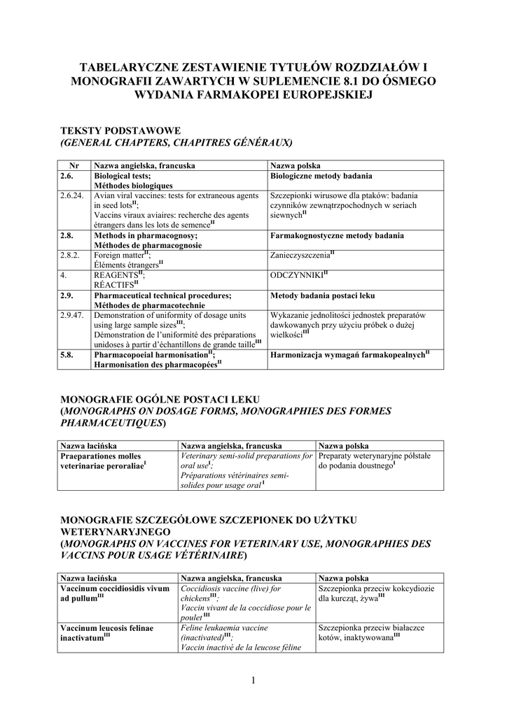 TABELARYCZNE ZESTAWIENIE TYTUŁÓW ROZDZIAŁÓW I MONOGRAFII ZAWARTYCH W SUPLEMENCIE 8.1 DO ÓSMEGO WYDANIA FARMAKOPEI EUROPEJSKIEJ TEKSTY PODSTAWOWE (GENERAL CHAPTERS, CHAPITRES GÉNÉRAUX) Nr 2.6. 2.6.24. 2.8. 2.8.2. 4. 2.9. 2.9.47. 5.8. Nazwa angielska, francuska Biological tests; Méthodes biologiques Avian viral vaccines: tests for extraneous agents in seed lotsII; Vaccins viraux aviaires: recherche des agents étrangers dans les lots de semenceII Methods in pharmacognosy; Méthodes de pharmacognosie Foreign matterII; Éléments étrangersII REAGENTSII; RÉACTIFSII Pharmaceutical technical procedures; Méthodes de pharmacotechnie Demonstration of uniformity of dosage units using large sample sizesIII; Démonstration de l’uniformité des préparations unidoses à partir d’échantillons de grande tailleIII Pharmacopoeial harmonisationII; Harmonisation des pharmacopéesII Nazwa polska Biologiczne metody badania Szczepionki wirusowe dla ptaków: badania czynników zewnątrzpochodnych w seriach siewnychII Farmakognostyczne metody badania ZanieczyszczeniaII ODCZYNNIKIII Metody badania postaci leku Wykazanie jednolitości jednostek preparatów dawkowanych przy użyciu próbek o dużej wielkościIII Harmonizacja wymagań farmakopealnychII MONOGRAFIE OGÓLNE POSTACI LEKU (MONOGRAPHS ON DOSAGE FORMS, MONOGRAPHIES DES FORMES PHARMACEUTIQUES) Nazwa łacińska Praeparationes molles veterinariae peroraliaeI Nazwa angielska, francuska Nazwa polska Veterinary semi-solid preparations for Preparaty weterynaryjne półstałe oral useI; do podania doustnegoI Préparations vétérinaires semisolides pour usage oral I MONOGRAFIE SZCZEGÓŁOWE SZCZEPIONEK DO UŻYTKU WETERYNARYJNEGO (MONOGRAPHS ON VACCINES FOR VETERINARY USE, MONOGRAPHIES DES VACCINS POUR USAGE VÉTÉRINAIRE) Nazwa łacińska Vaccinum coccidiosidis vivum ad pullumIII Vaccinum leucosis felinae inactivatumIII Nazwa angielska, francuska Coccidiosis vaccine (live) for chickensIII; Vaccin vivant de la coccidiose pour le poulet III Feline leukaemia vaccine (inactivated)III; Vaccin inactivé de la leucose féline 1 Nazwa polska Szczepionka przeciw kokcydiozie dla kurcząt, żywaIII Szczepionka przeciw białaczce kotów, inaktywowanaIII Vaccinum paramyxoviris 3 aviarii inactivatum ad meleagremIII Avian paramyxovirus 3 vaccine (inactivated) for turkeysIII; Vaccin inactivé du paramyxovirus aviaire 3 pour la dindeIII Szczepionka przeciw paramyksowirusowi (typ 3) ptaków, inaktywowana, dla indykówIII MONOGRAFIE SZCZEGÓŁOWE SUBSTANCJI I PRZETWORÓW ROŚLINNYCH (MONOGRAPHS ON HERBAL DRUGS AND HERBAL DRUG PREPARATIONS, MONOGRAPHIES DES DROGUES VÉGÉTALES ET PRÉPARATIONS À BASE DE DROGUES VÉGÉTALES) Nazwa łacińska Amomi fructus rotundusI Amomi fructusI Cimicifugae rhizomaII Dioscoreae oppositifoliae rhizomaI Hederae foliumII Magnoliae officinalis cortexII Solidaginis herbaII Nazwa angielska, francuska Round amomum fruit I; Amomum (fruit rond d’)I Amomum fruit I; Amomum (fruit d’)I Black cohoshII; Actée à grappesII Dioscorea oppositifolia rhizomeI; Dioscorea oppositifolia (rhizome de)I Ivy leaf II; Lierre (feuille de) II Magnolia officinalis barkII; Magnolia officinalis (écorce de)II Goldenrod II; SolidageII Nazwa polska Owoc kardamomu zaokrąglonyI Owoc kardamomuI Kłącze pluskwicy groniastejII Kłącze pochrzynu chińskiegoI Liść bluszczuII Kora magnolii lekarskiejII Ziele nawłociII MONOGRAFIE PREPARATÓW HOMEOPATYCZNYCH (MONOGRAPHS ON HOMOEOPATHIC PREPARATIONS, MONOGRAPHIES DES PRÉPARATIONS HOMÉOPATHIQUES) Nazwa łacińska Tincturae maternae ad praeparationes homoeopathicasII Nazwa angielska, francuska Mother tinctures for homoeopathic preparationsII; Teintures mères pour préparations homéopathiquesII Nazwa polska Nalewki pierwotne do preparatów homeopatycznychII MONOGRAFIE SZCZEGÓŁOWE (MONOGRAPHS, MONOGRAPHIES) Nazwa łacińska Abacaviri sulfasII AcarbosumII Acidum citricum anhydricumII Acidum citricum monohydricumII Acidum ioxaglicumII Alcohol 2,4-dichlorobenzylicusI Nazwa angielska, francuska Abacavir sulfateII; Abacavir (sulfate d´)II AcarboseII* Citric acid, anhydrousII; Citrique (acide) anhydreII Citric acid monohydrateII; Citrique (acide) monohydratéII Ioxaglic acid II; Ioxaglique (acide) II 2,4-Dichlorobenzyl alcohol I; 2,4-Dichlorobenzylique (alcool)I 2 Nazwa polska Abakawiru siarczanII AkarbozaII Kwas cytrynowy bezwodnyII Kwas cytrynowy jednowodnyII Kwas joksaglynowyII Alkohol 2,4-dichlorobenzylowyI Alcohol cetylicus et stearylicus emulsificans AII Alcohol cetylicus et stearylicus emulsificans BII AripiprazolumI CapecitabinumI CarbimazolumII Cefazolinum natricumII Cellulosi acetas phthalasII Cellulosi acetasII Clemastini fumarasII Dexamethasoni natrii phosphasII Enoxaparinum natricumII Ethanolum (96 per centum) II Ethanolum anhydricumII Flecainidi acetasII Fluticasoni propionasII Follitropini solutio concentrataIII FollitropinumIII GelatinaII Ketotifeni hydrogenofumarasII LamotriginumII Metamizolum natricum monohydricumII Natrii cetylo- et stearylosulfasII Oxytetracyclini hydrochloridumII Pisi amylumII PrednicarbatumII PropanolumIII PropyphenazonumII Quinaprili hydrochloridumII Cetostearyl alcohol (type A), emulsifyingII; Cétostéarylique (alcool) émulsifiant (type A) II Cetostearyl alcohol (type B), emulsifyingII; Cétostéarylique (alcool) émulsifiant (type B) II AripiprazoleI* CapecitabineI; CapécitabineI CarbimazoleII; Carbimazol II Cefazolin sodiumII; Céfazoline sodiqueII Cellulose acetate phthalateII; Cellulose (acétate phtalate de) II Cellulose acetateII; Cellulose (acétate de)II Clemastine fumarateII; Clémastine (fumarate de) II Dexamethasone sodium phosphateII; Dexaméthasone (phosphate sodique de)II Enoxaparin sodiumII; Énoxaparine sodiqueII Ethanol (96 per cent) II; Éthanol à 96 pour cent II Ethanol, anhydrousII; Éthanol anhydreII Flecainide acetateII; Flécaïnide (acétate de)II Fluticasone propionateII; Fluticasone (propionate de)II Follitropin concentrated solutionIII; Follitropine